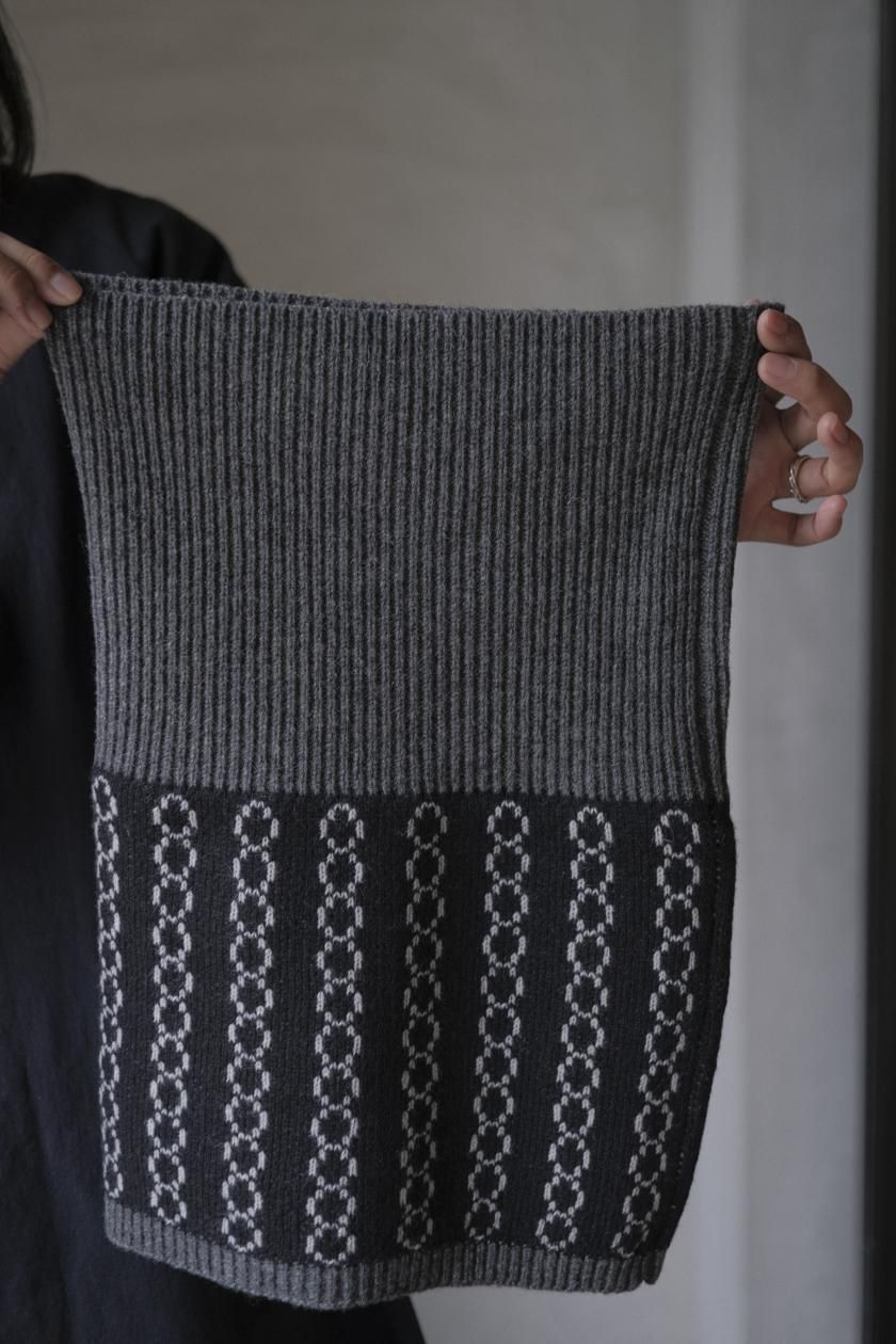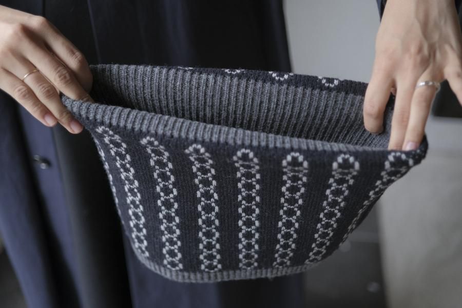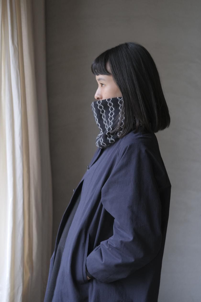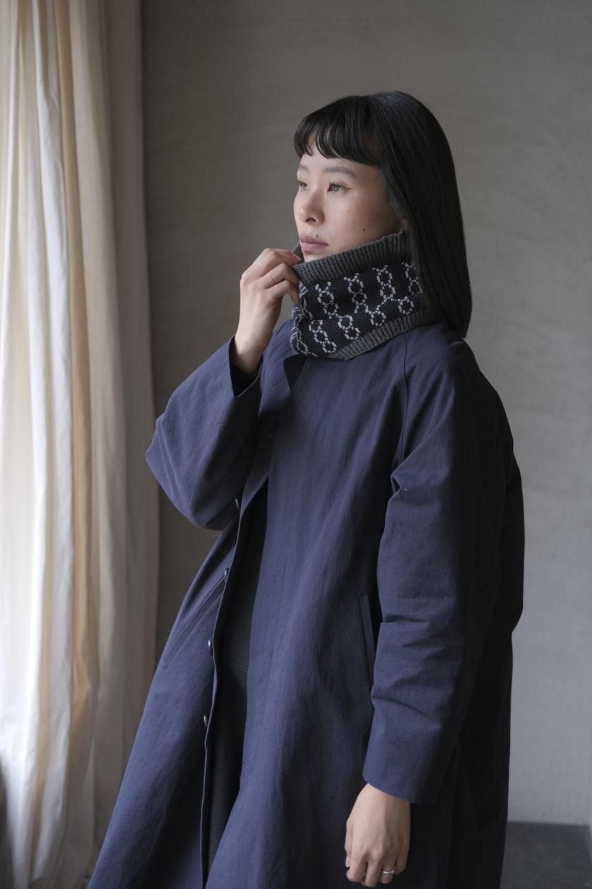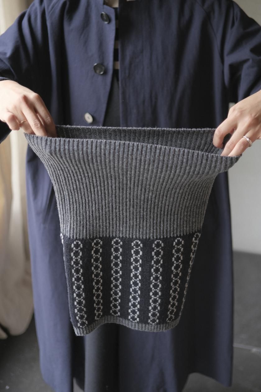 ・リブとジャガードの境目をふたつ折にして、首からかぶる仕様のかわいい防寒アイテムです。