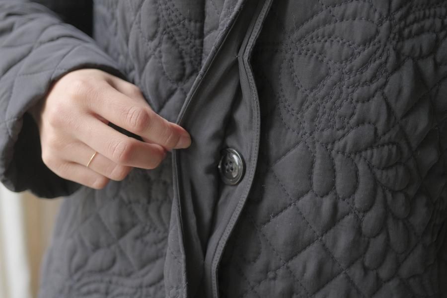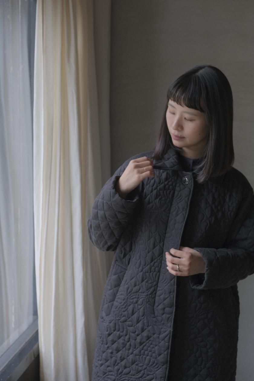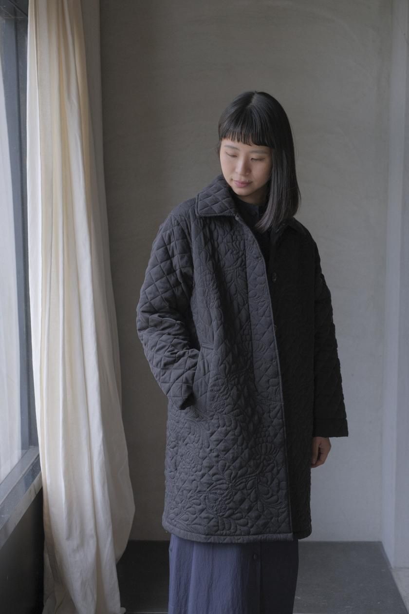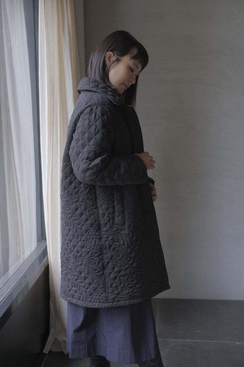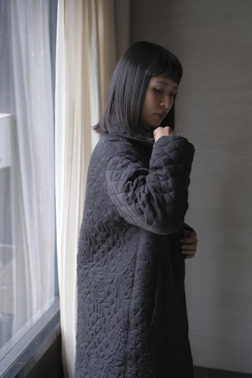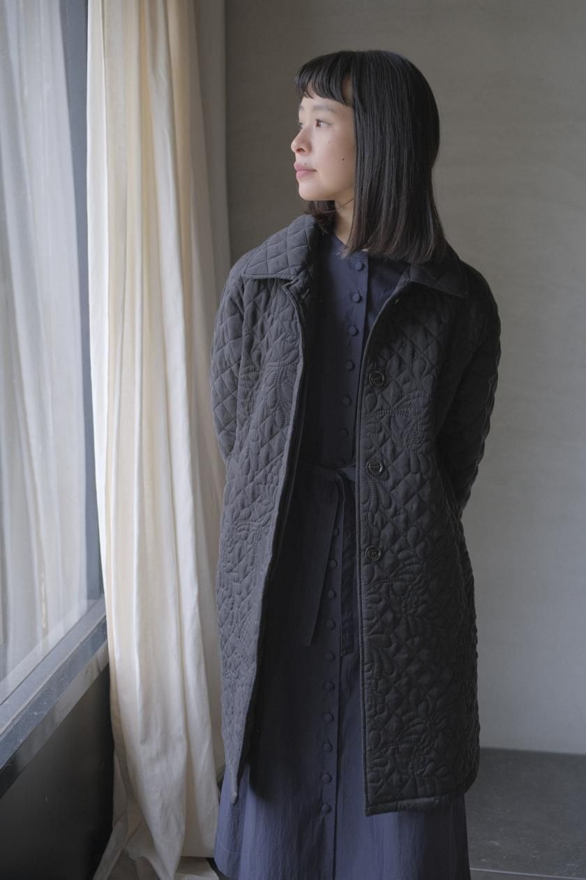 オリジナルの図案で、 キュプラの生地に中わたをサンドして刺繍を施したキルトコートです。