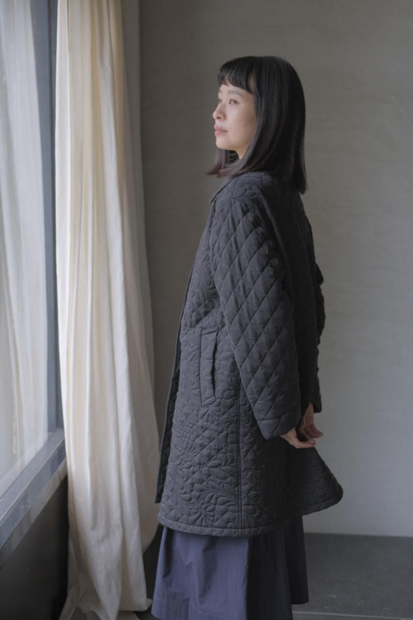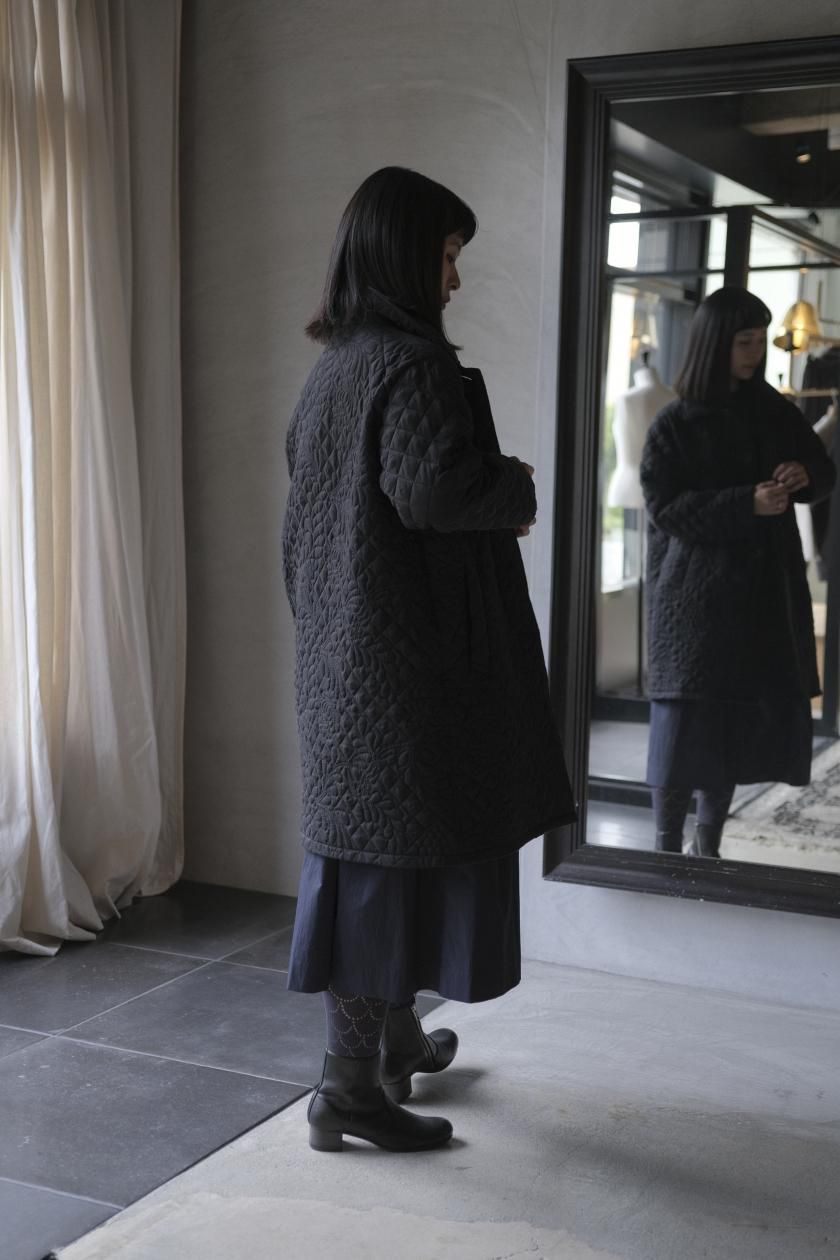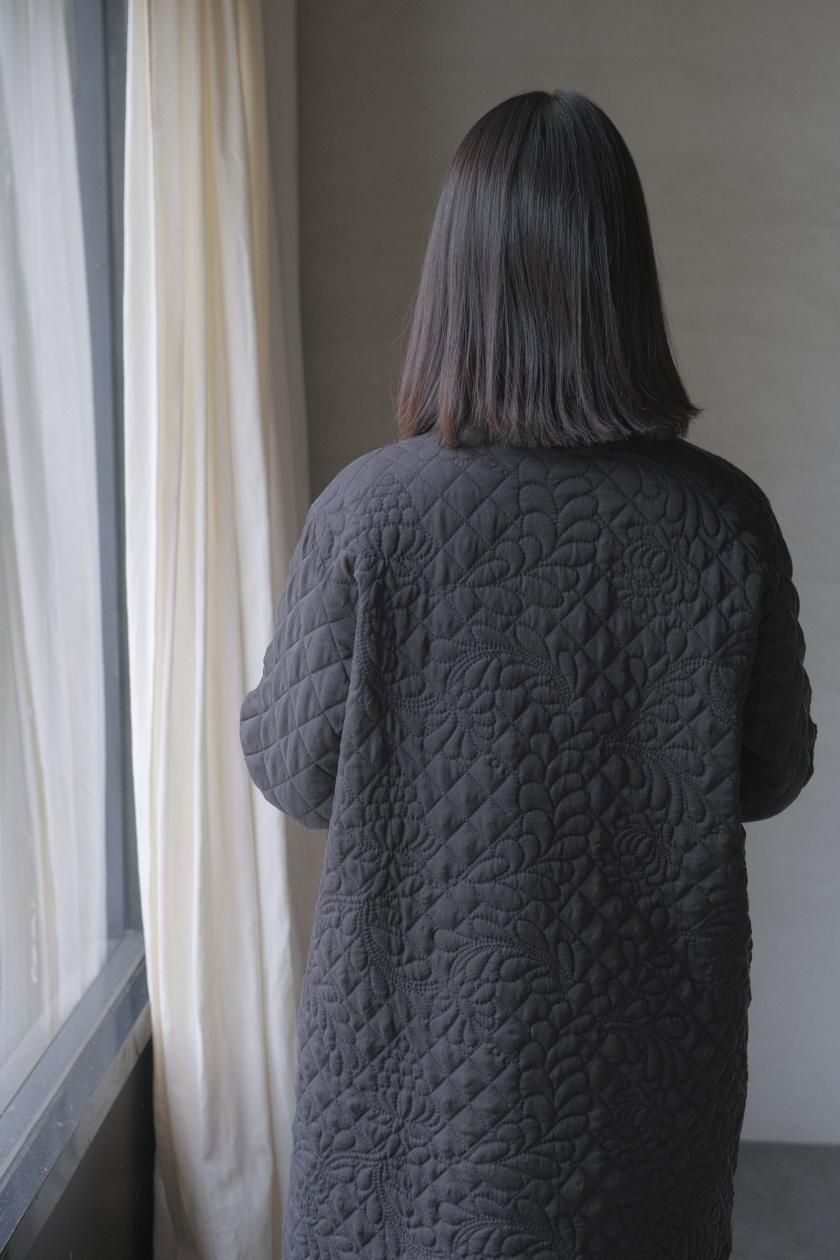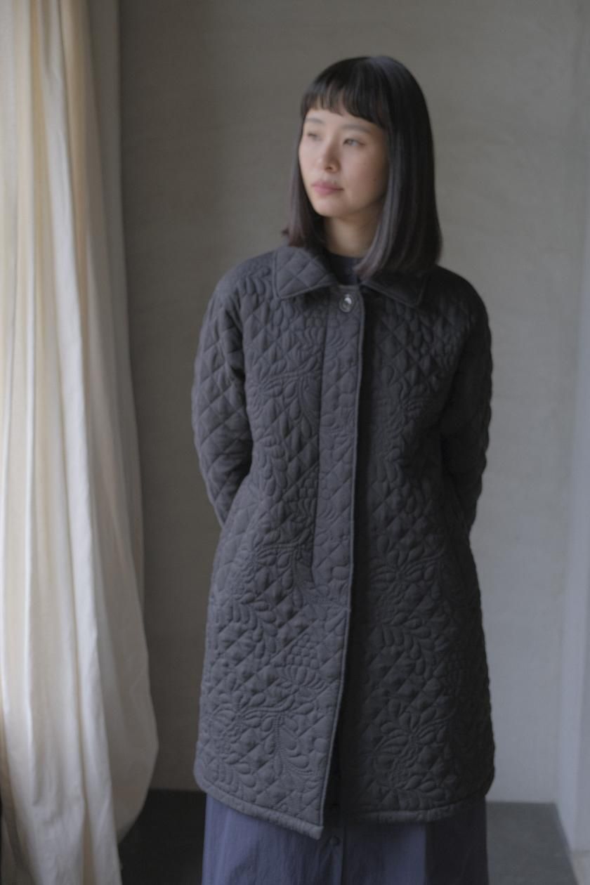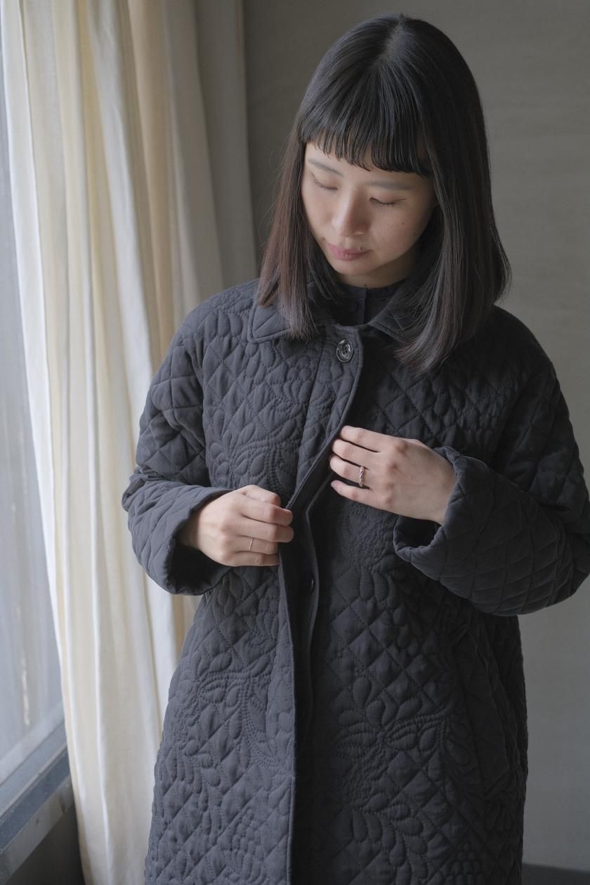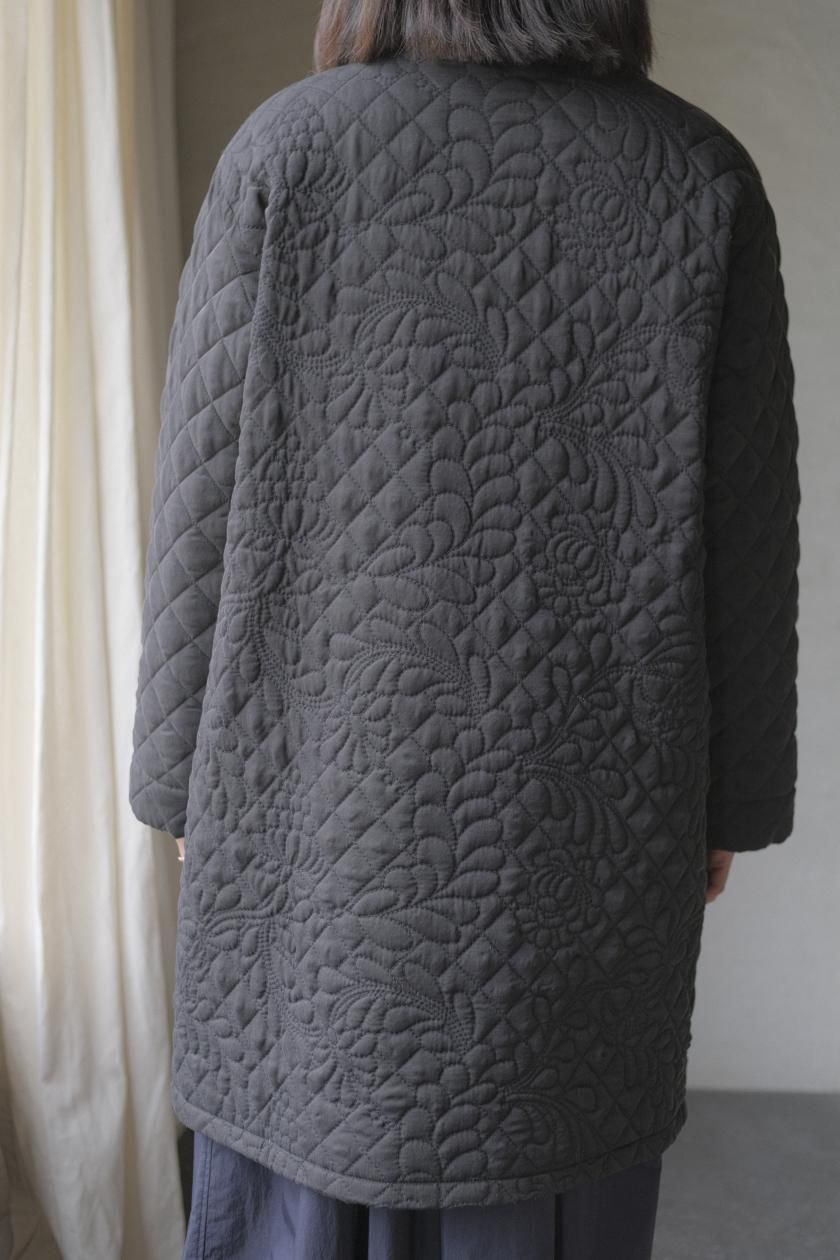 オリジナルの図案で、 キュプラの生地に中わたをサンドして刺繍を施したキルトコートです。