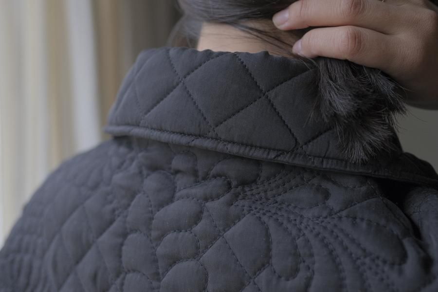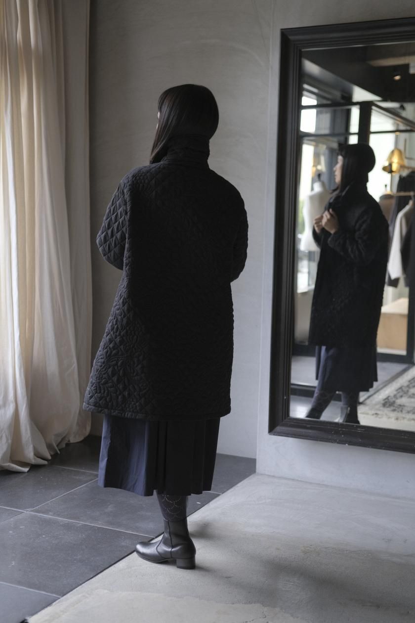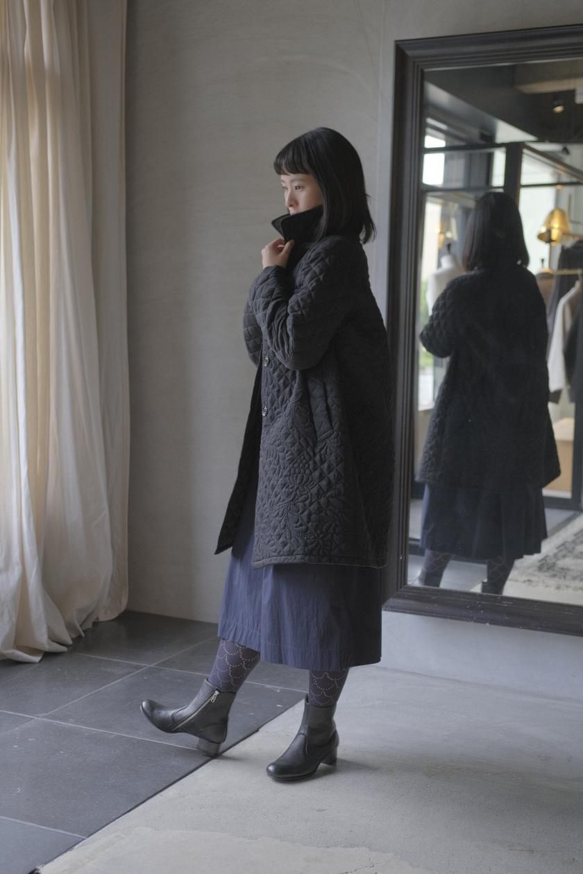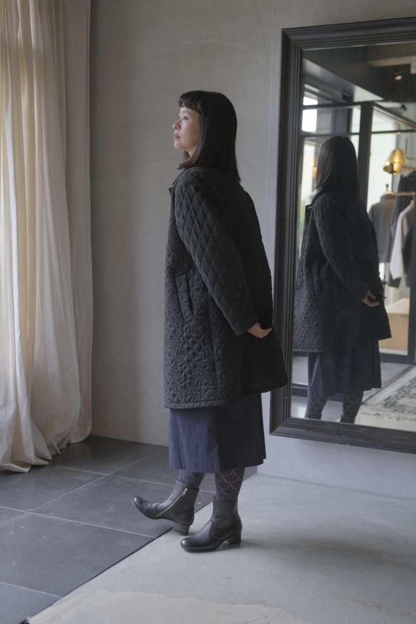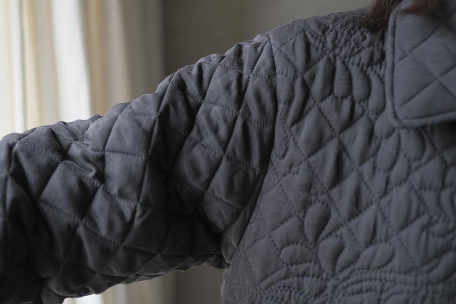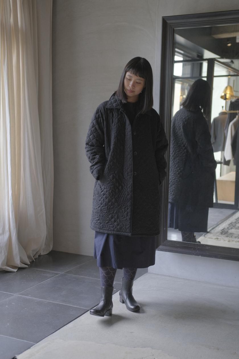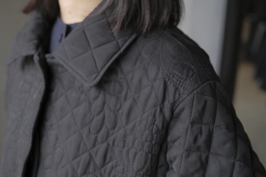 オリジナルの図案で、 キュプラの生地に中わたをサンドして刺繍を施したキルトコートです。