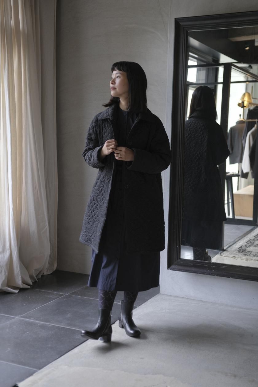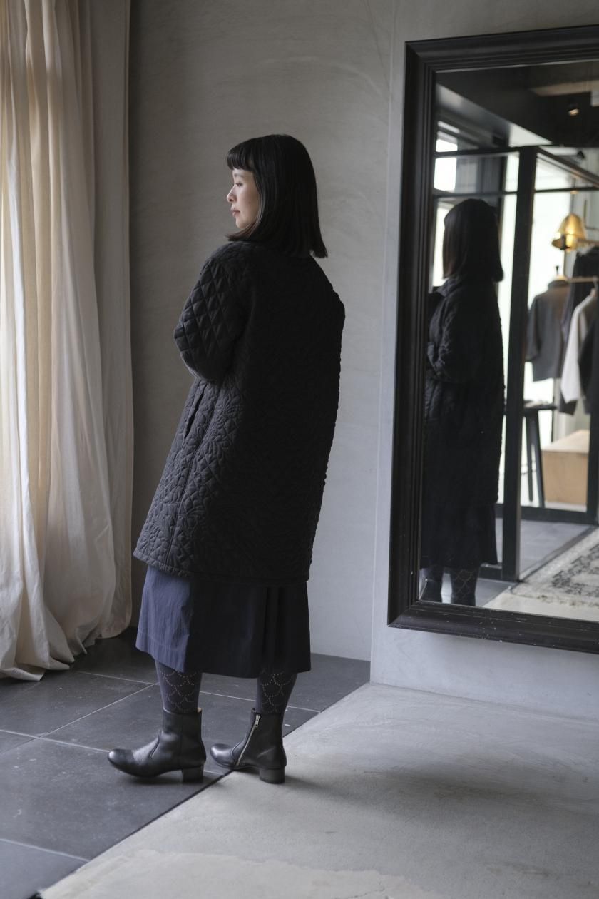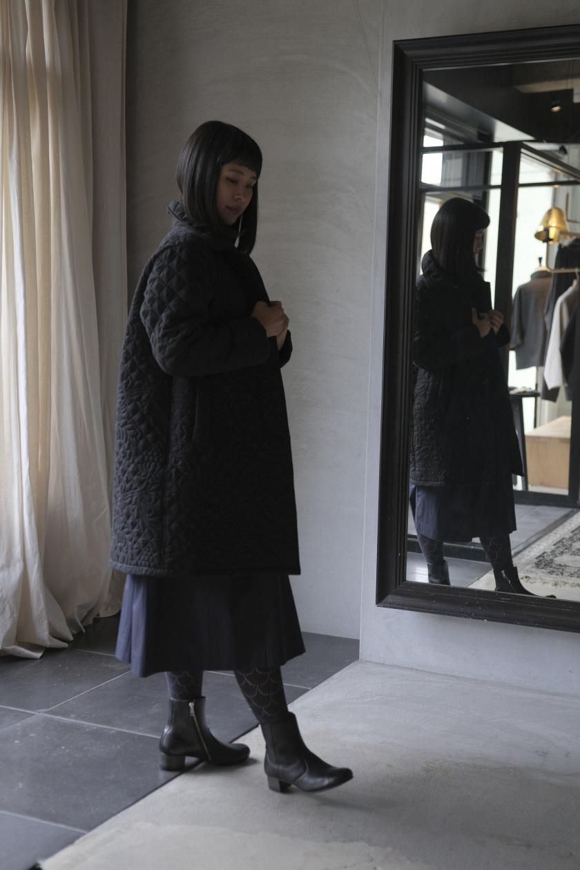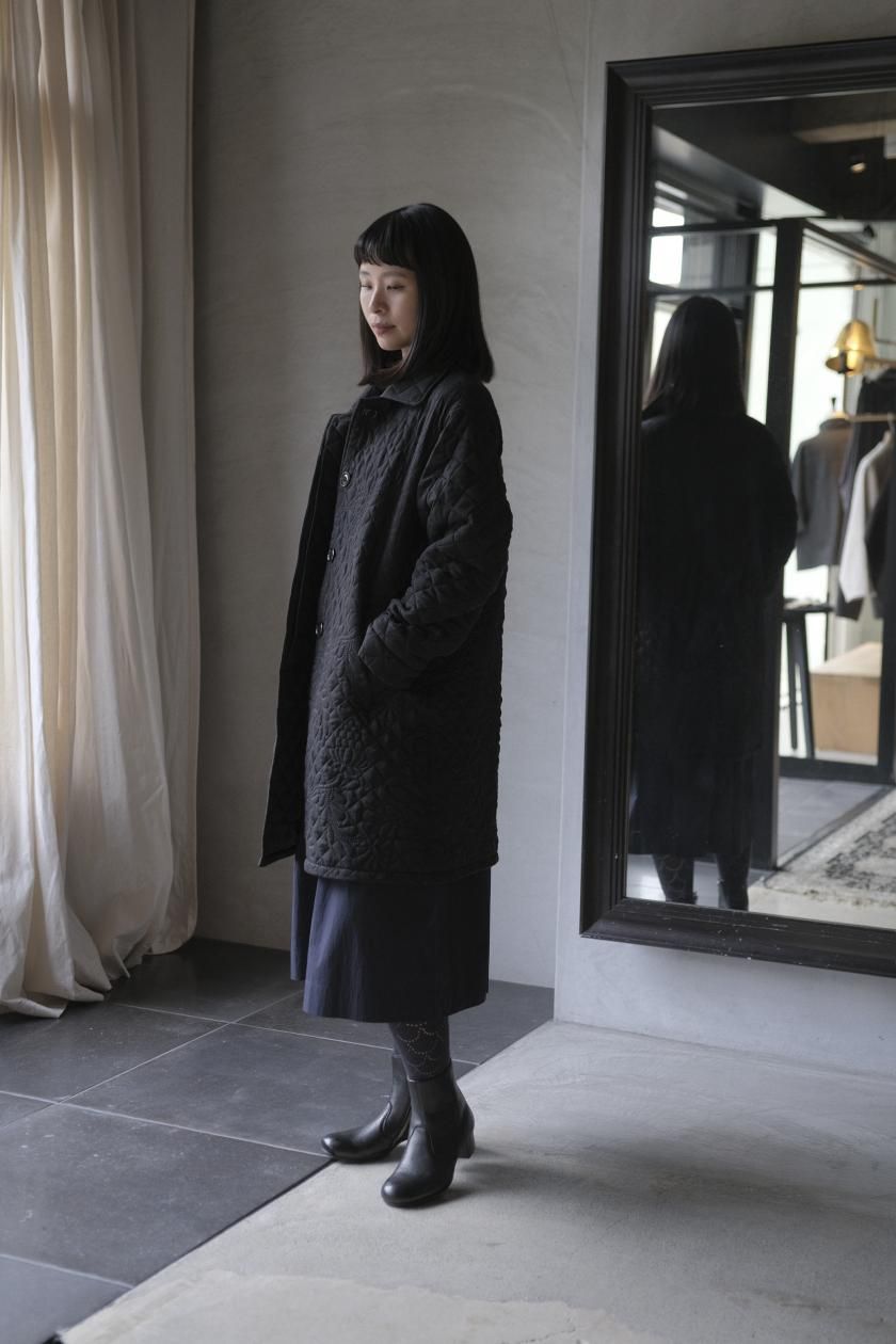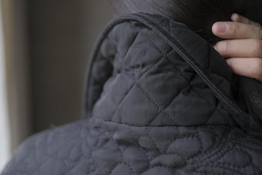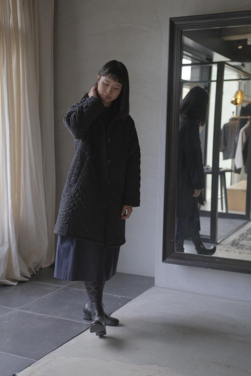 オリジナルの図案で、 キュプラの生地に中わたをサンドして刺繍を施したキルトコートです。