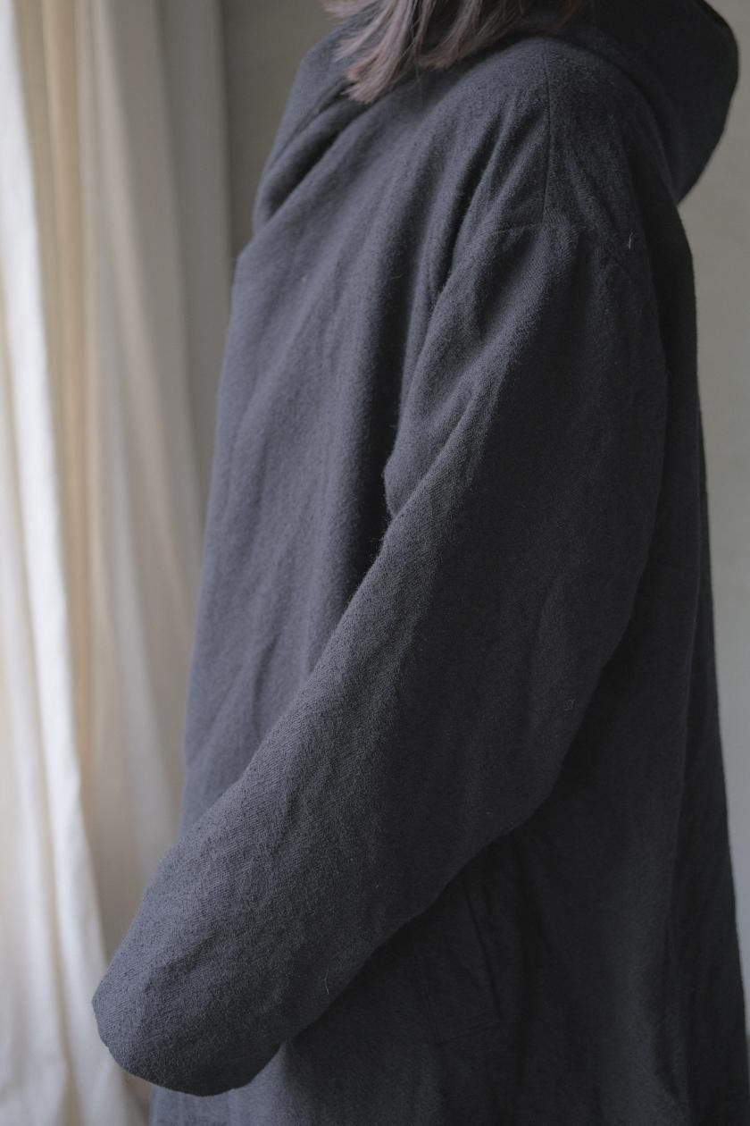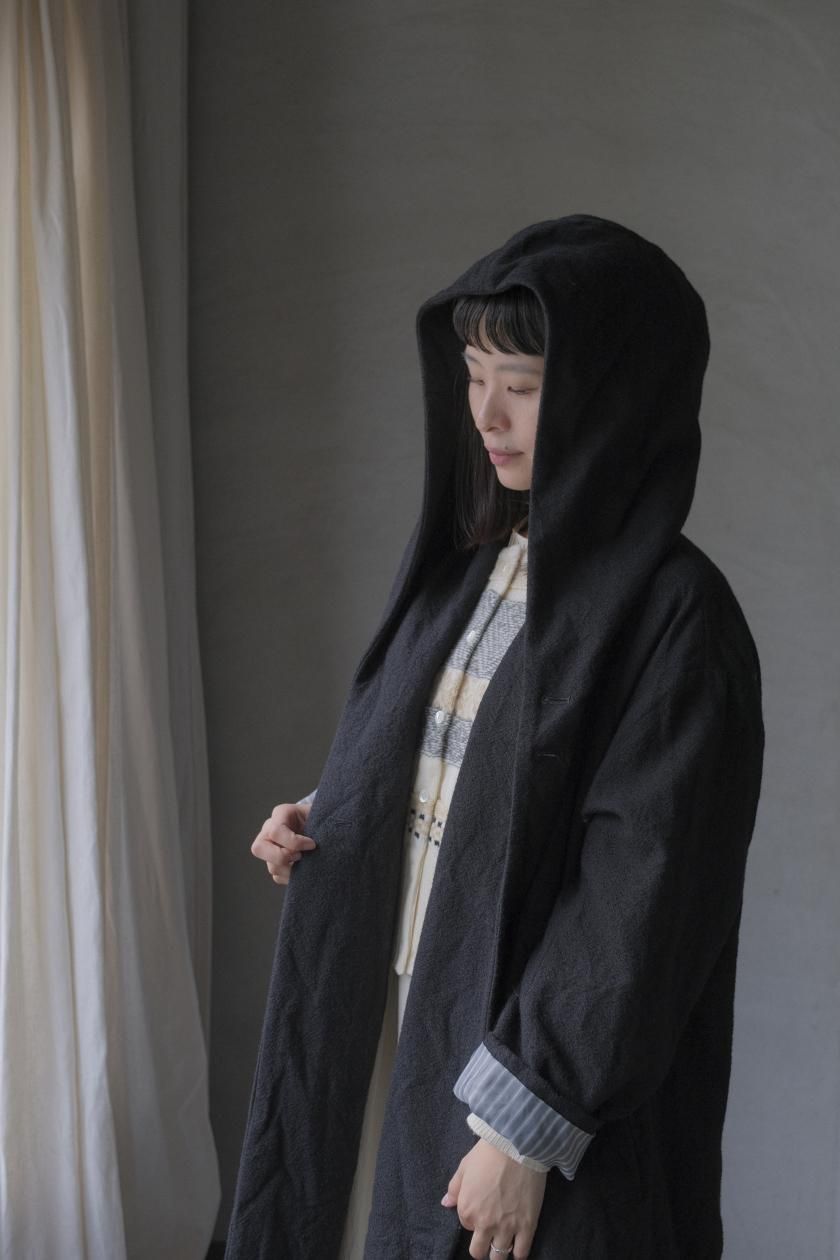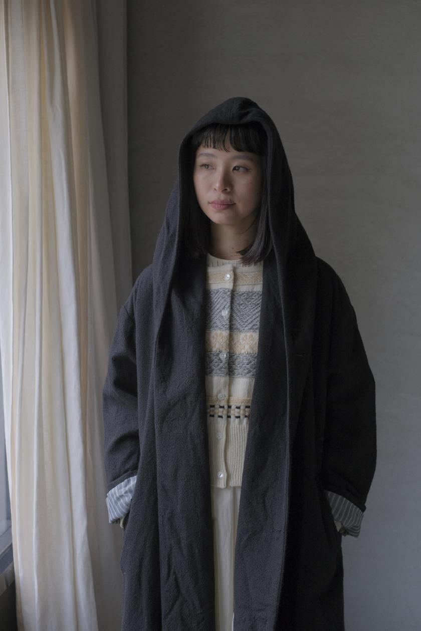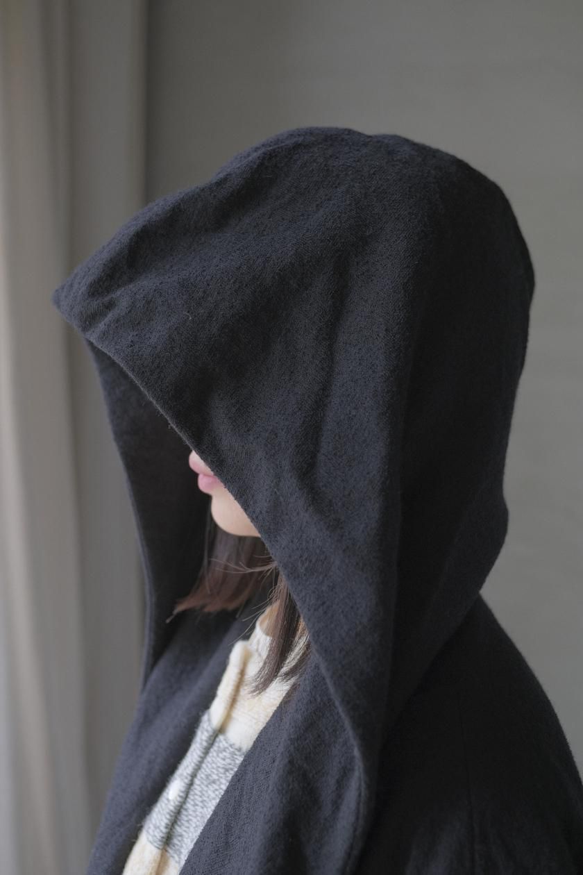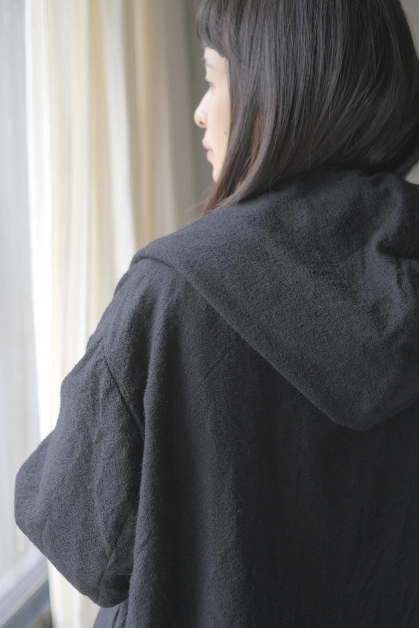 前開きの重なりをたっぷりとり、前身頃をそのまま切り換えなく後ろに回してフードにすることで、首回りも暖かい。