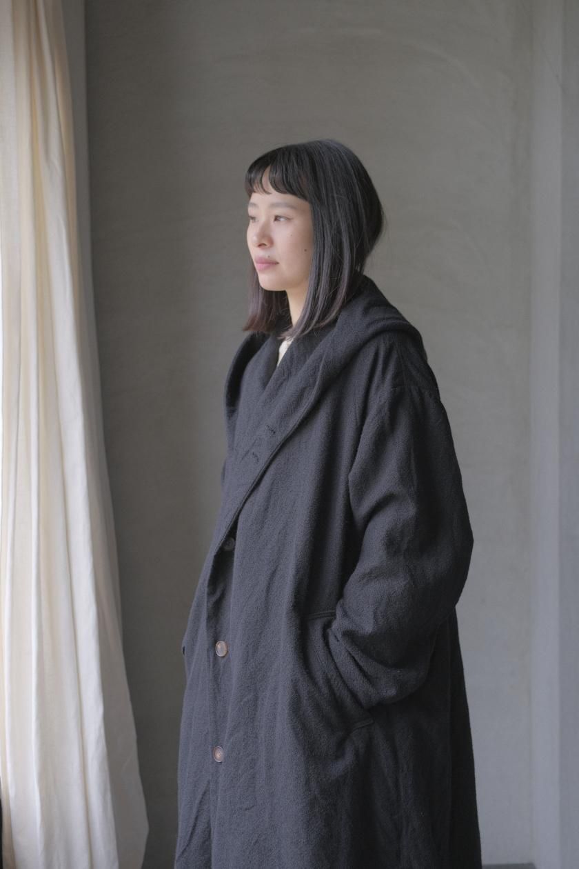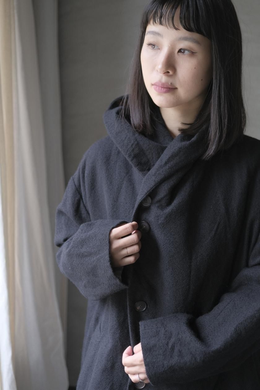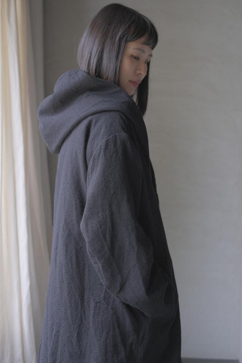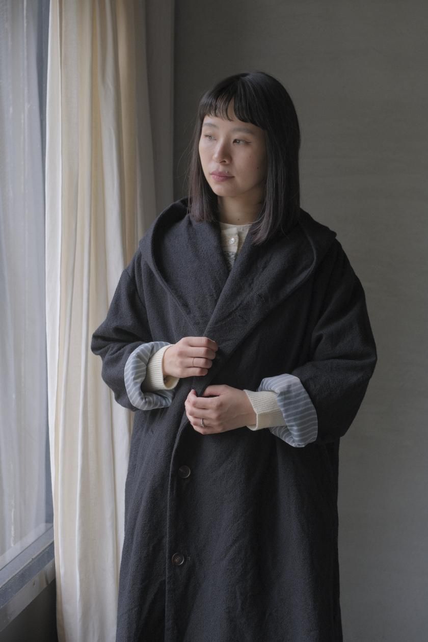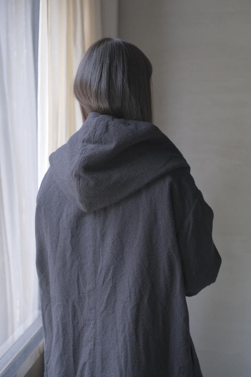 前開きの重なりをたっぷりとり、前身頃をそのまま切り換えなく後ろに回してフードにすることで、首回りも暖かい。