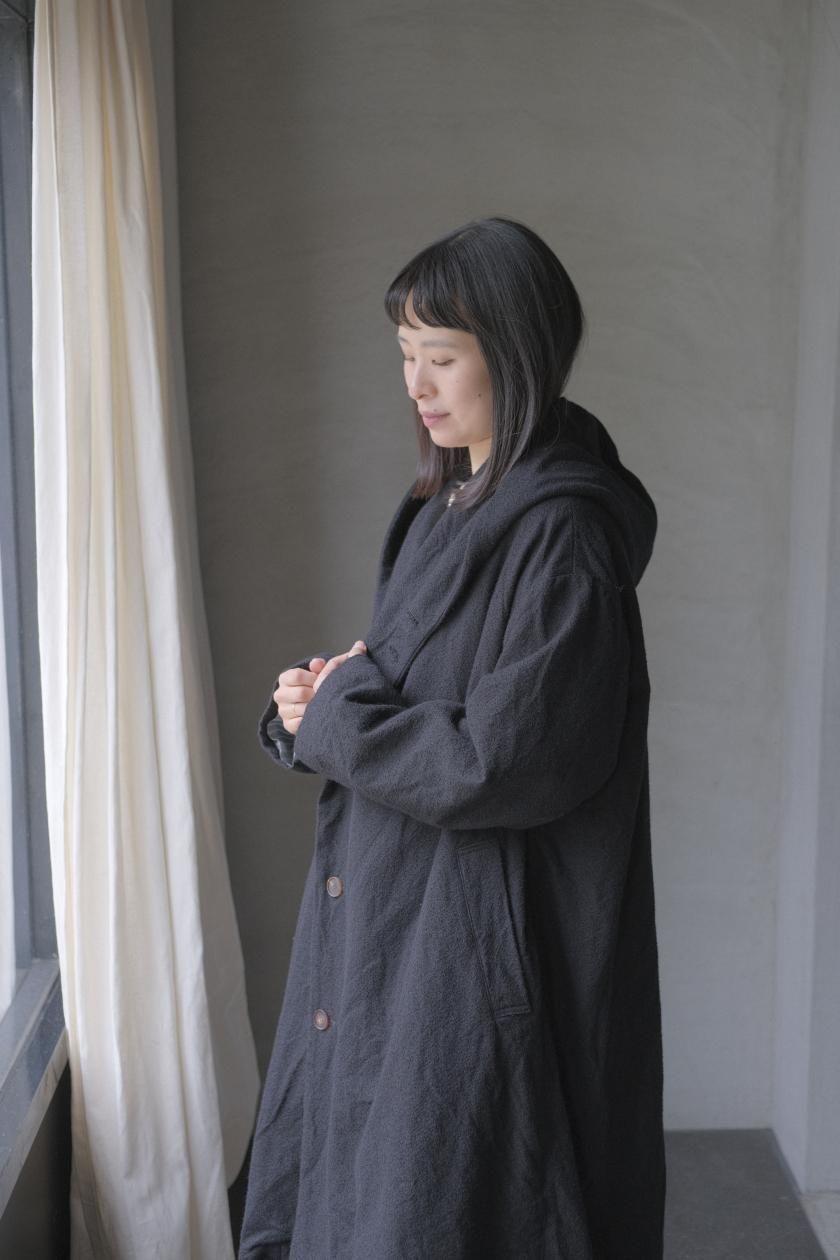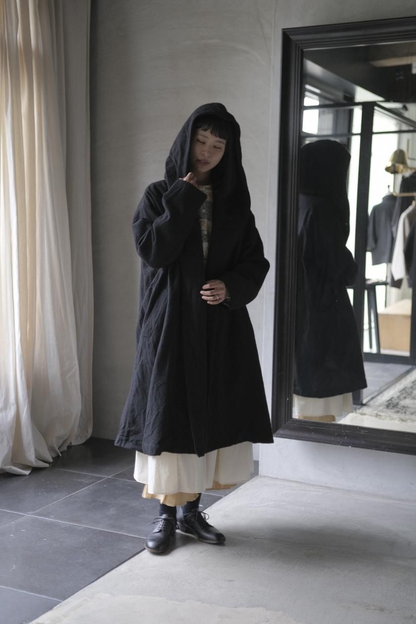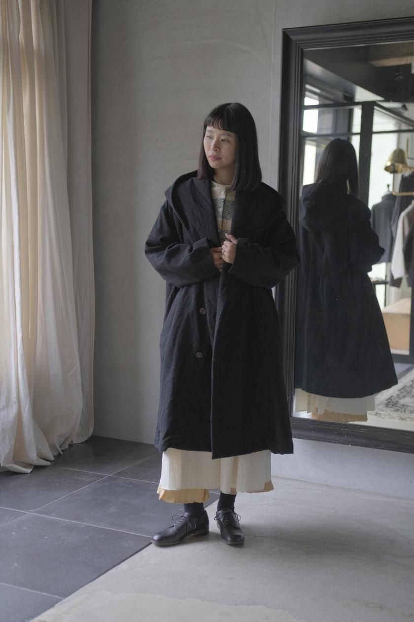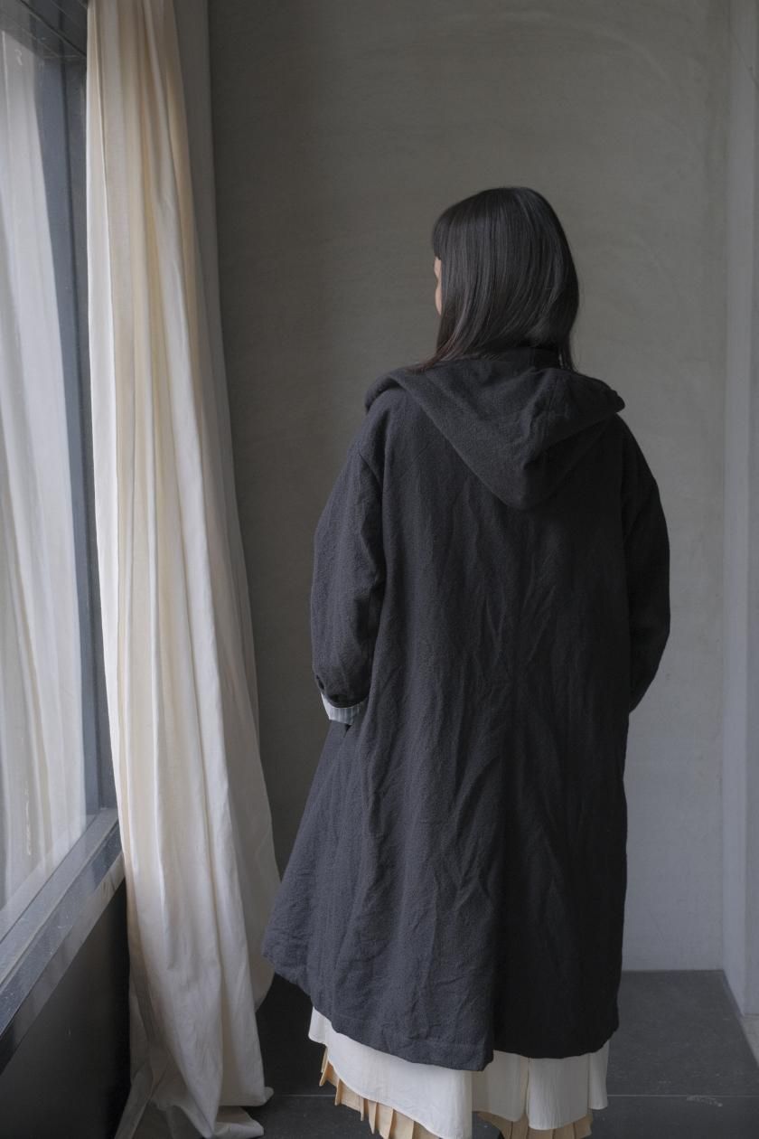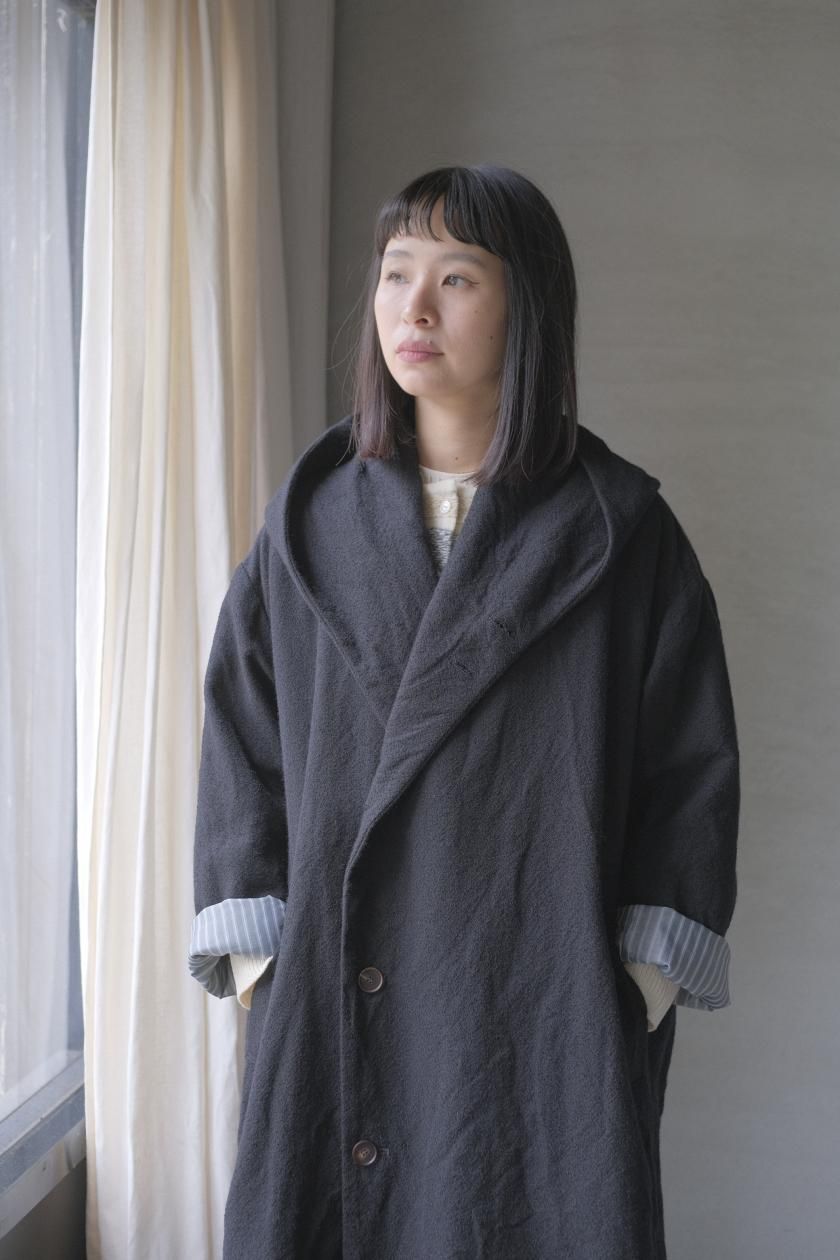 前開きの重なりをたっぷりとり、前身頃をそのまま切り換えなく後ろに回してフードにすることで、首回りも暖かい。