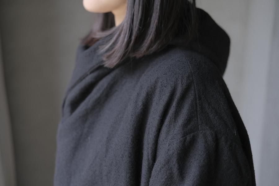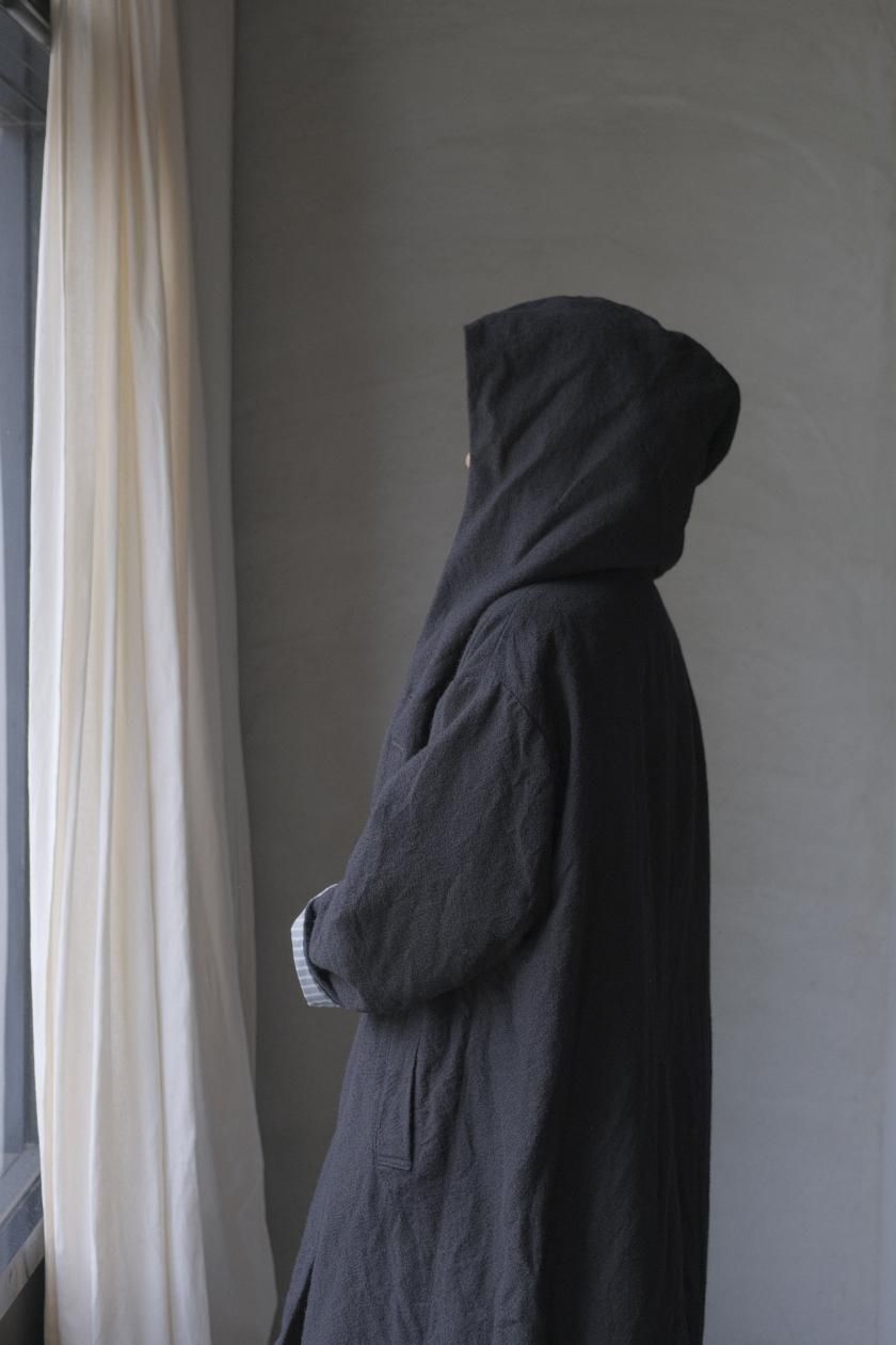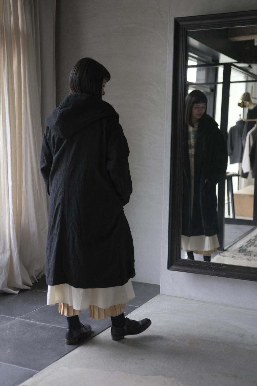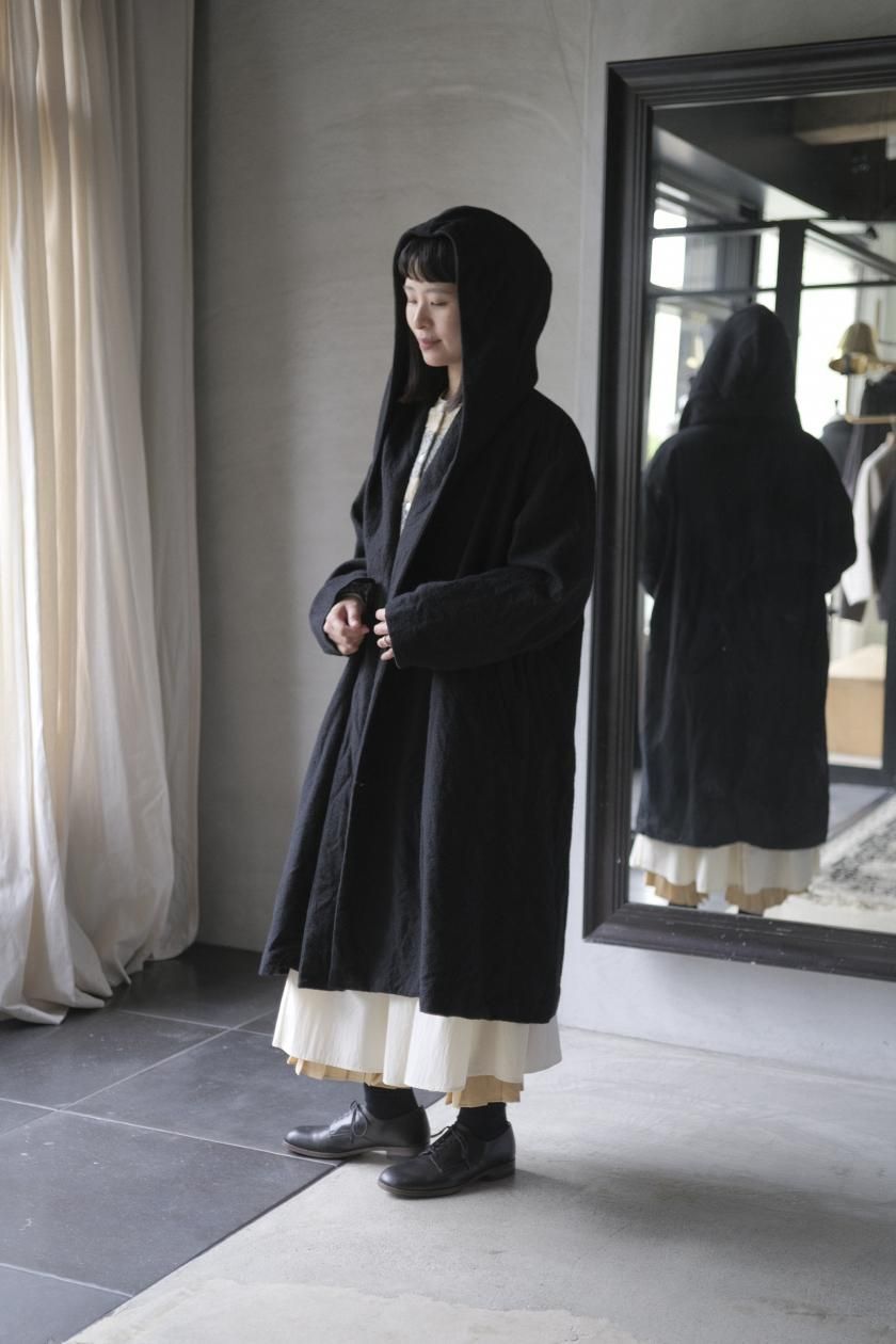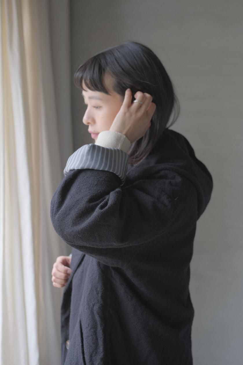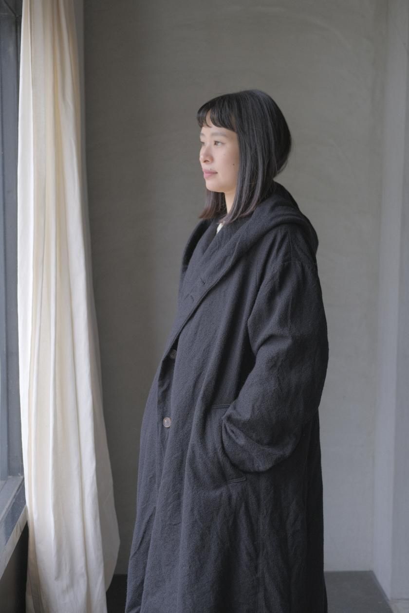 前開きの重なりをたっぷりとり、前身頃をそのまま切り換えなく後ろに回してフードにすることで、首回りも暖かい。