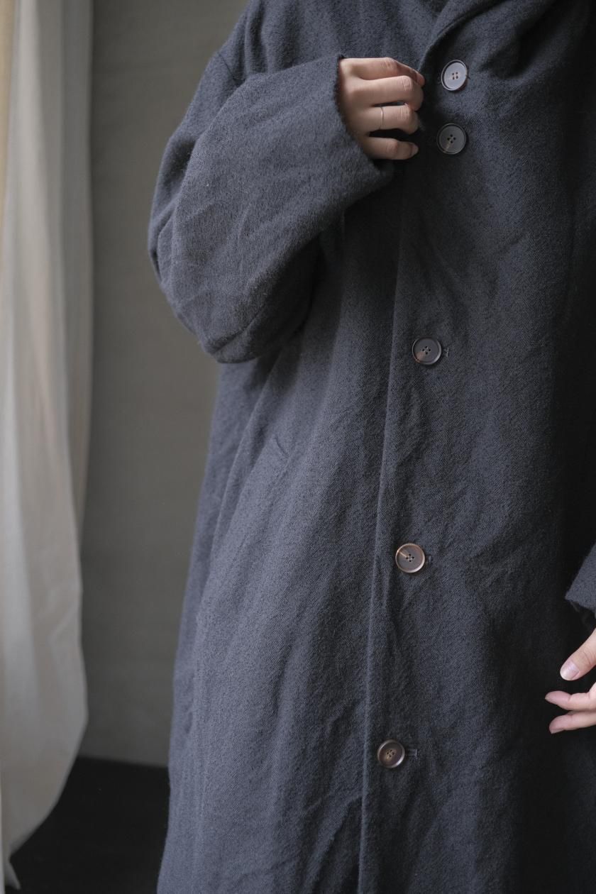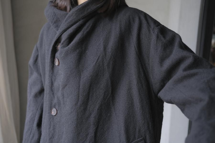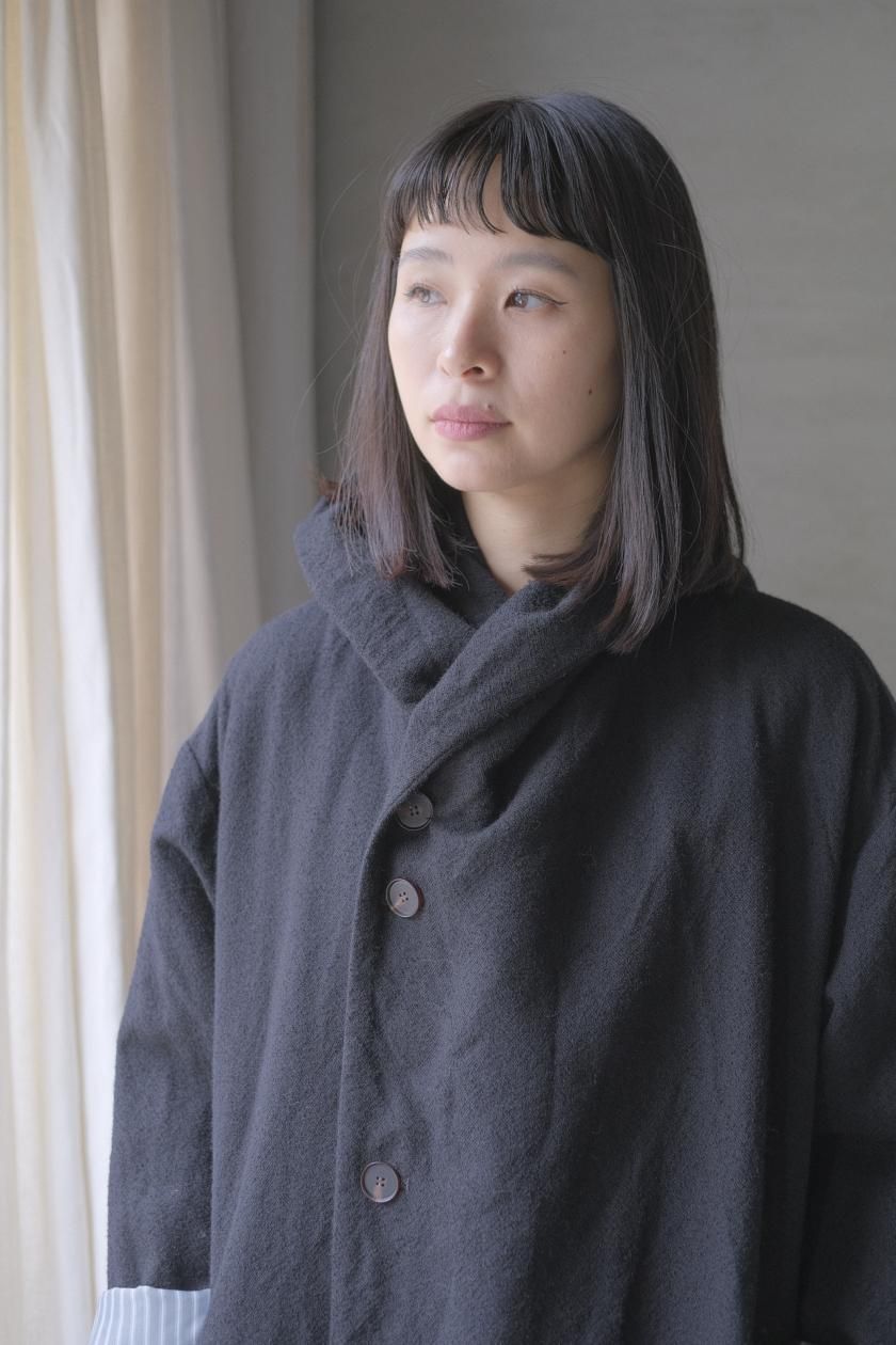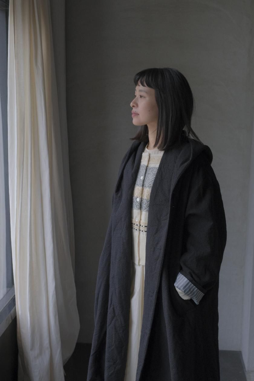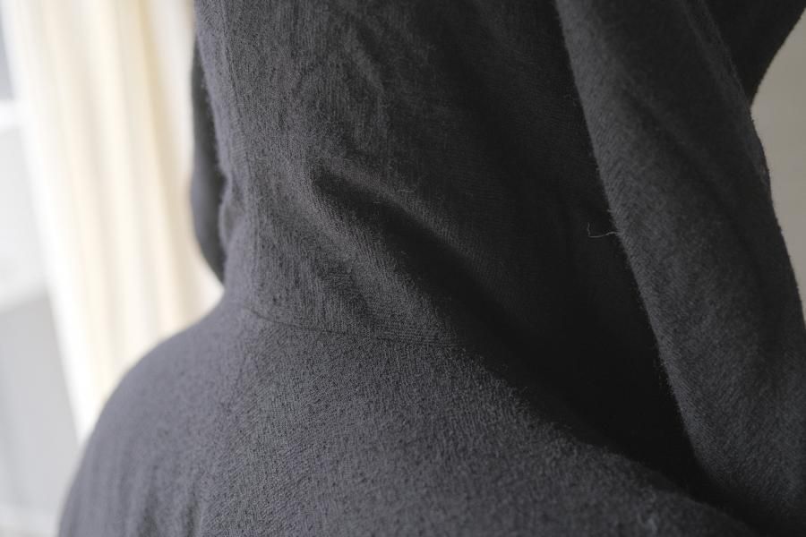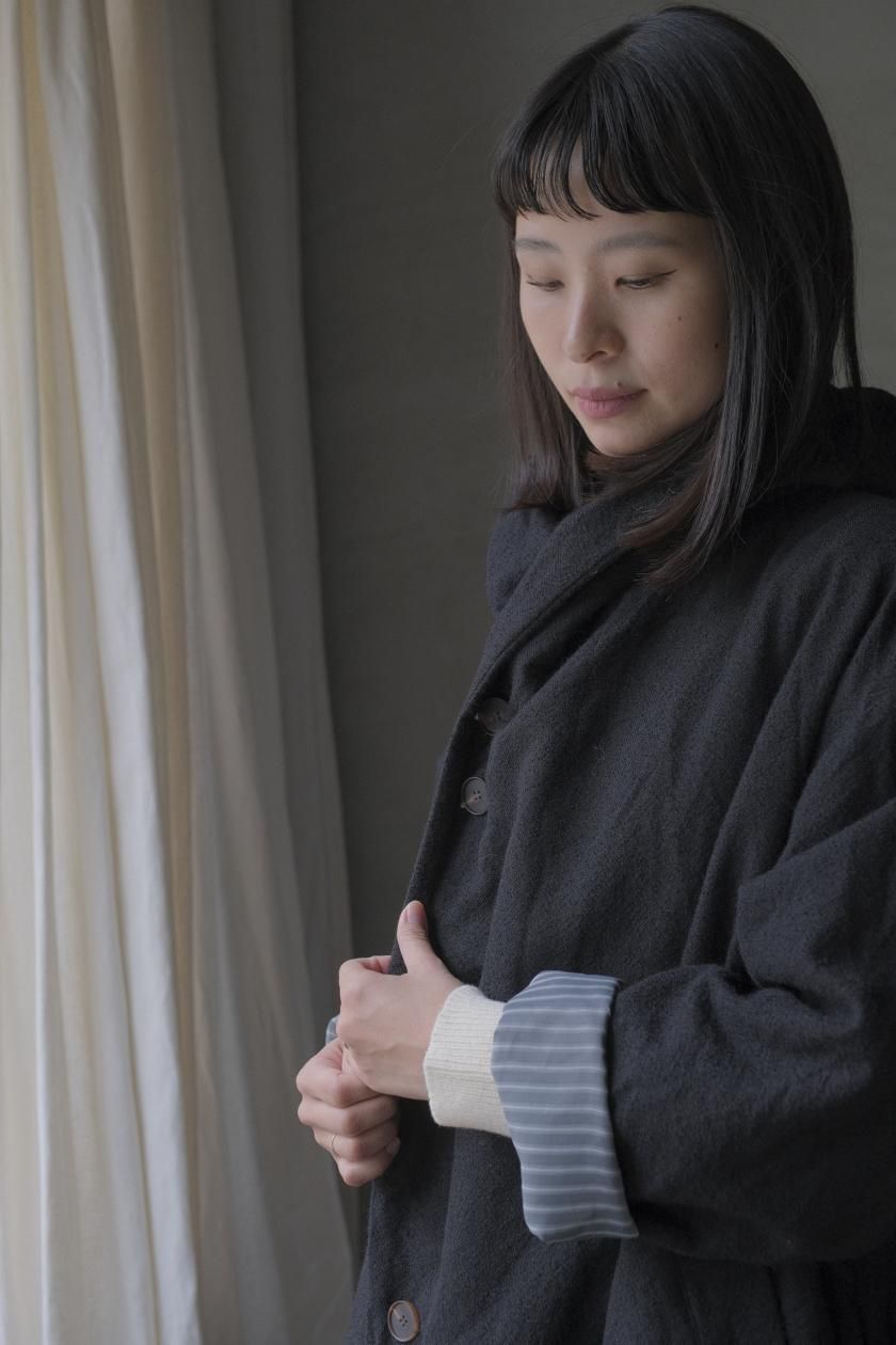 前開きの重なりをたっぷりとり、前身頃をそのまま切り換えなく後ろに回してフードにすることで、首回りも暖かい。