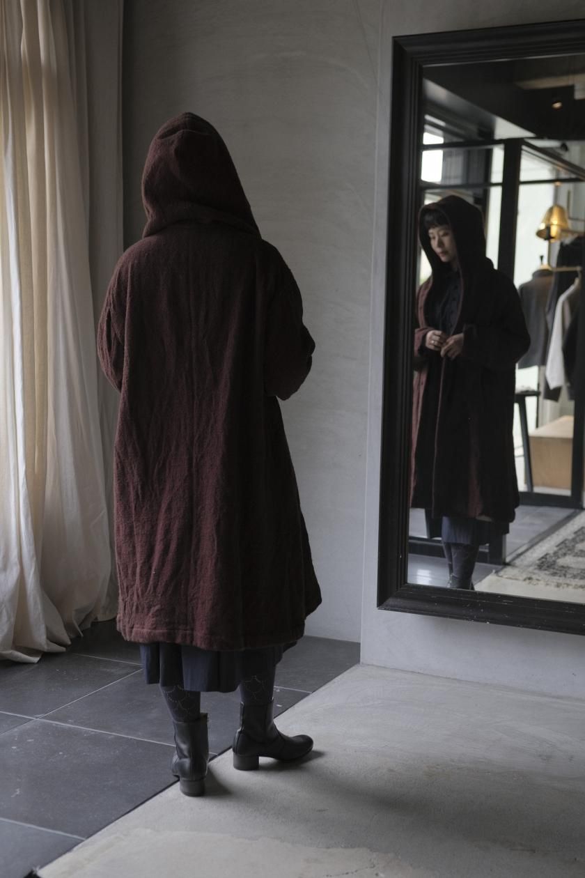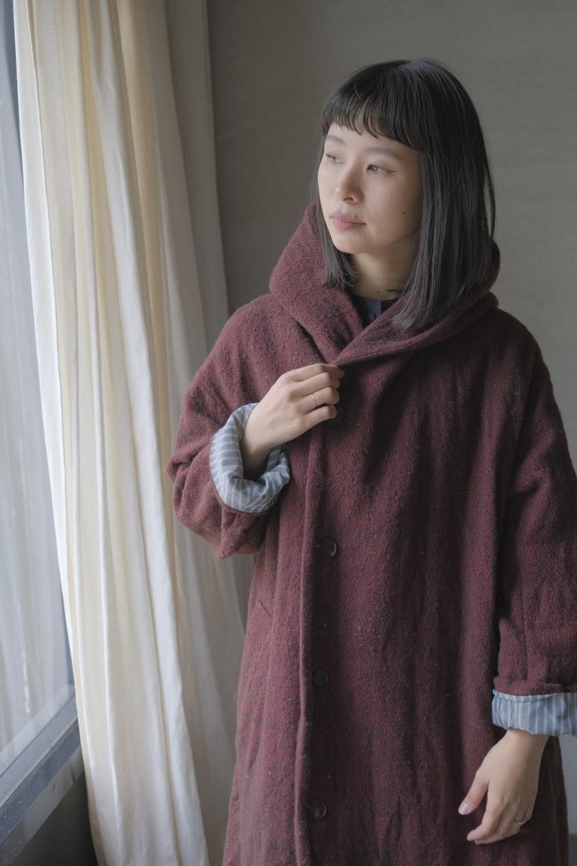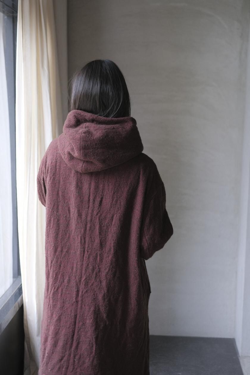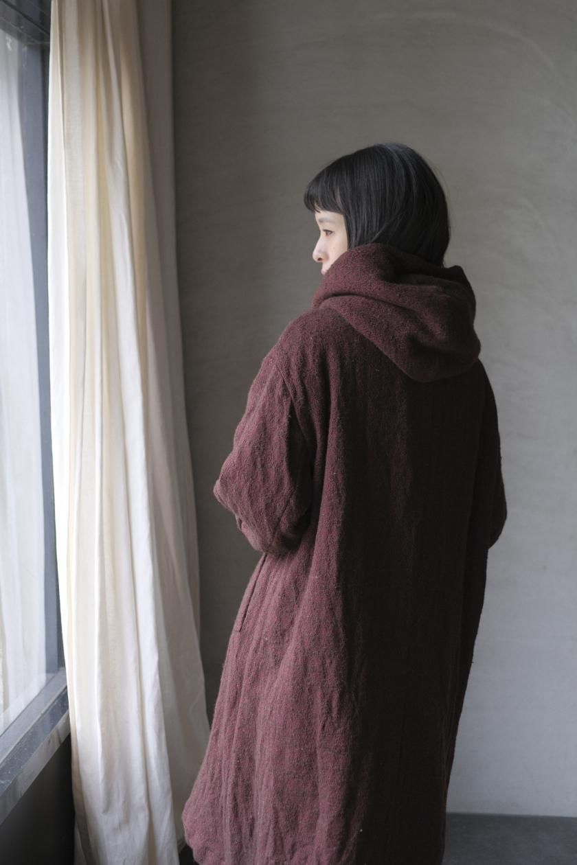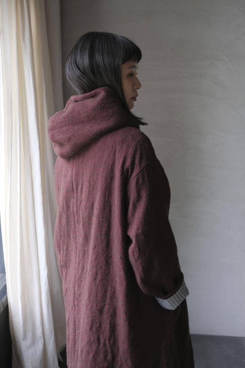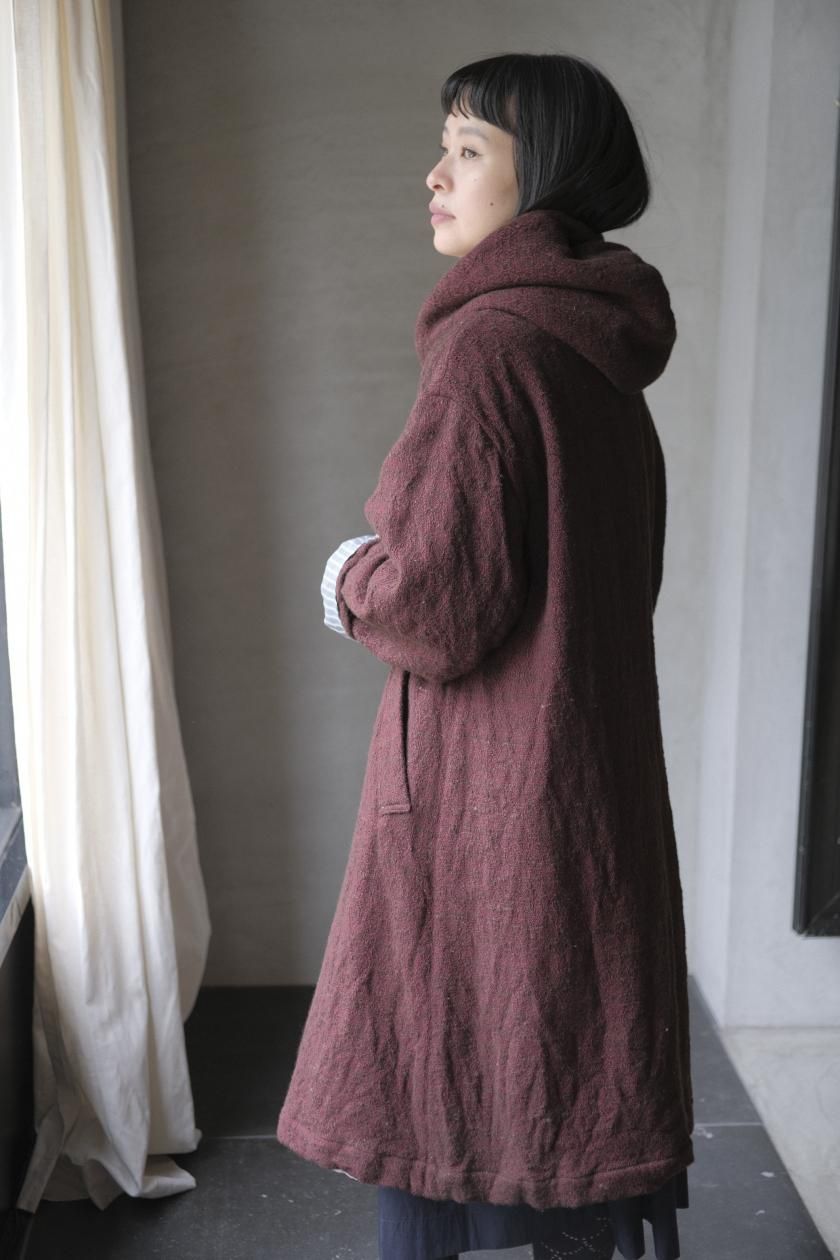 前開きの重なりをたっぷりとり、前身頃をそのまま切り換えなく後ろに回してフードにすることで、首回りも暖かい。