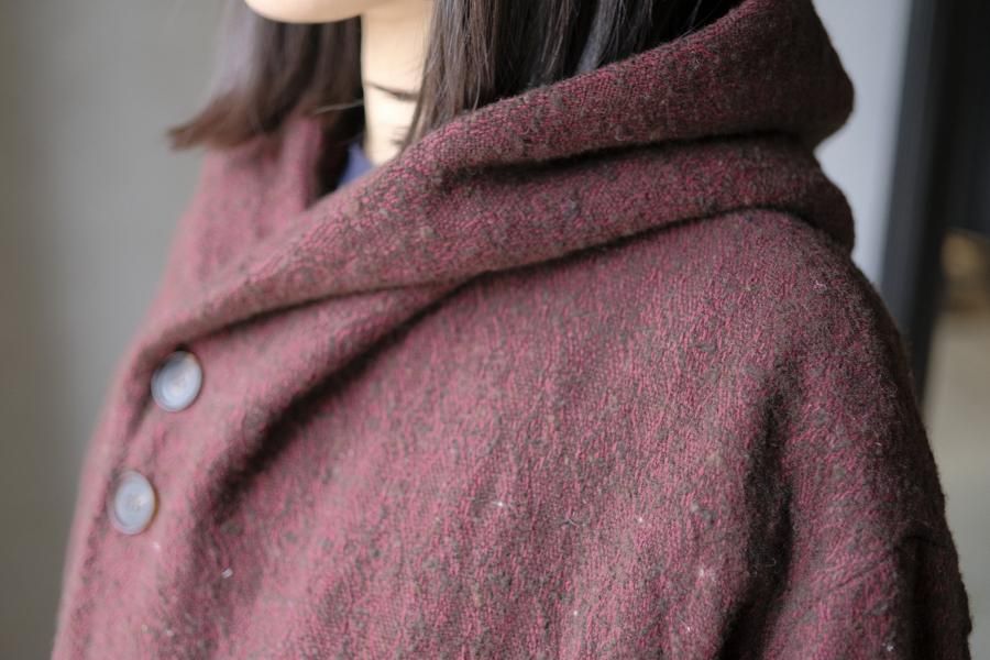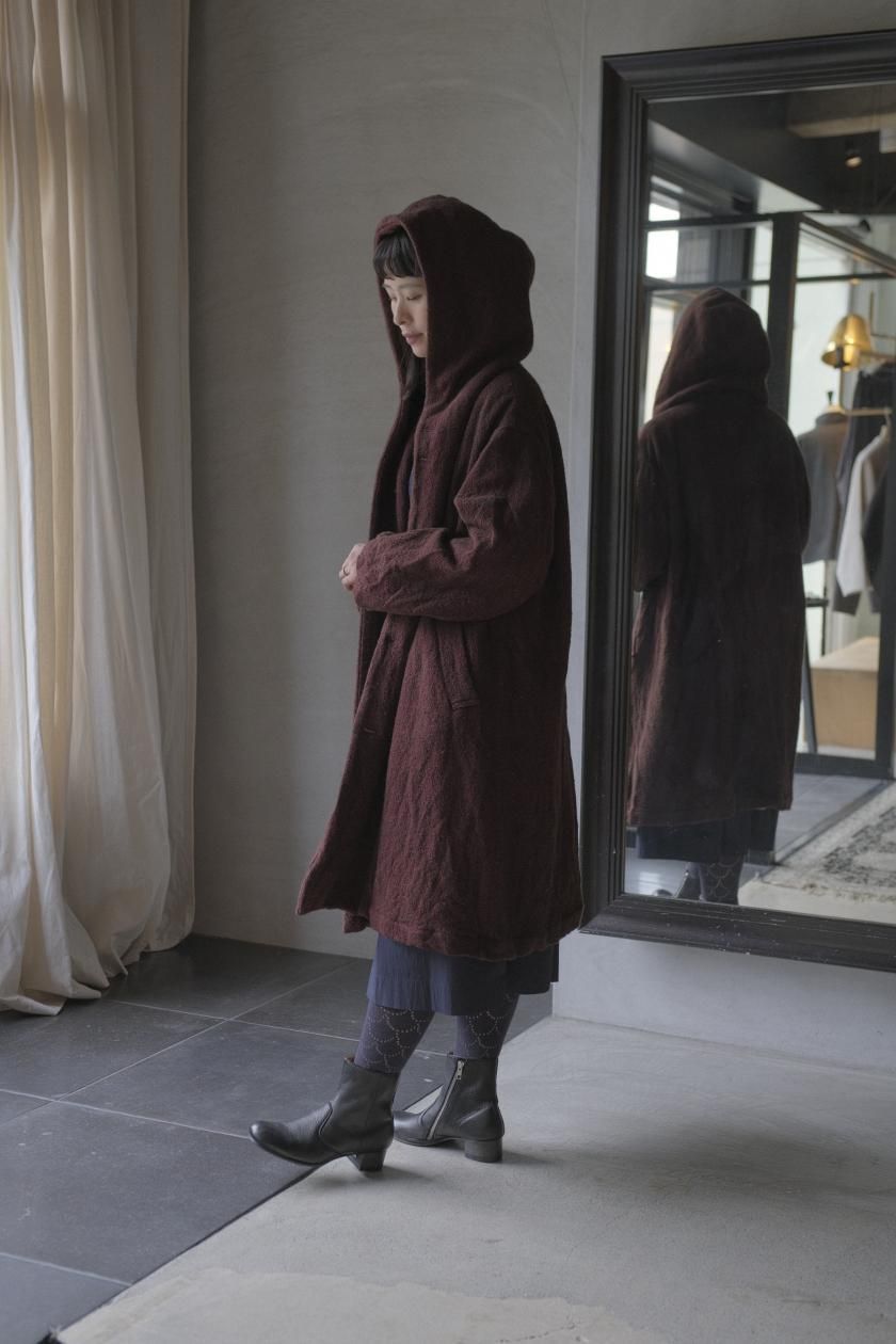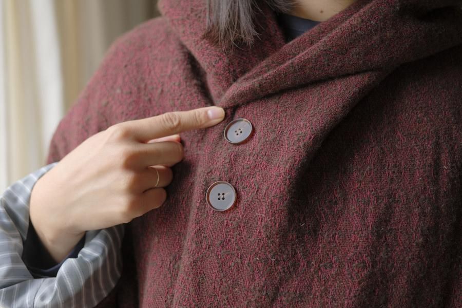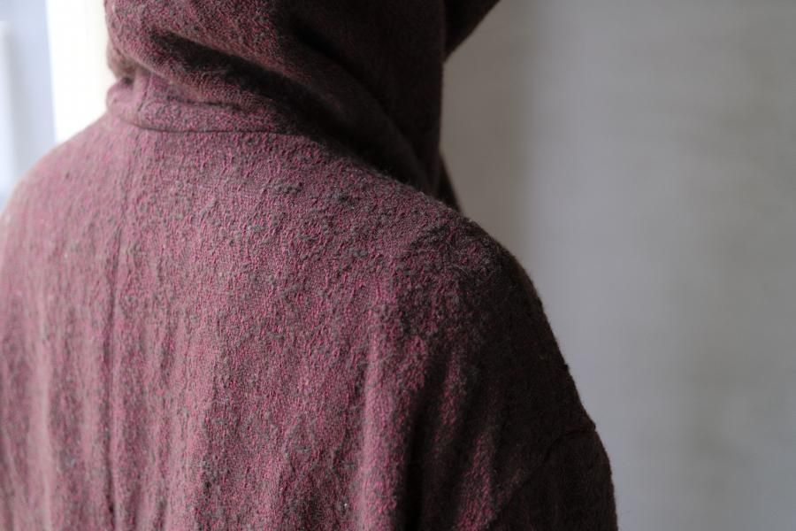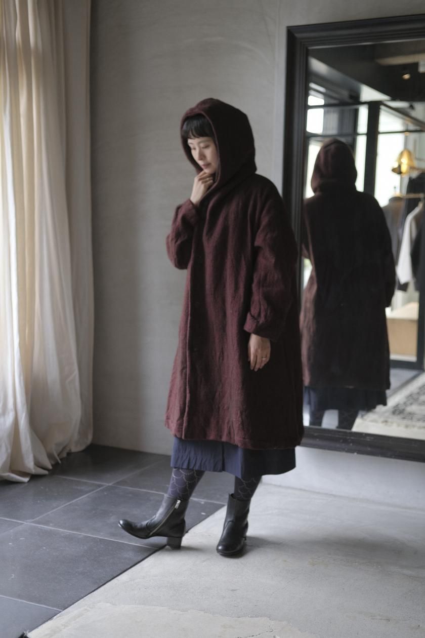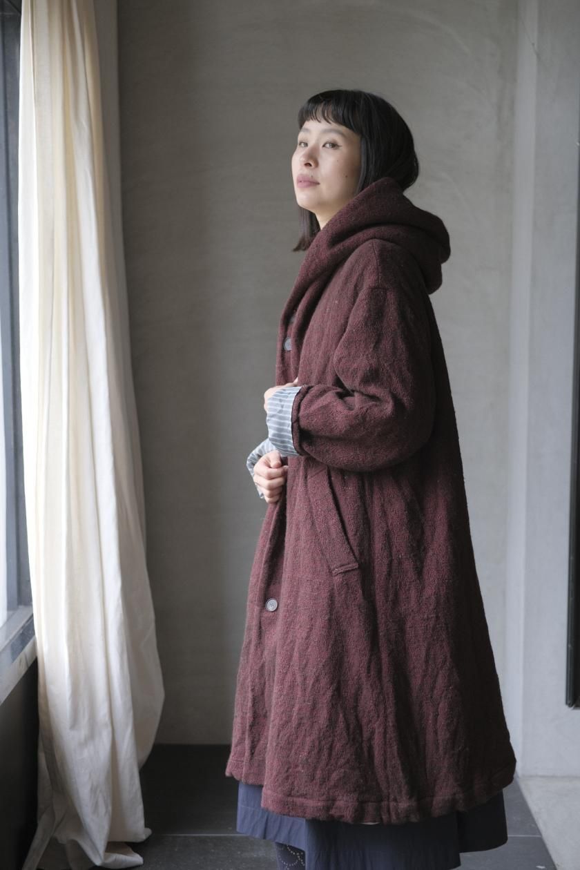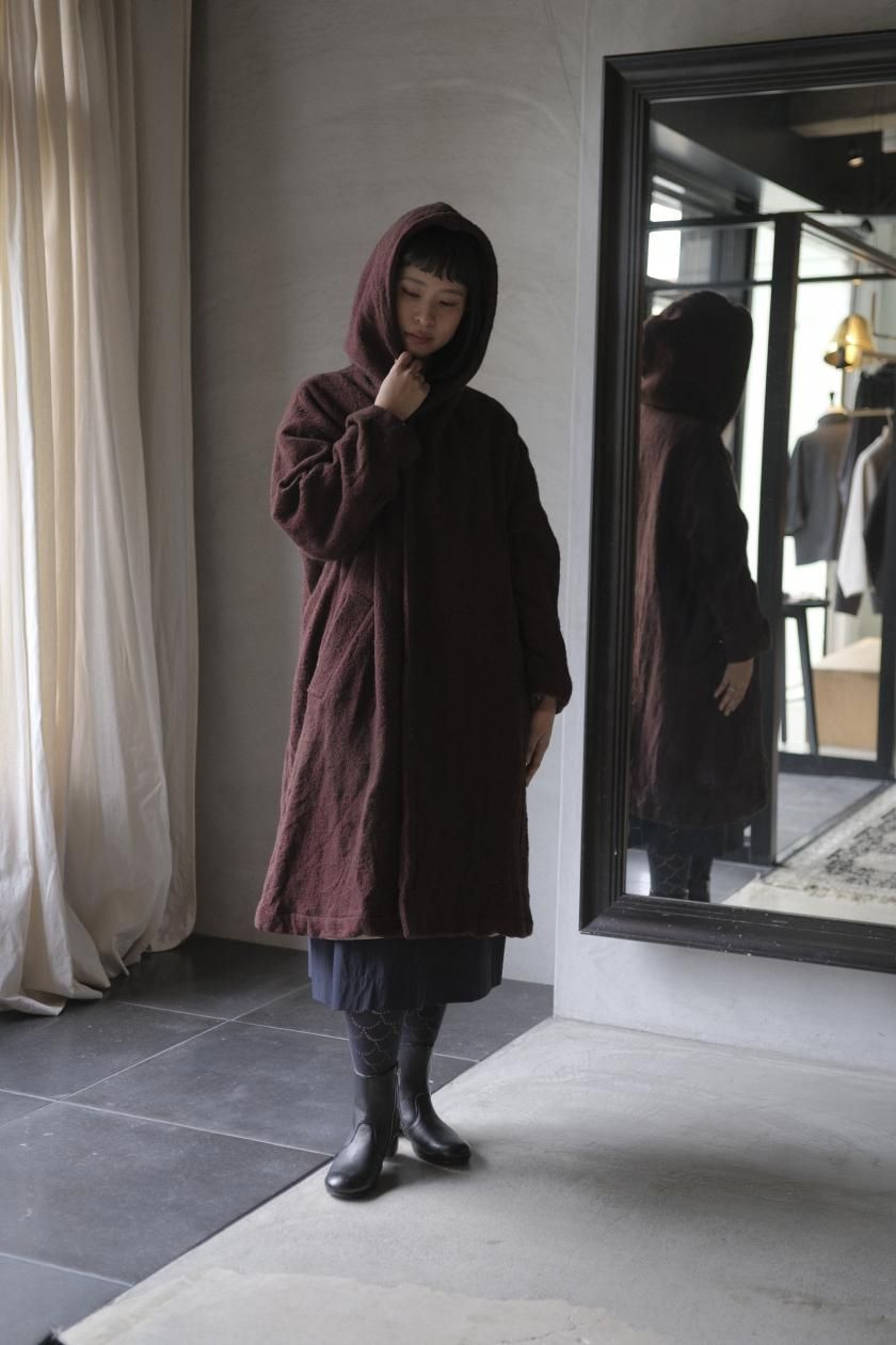 前開きの重なりをたっぷりとり、前身頃をそのまま切り換えなく後ろに回してフードにすることで、首回りも暖かい。