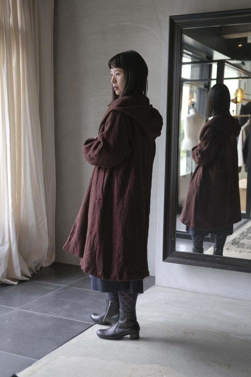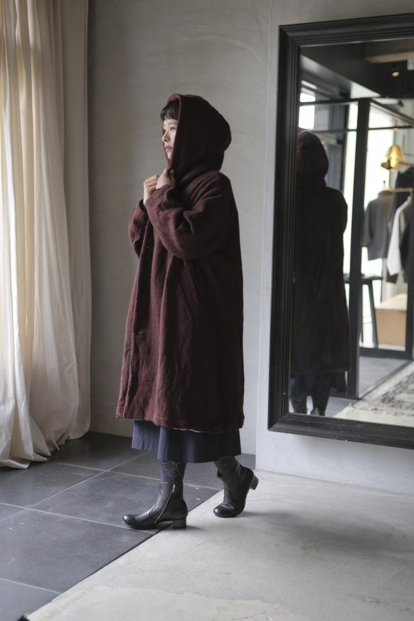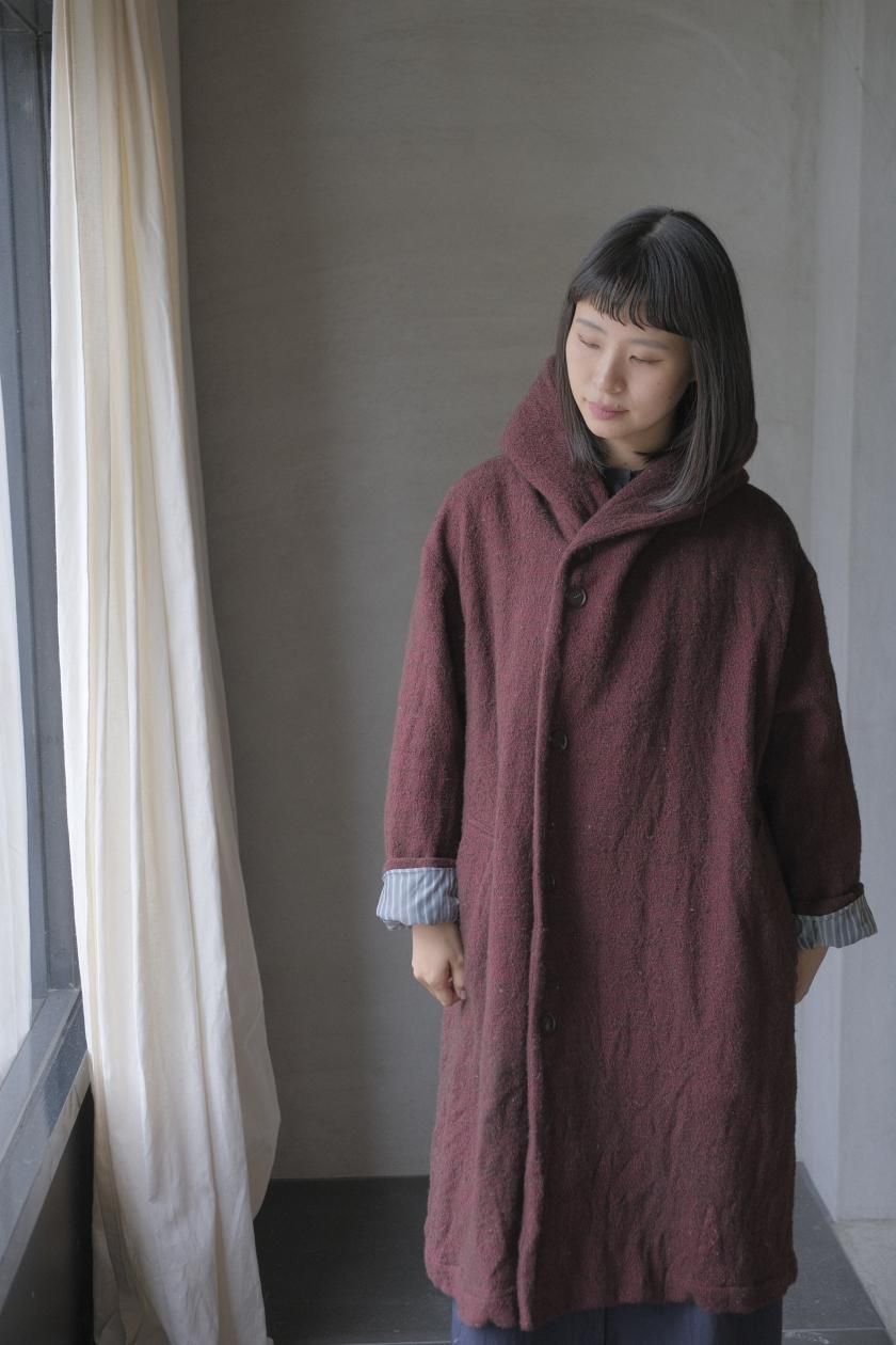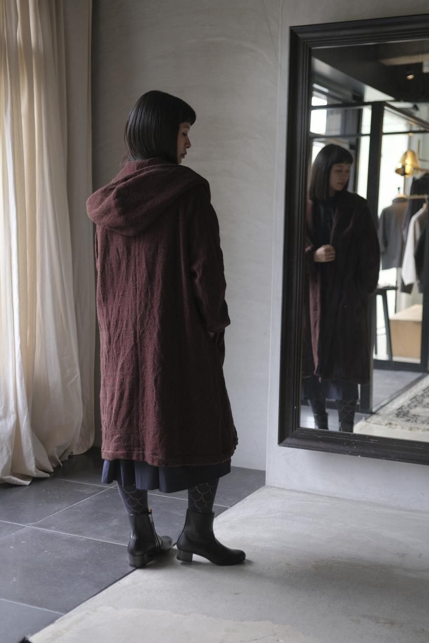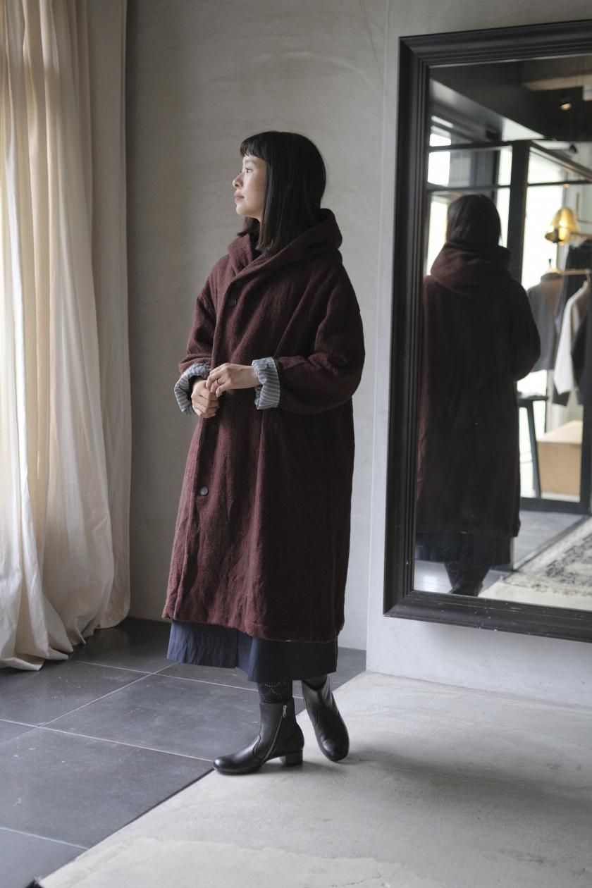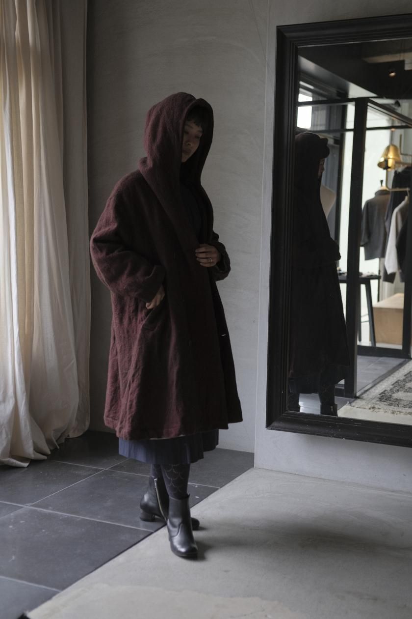 前開きの重なりをたっぷりとり、前身頃をそのまま切り換えなく後ろに回してフードにすることで、首回りも暖かい。