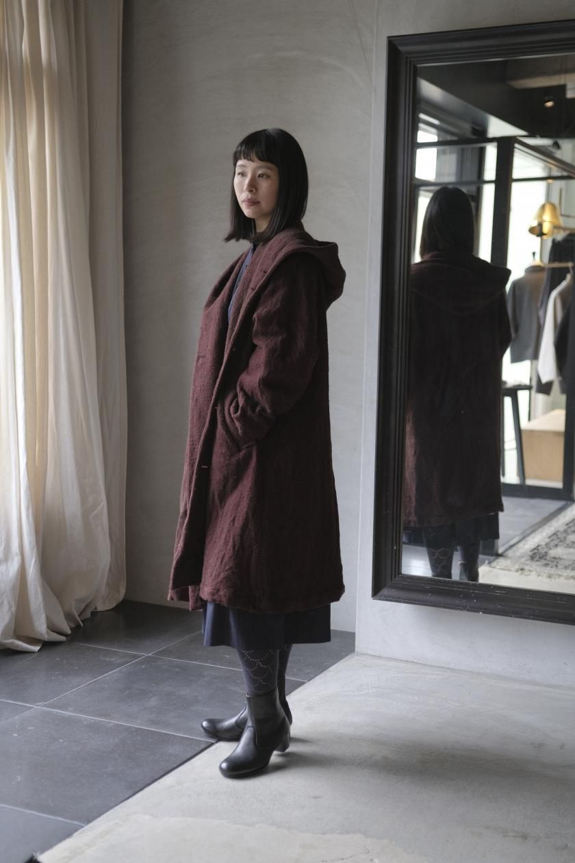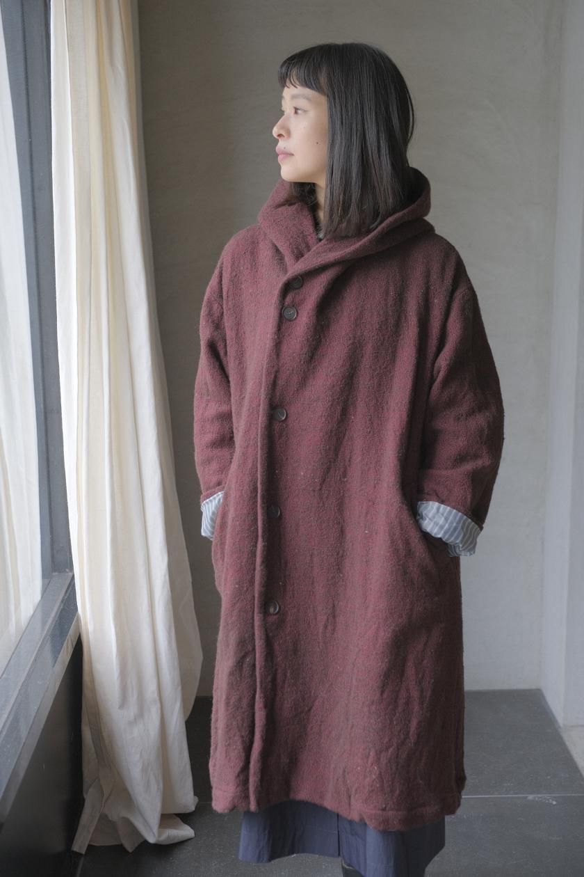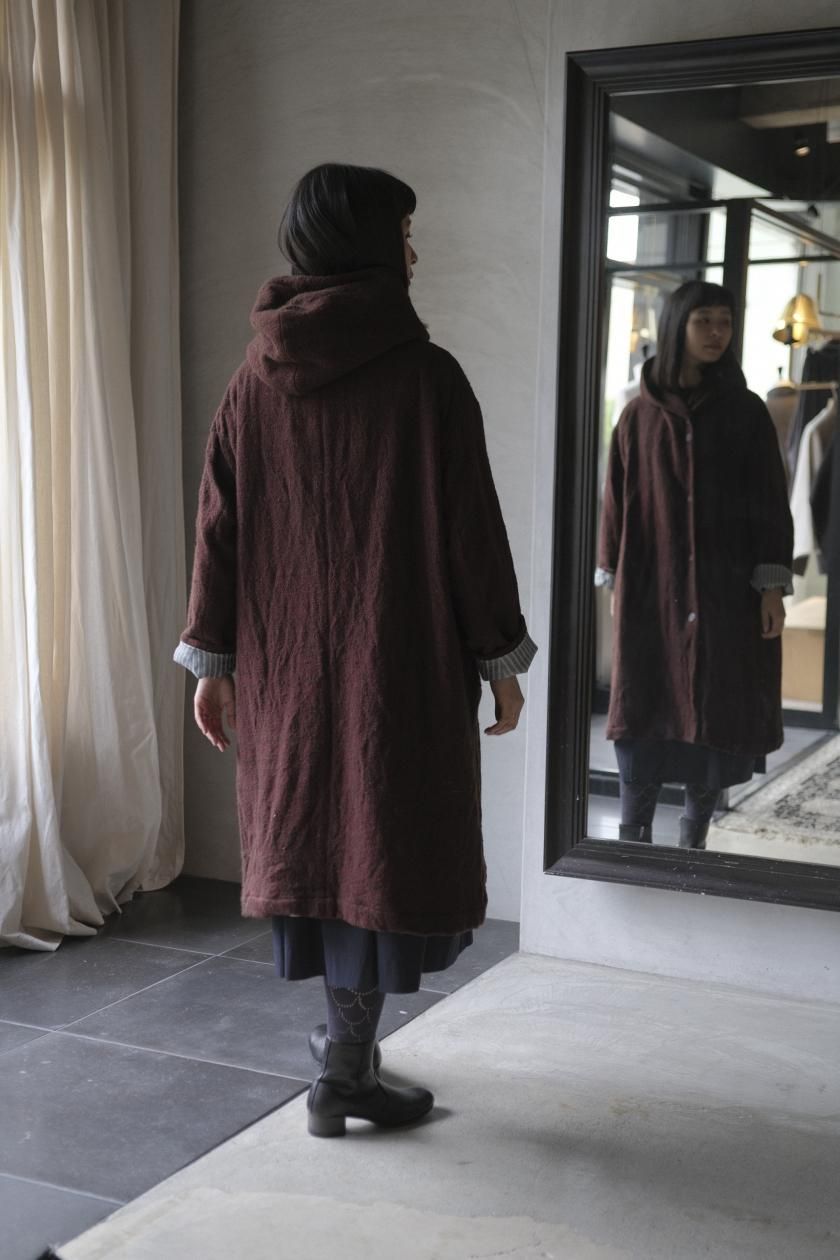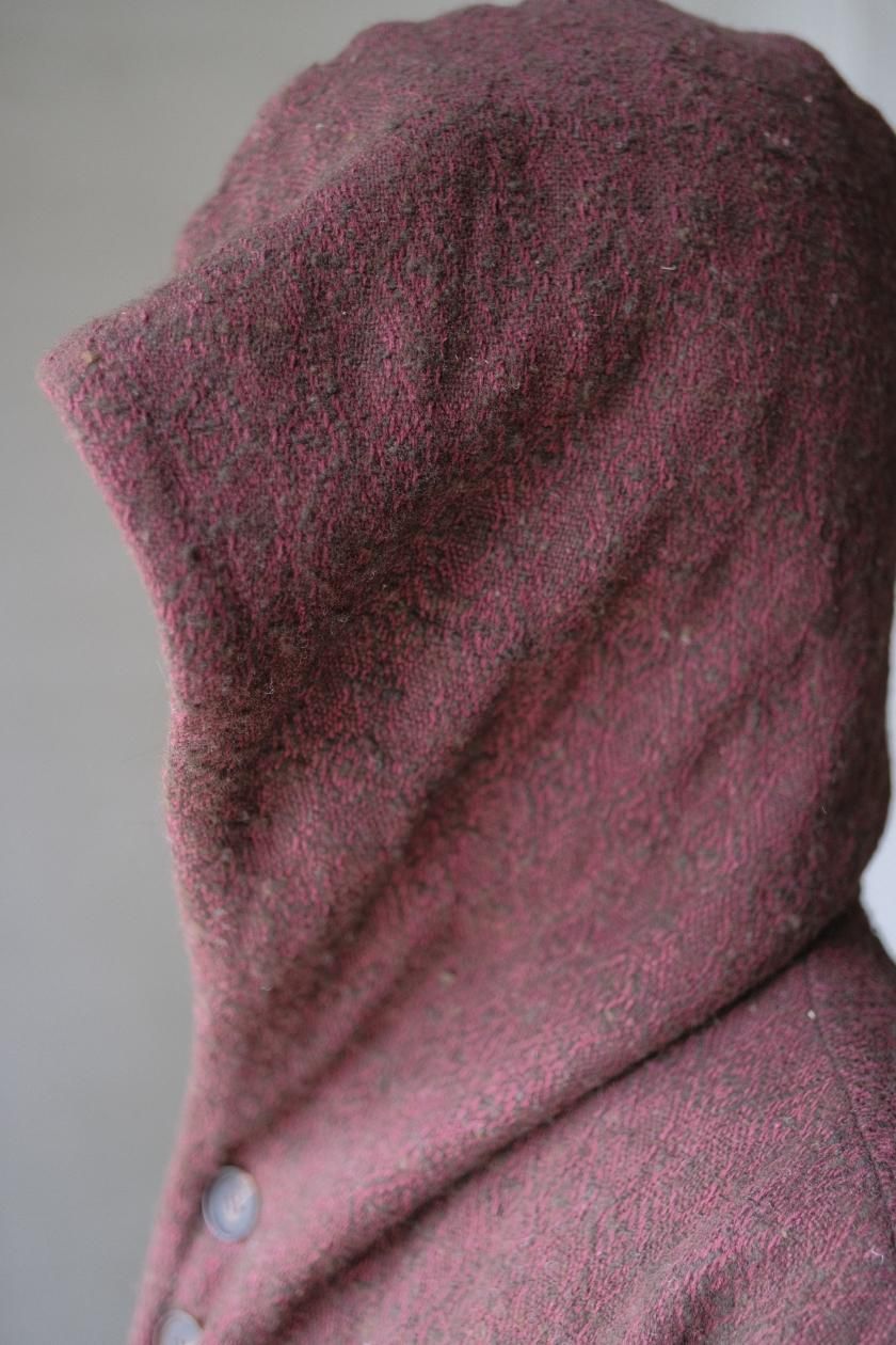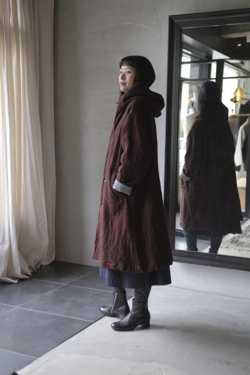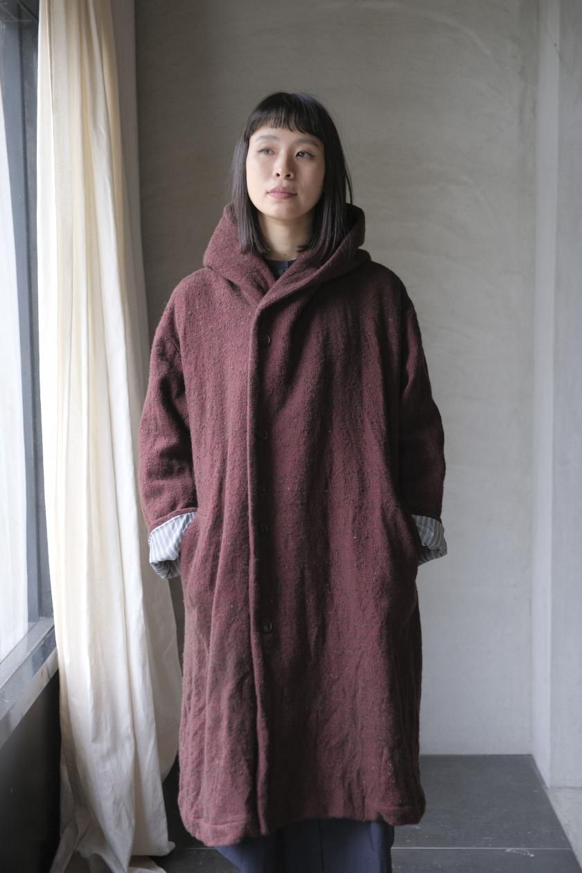 前開きの重なりをたっぷりとり、前身頃をそのまま切り換えなく後ろに回してフードにすることで、首回りも暖かい。