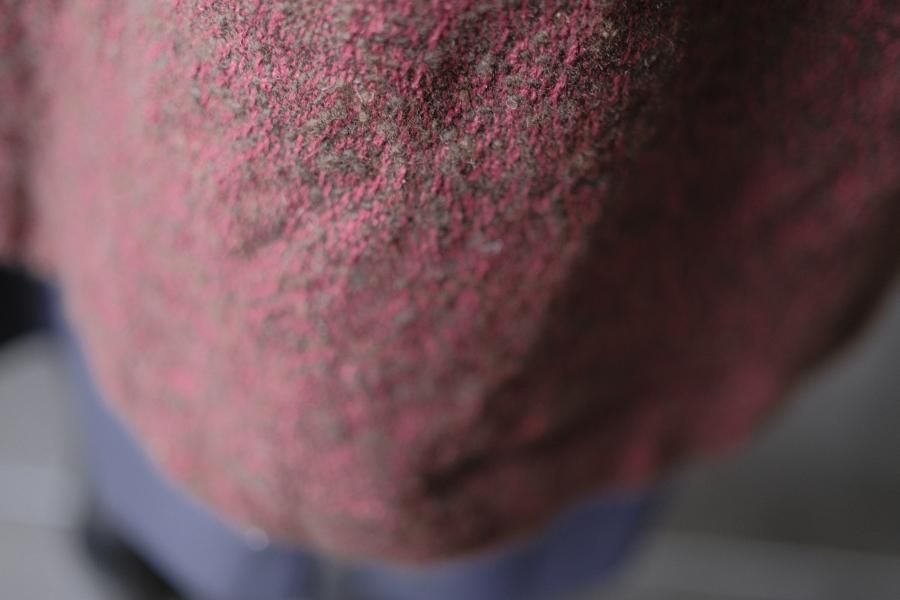 ナチュラルウールとは、染色していない羊毛をそのまましようしていて、精錬作業も極力行わないため藁などが混じっている。そのため、紡績して糸にするのが非常に難しいそう。