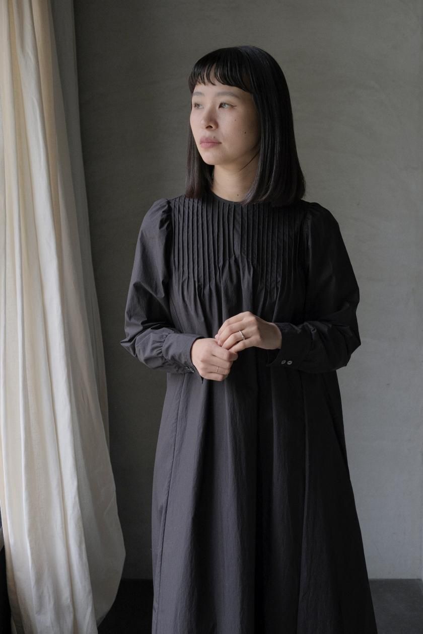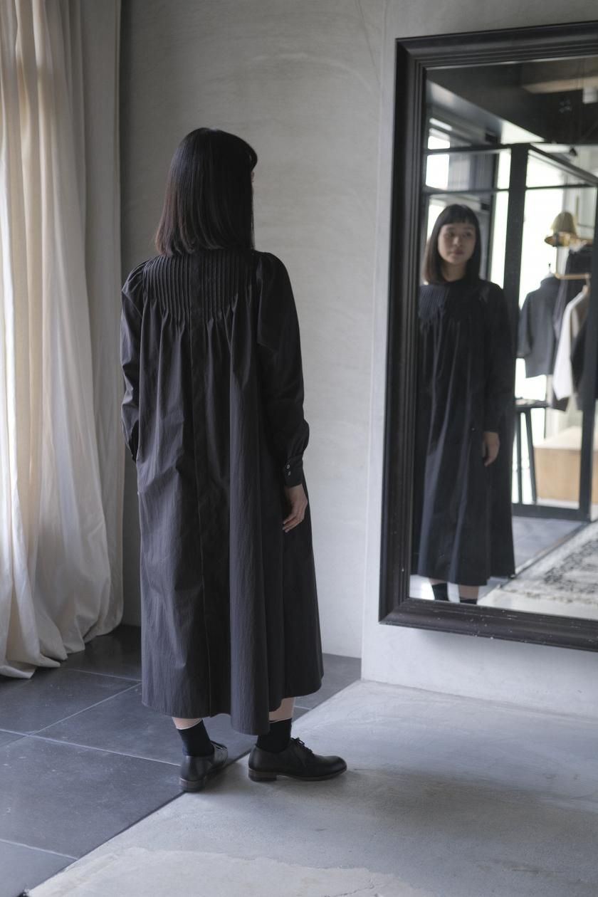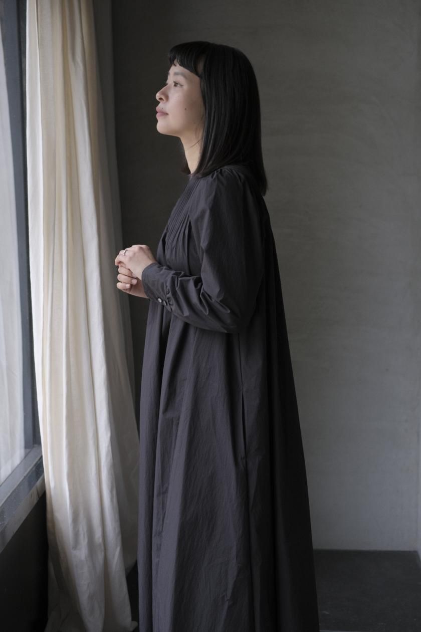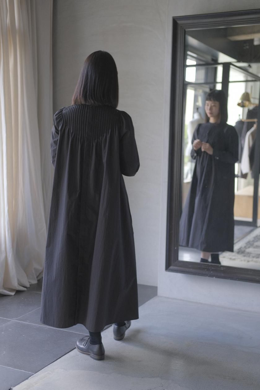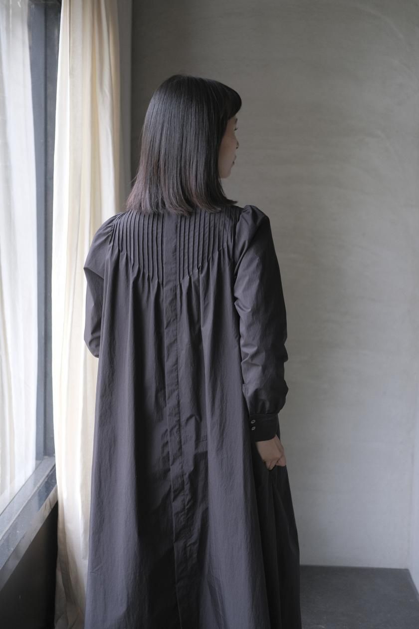 古い時代の彫刻家からインスパイアされた、前後の胸元に繊細なピンタックが並んだロング丈のワンピースです。後ろ開きでワンピースとして、前開きで羽織物としてもお召しいただけます。