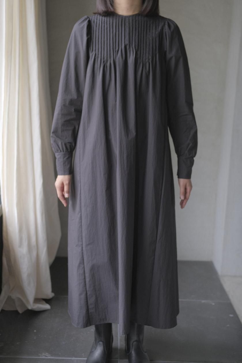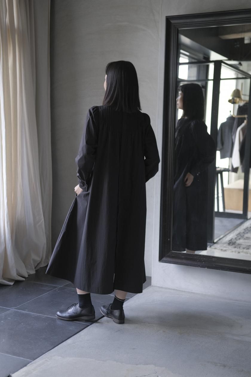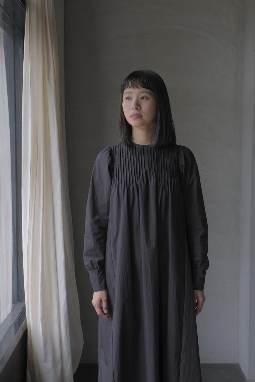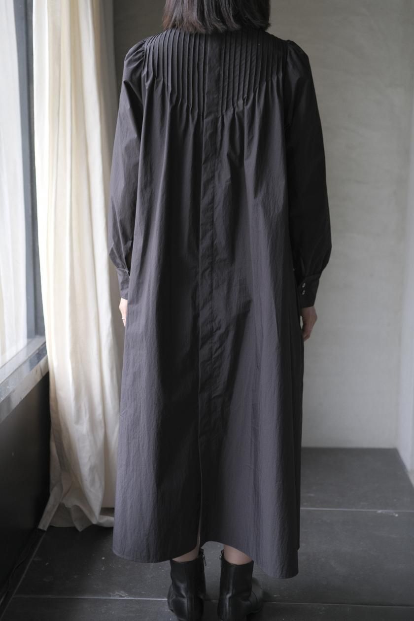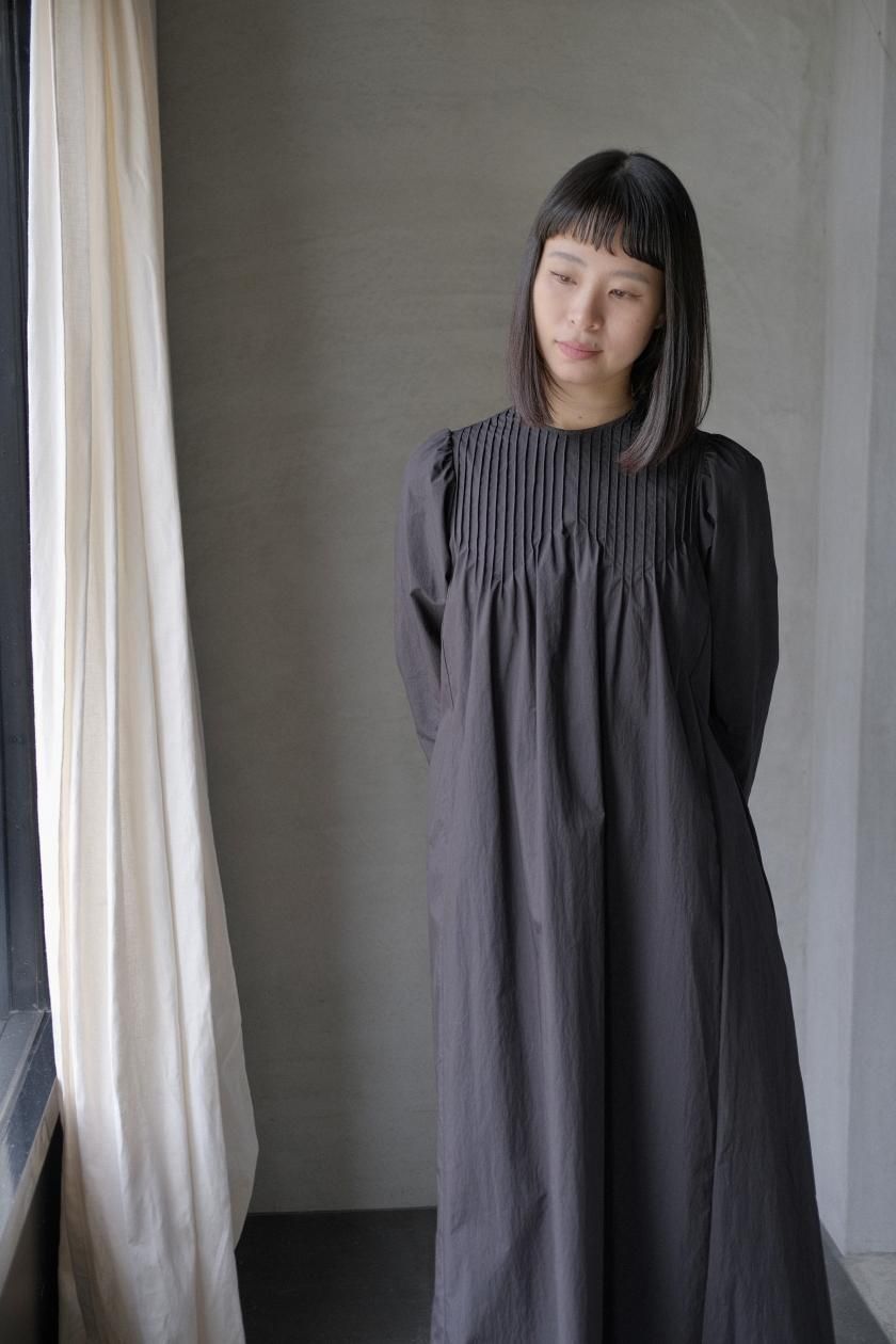 古い時代の彫刻家からインスパイアされた、前後の胸元に繊細なピンタックが並んだロング丈のワンピースです。後ろ開きでワンピースとして、前開きで羽織物としてもお召しいただけます。