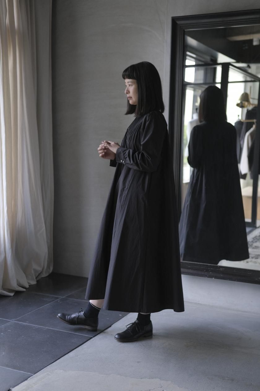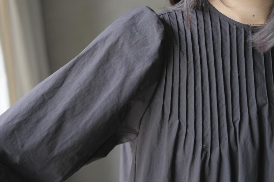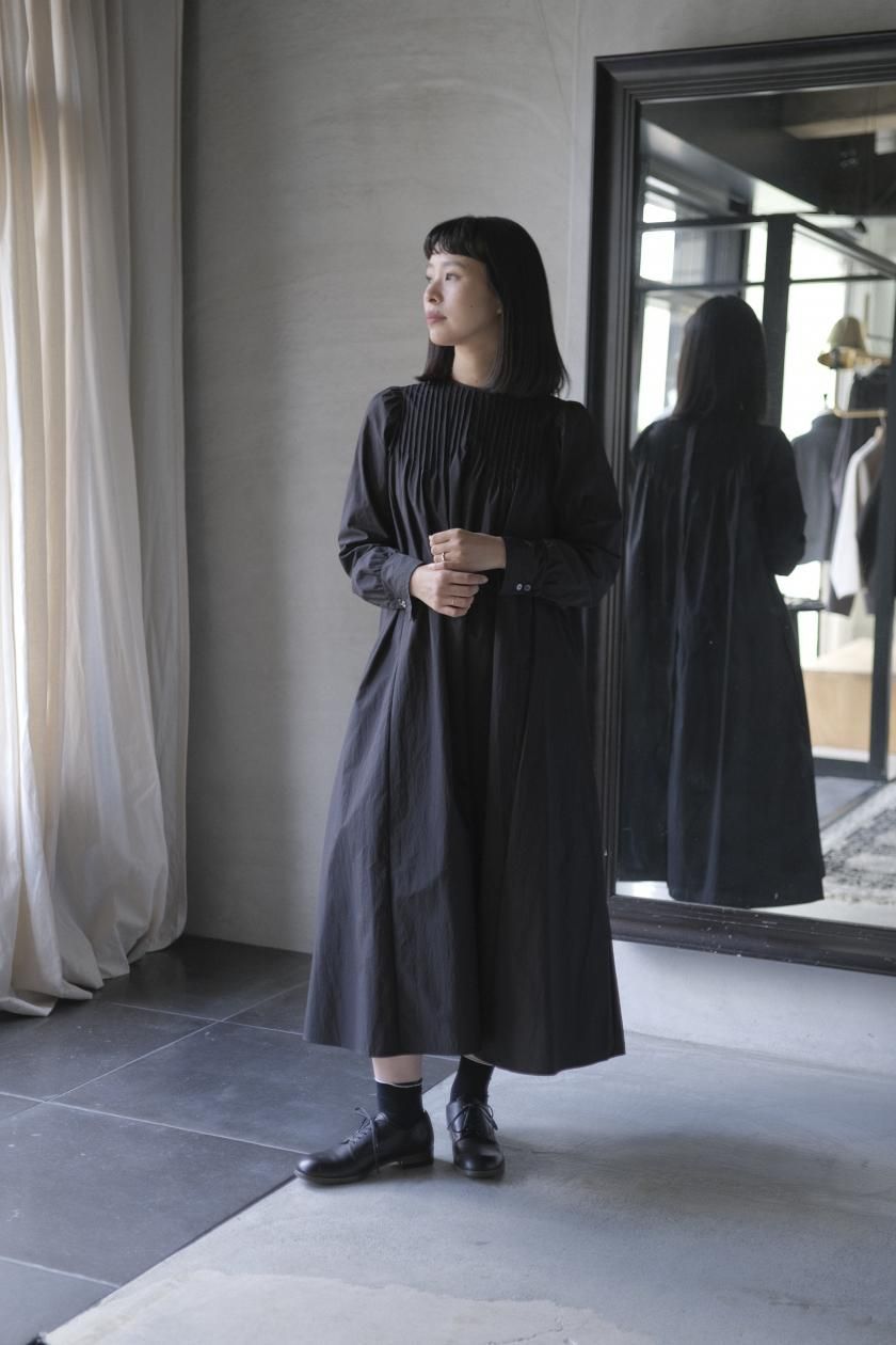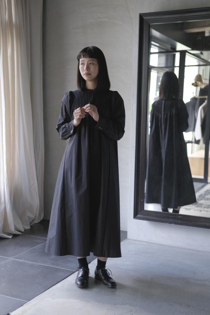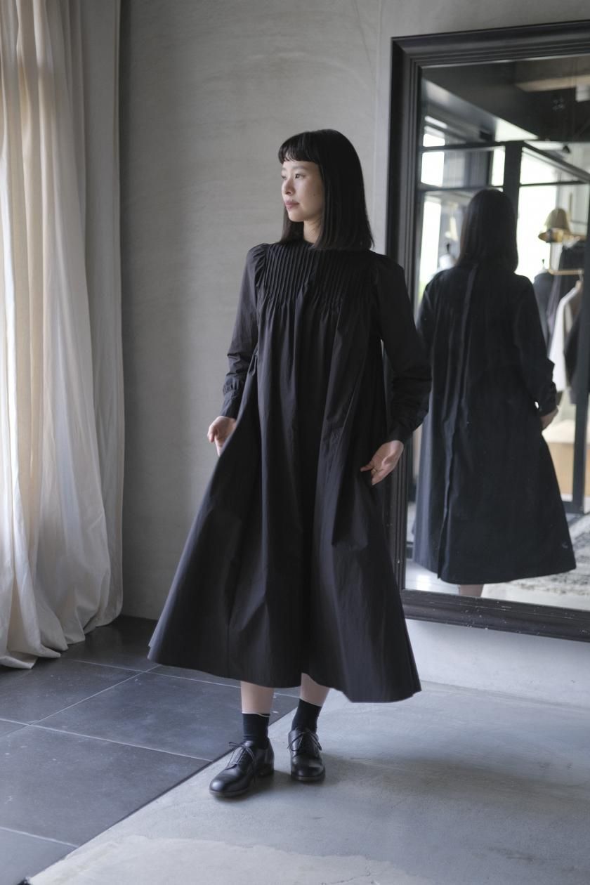 古い時代の彫刻家からインスパイアされた、前後の胸元に繊細なピンタックが並んだロング丈のワンピースです。後ろ開きでワンピースとして、前開きで羽織物としてもお召しいただけます。