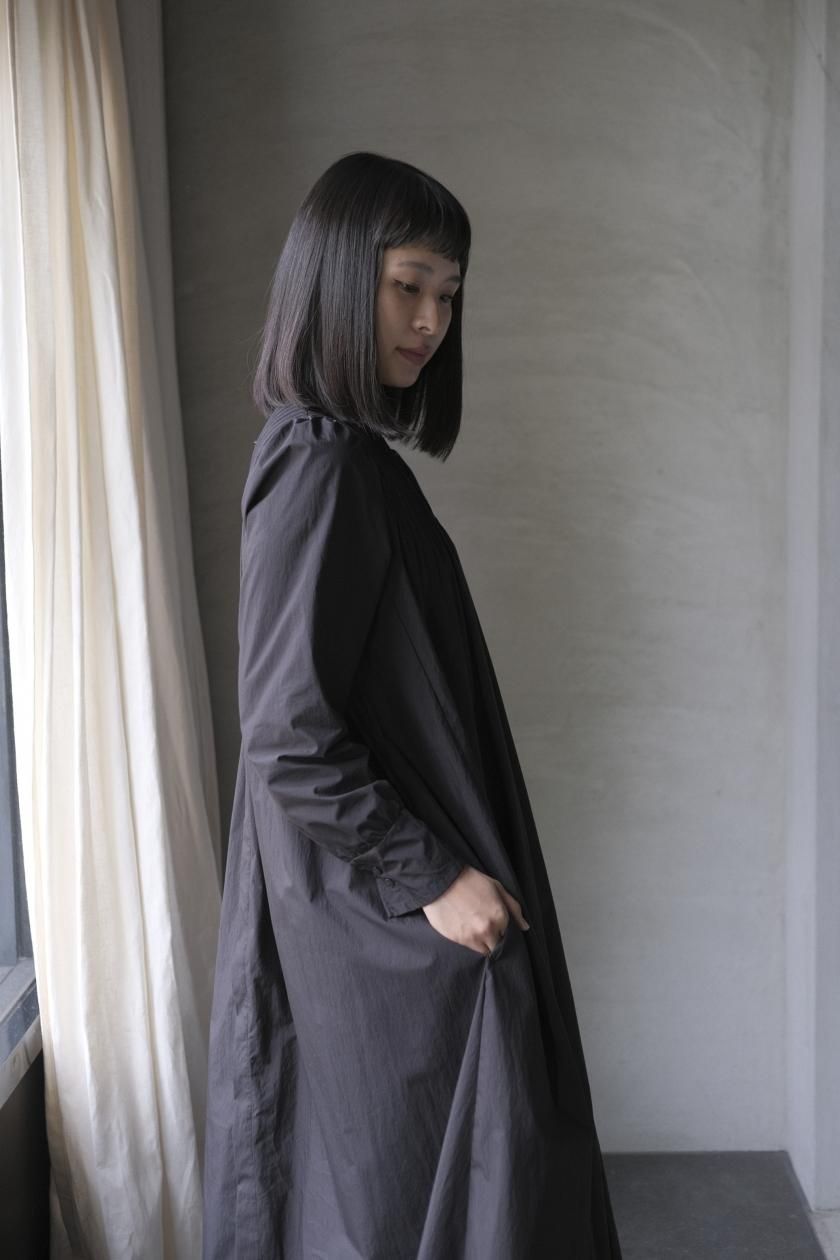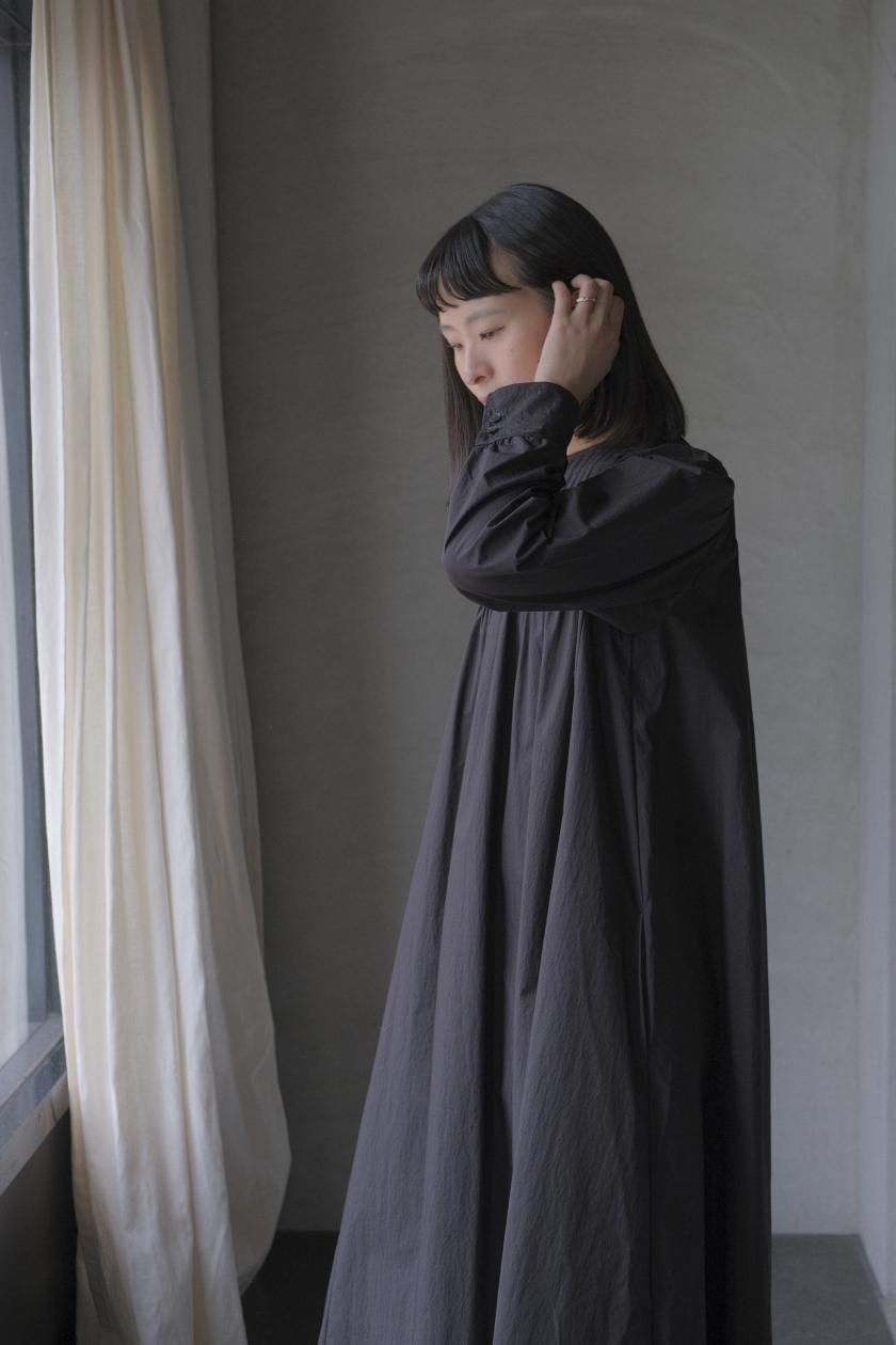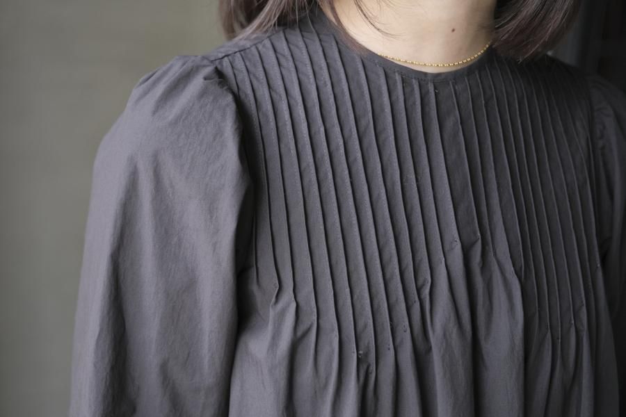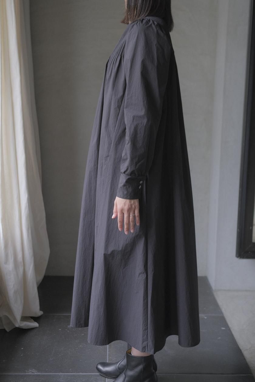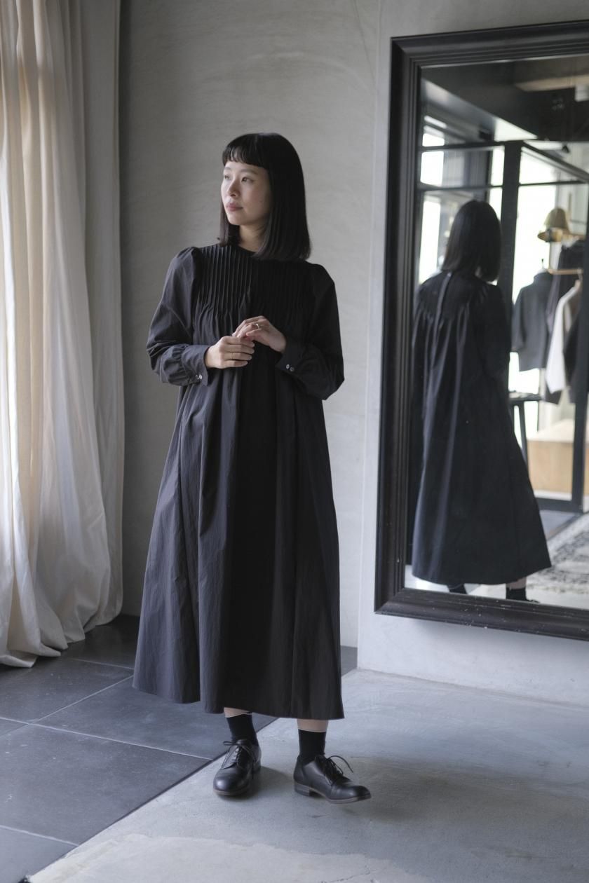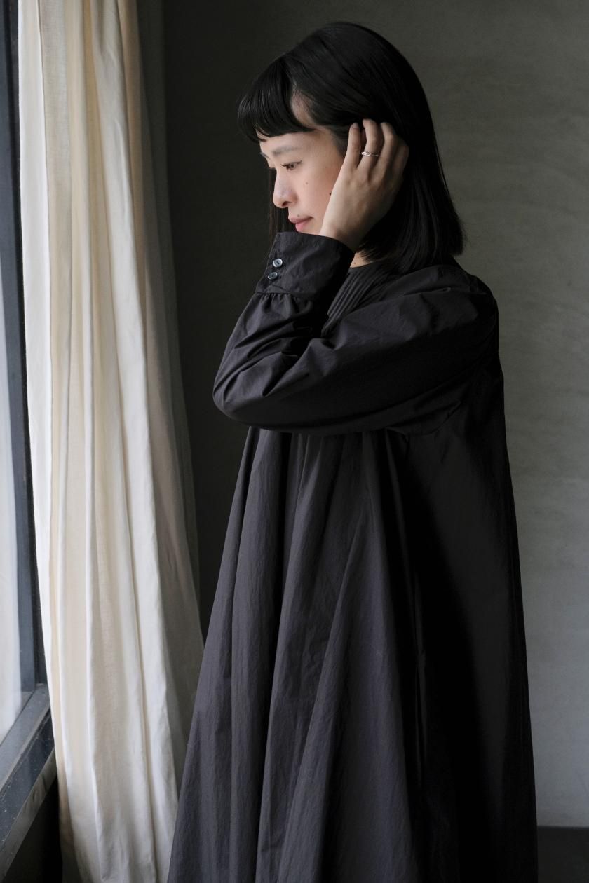古い時代の彫刻家からインスパイアされた、前後の胸元に繊細なピンタックが並んだロング丈のワンピースです。後ろ開きでワンピースとして、前開きで羽織物としてもお召しいただけます。