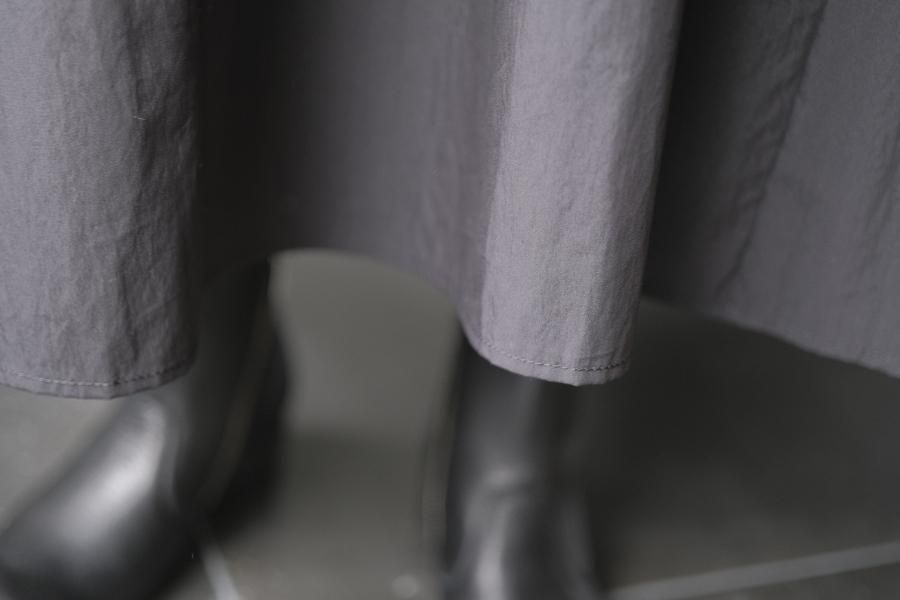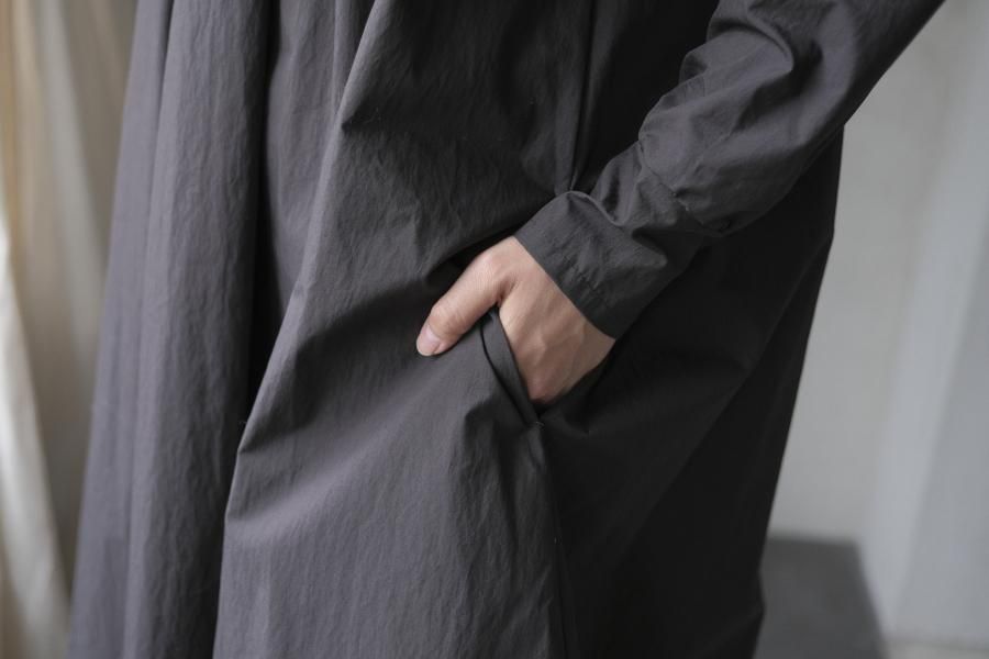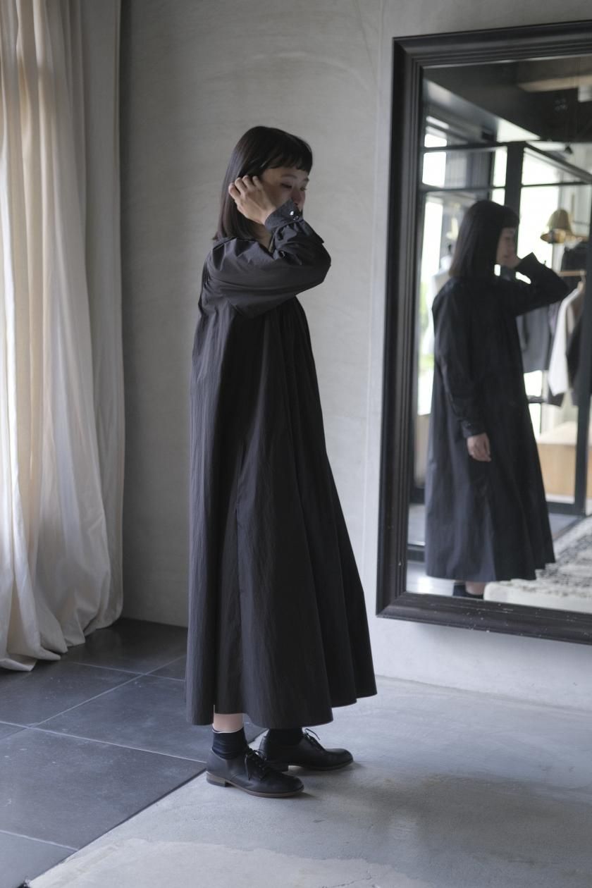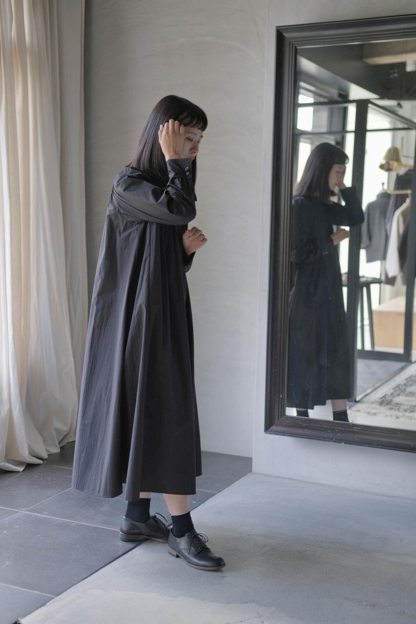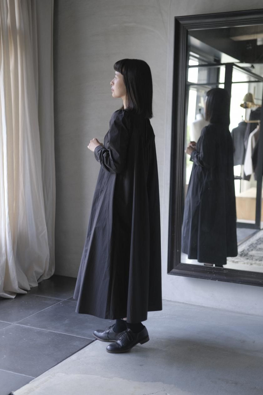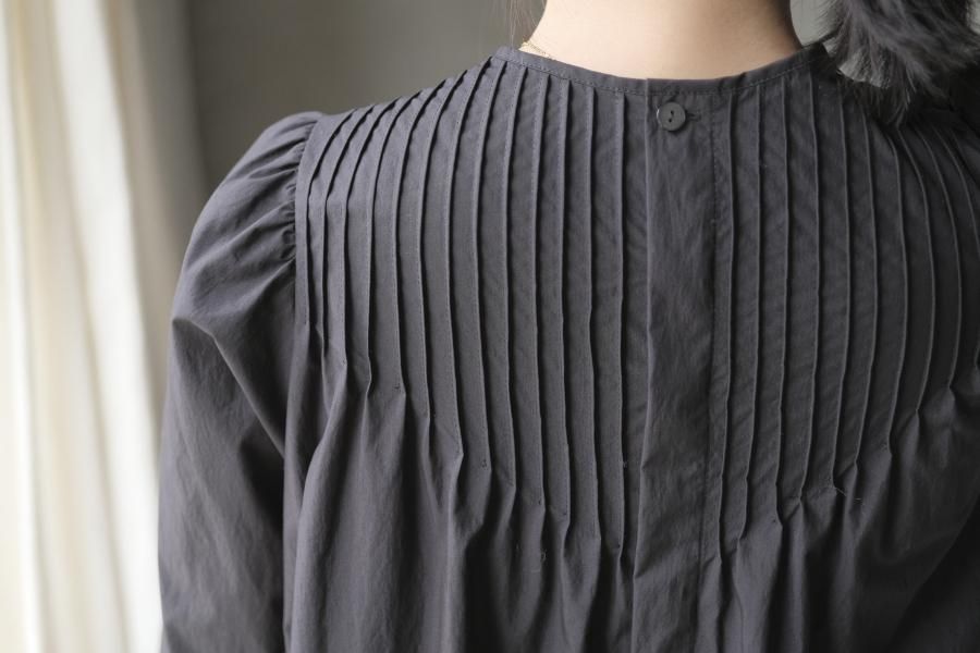 古い時代の彫刻家からインスパイアされた、前後の胸元に繊細なピンタックが並んだロング丈のワンピースです。後ろ開きでワンピースとして、前開きで羽織物としてもお召しいただけます。