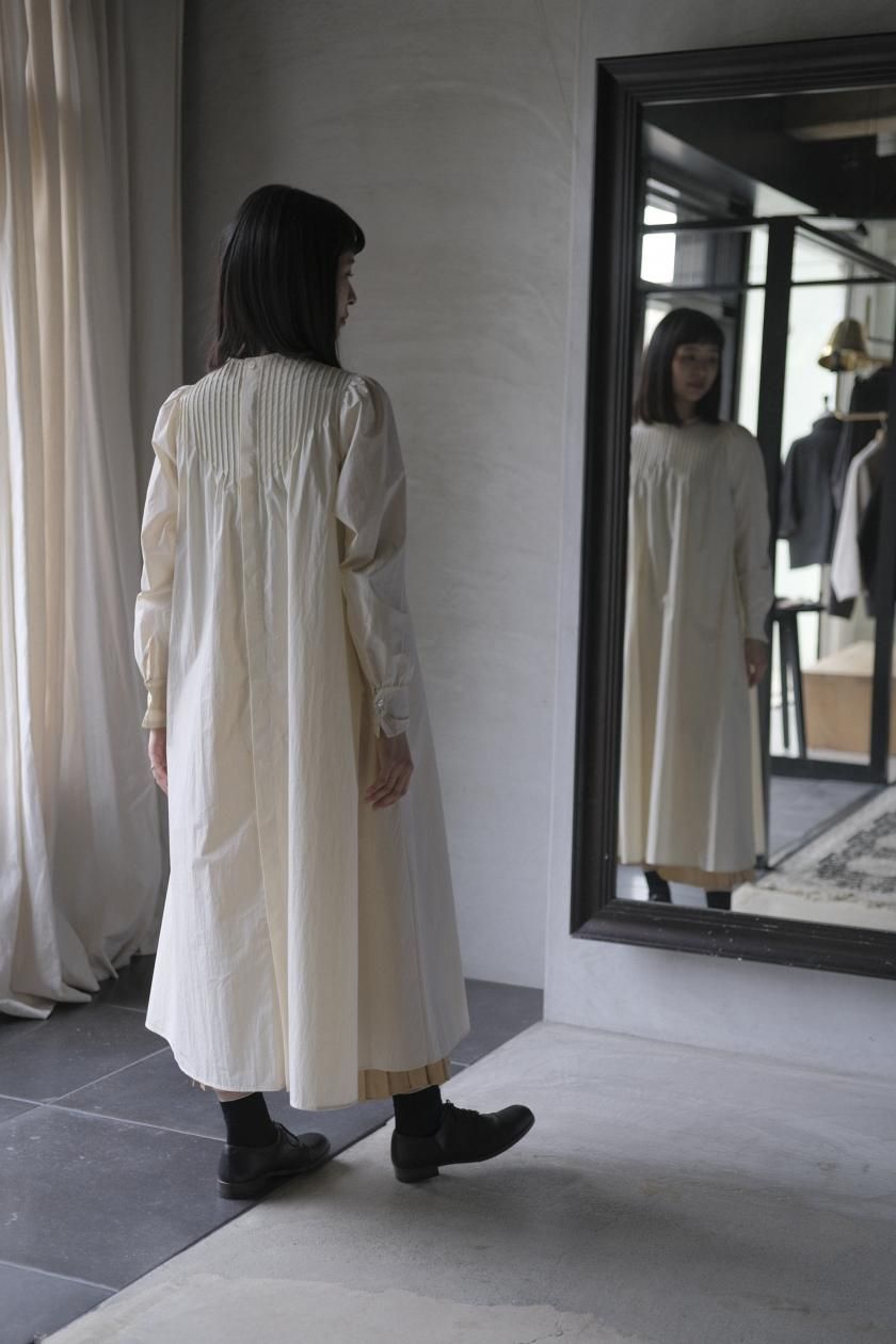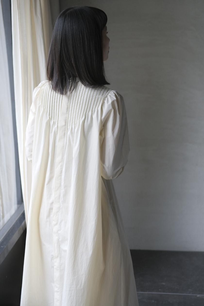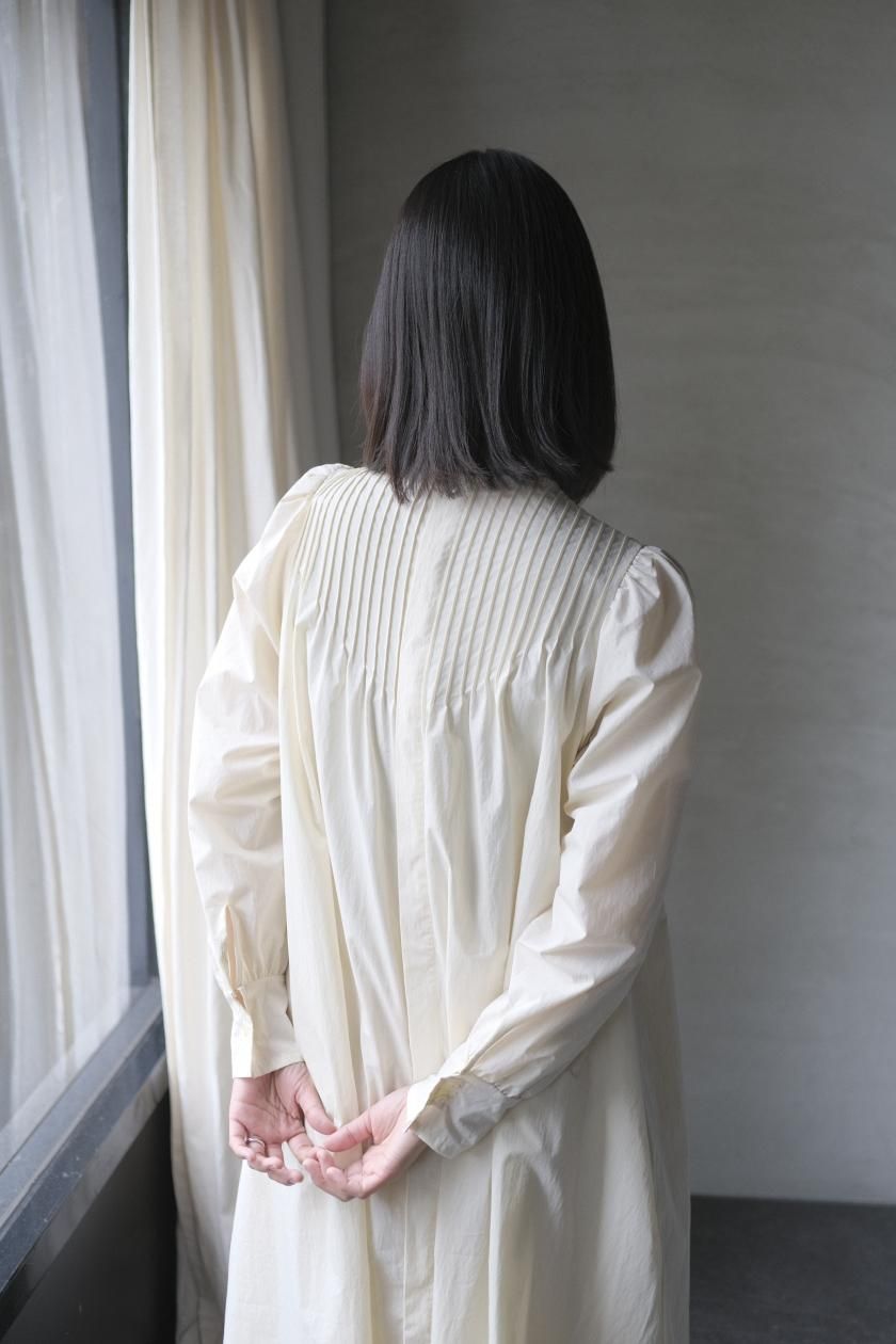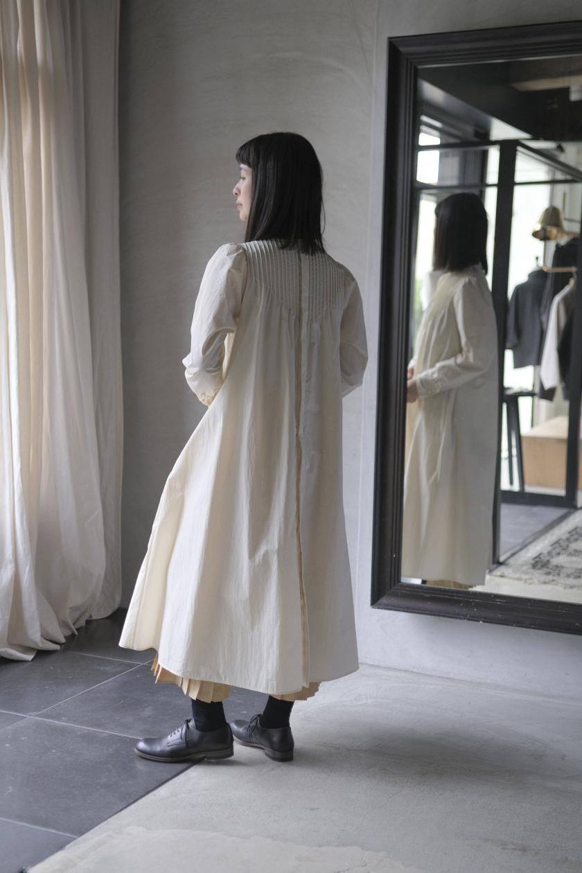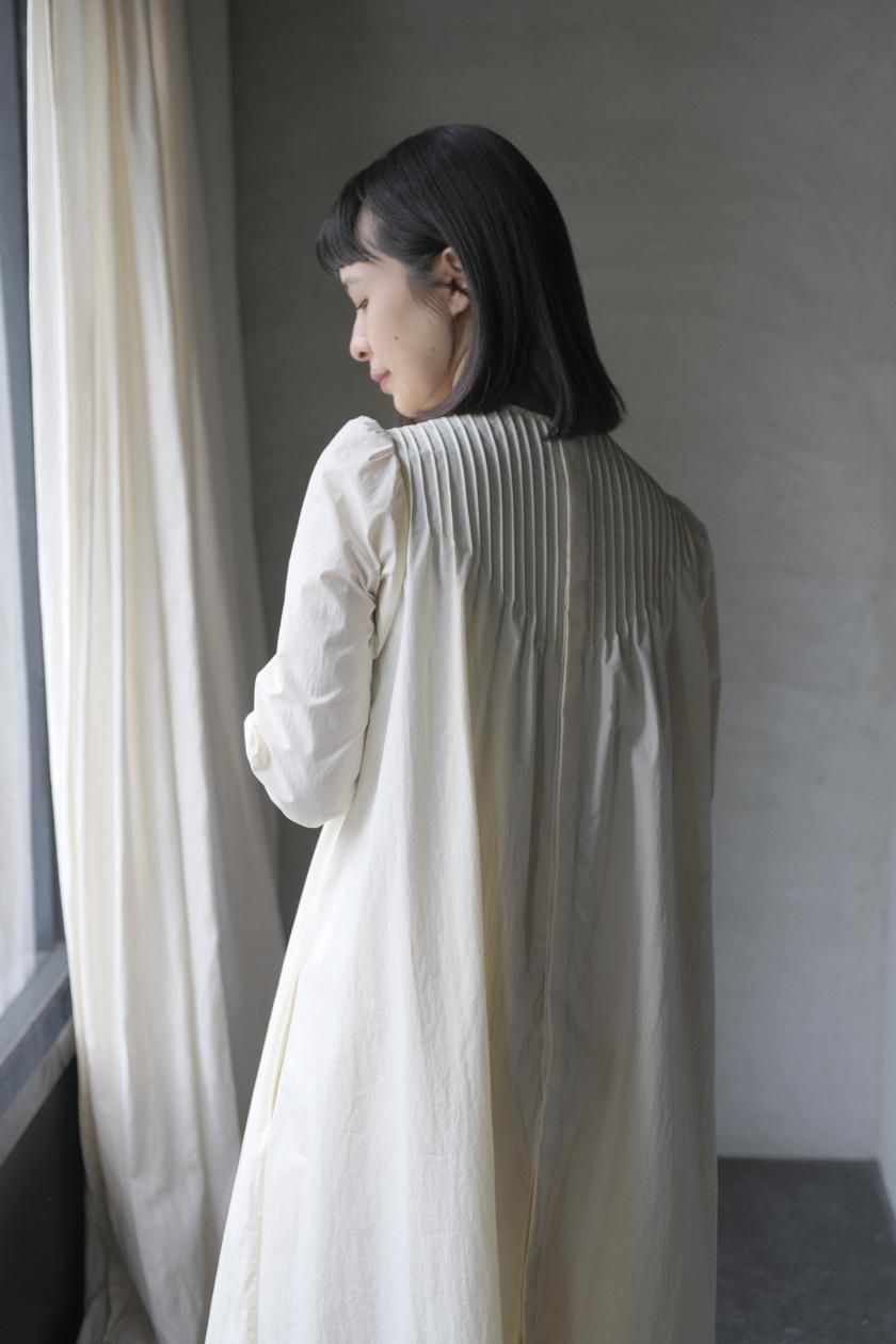 古い時代の彫刻家からインスパイアされた、前後の胸元に繊細なピンタックが並んだロング丈のワンピースです。後ろ開きでワンピースとして、前開きで羽織物としてもお召しいただけます。