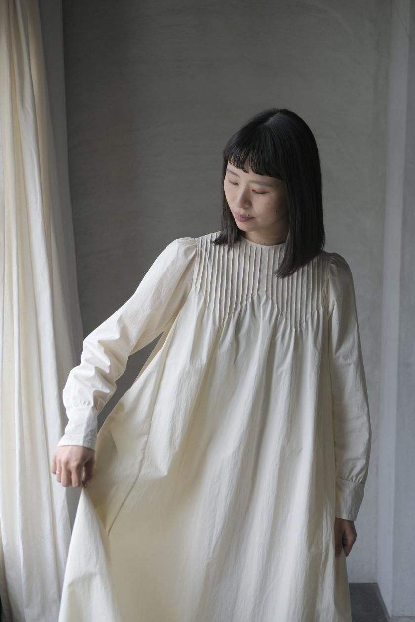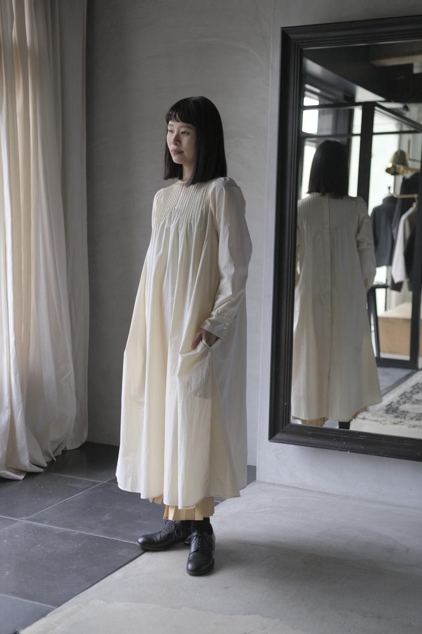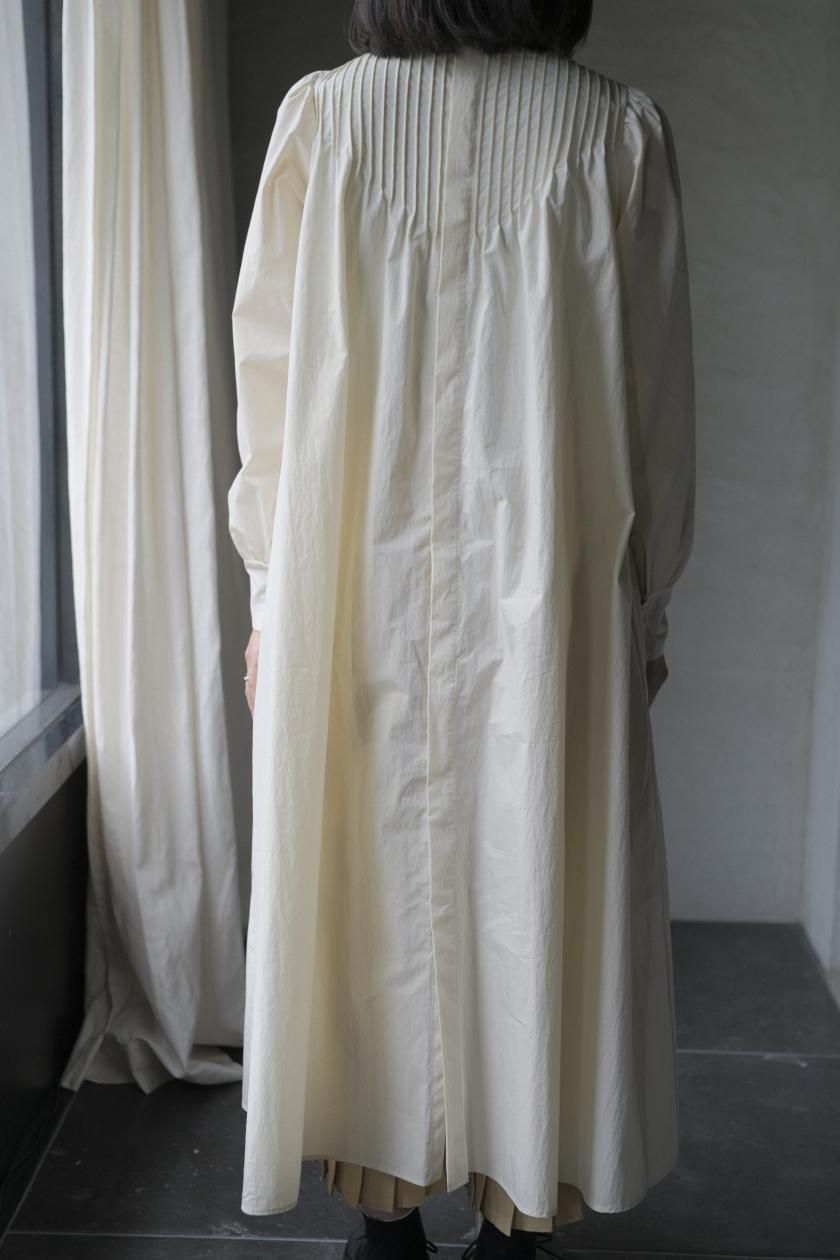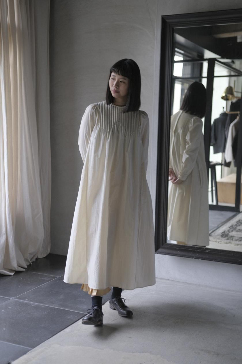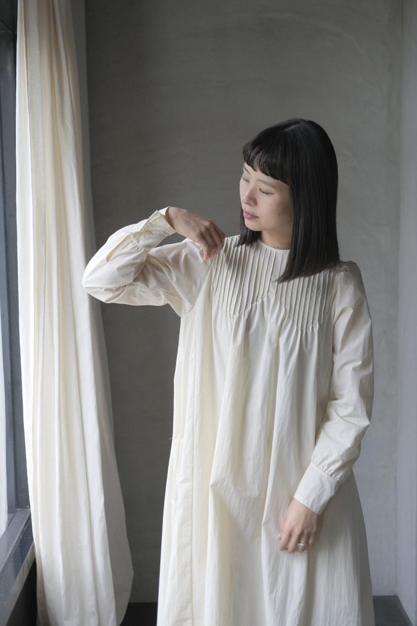 古い時代の彫刻家からインスパイアされた、前後の胸元に繊細なピンタックが並んだロング丈のワンピースです。後ろ開きでワンピースとして、前開きで羽織物としてもお召しいただけます。
