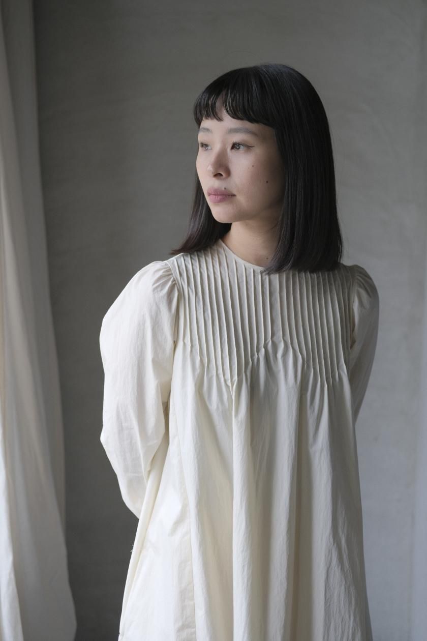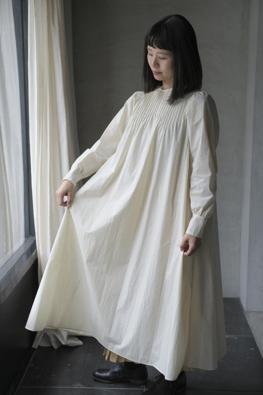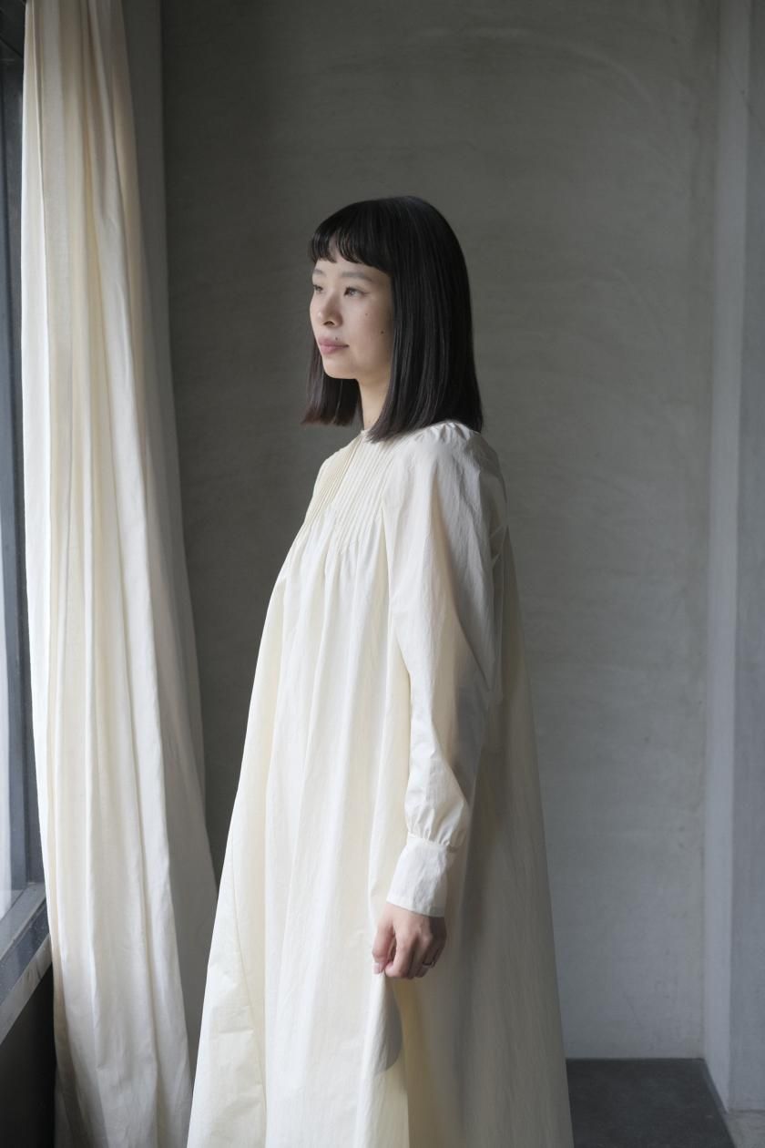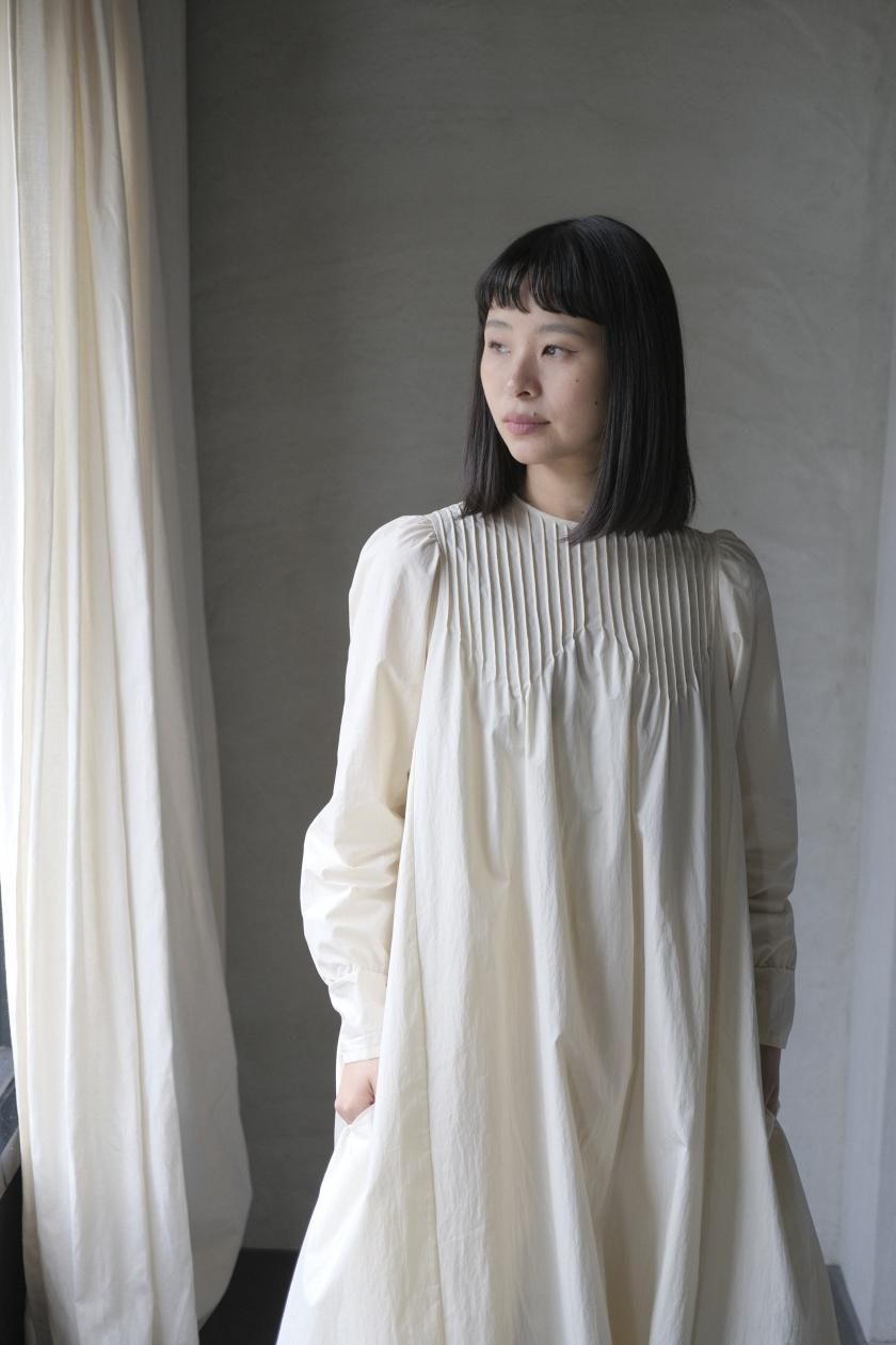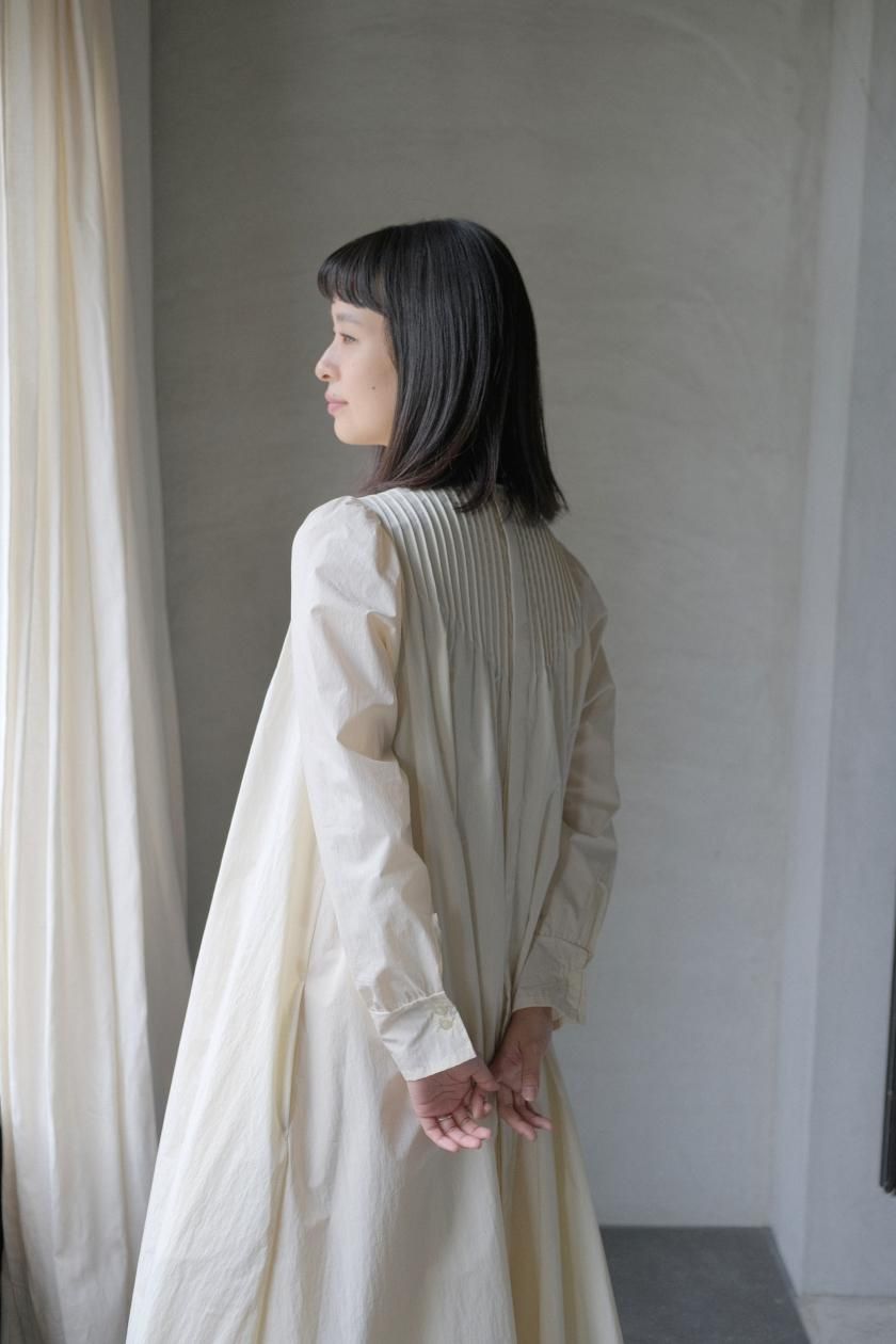 古い時代の彫刻家からインスパイアされた、前後の胸元に繊細なピンタックが並んだロング丈のワンピースです。後ろ開きでワンピースとして、前開きで羽織物としてもお召しいただけます。