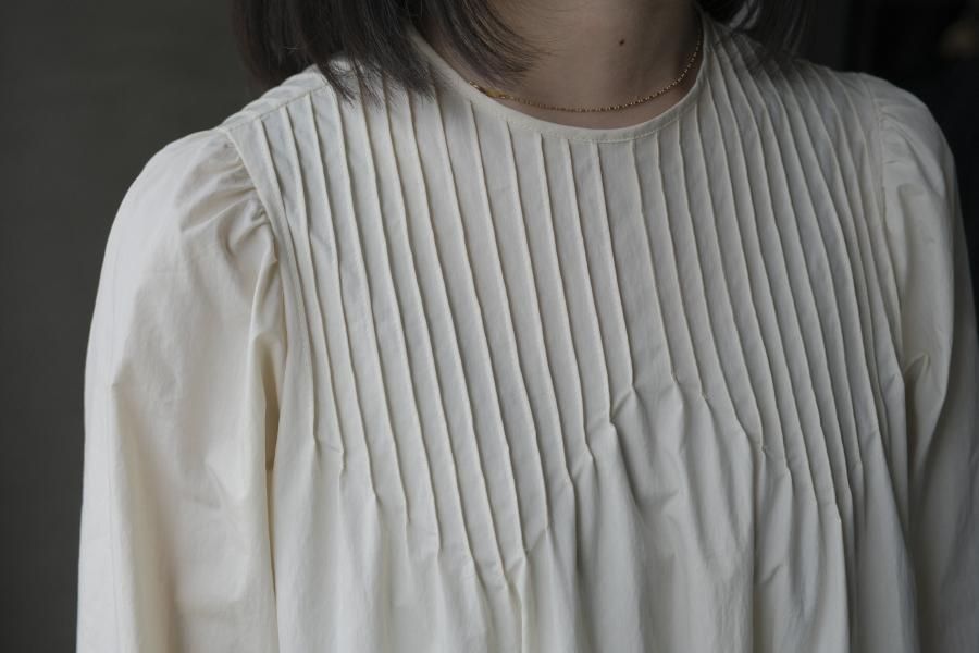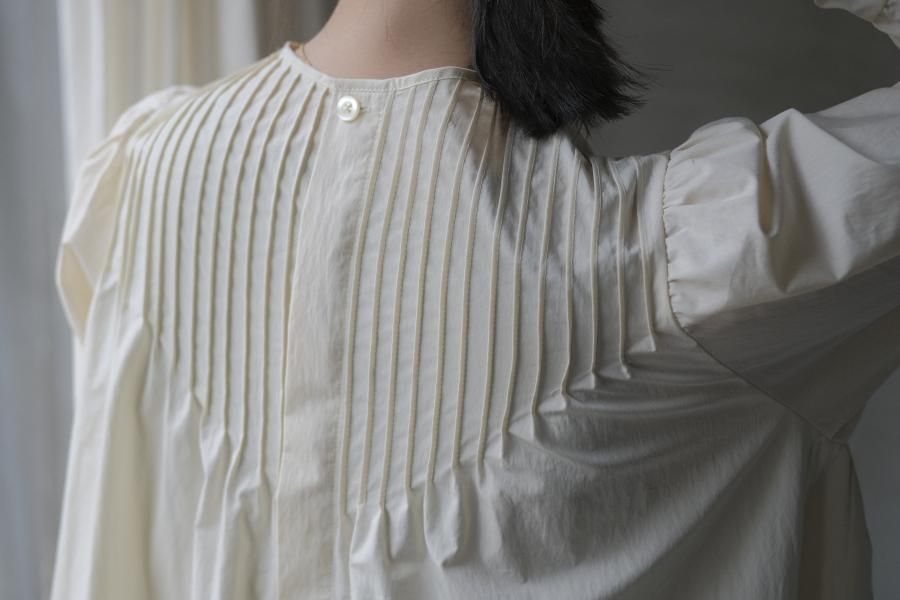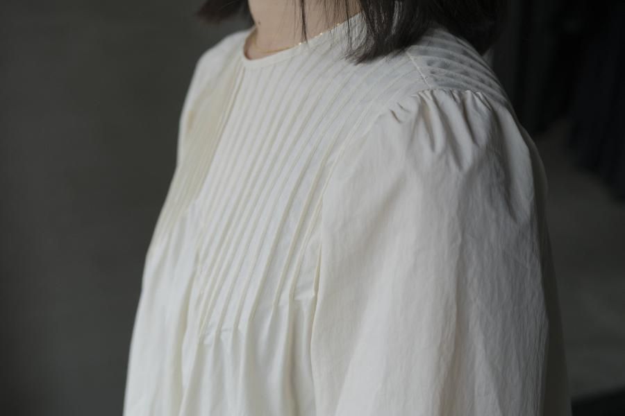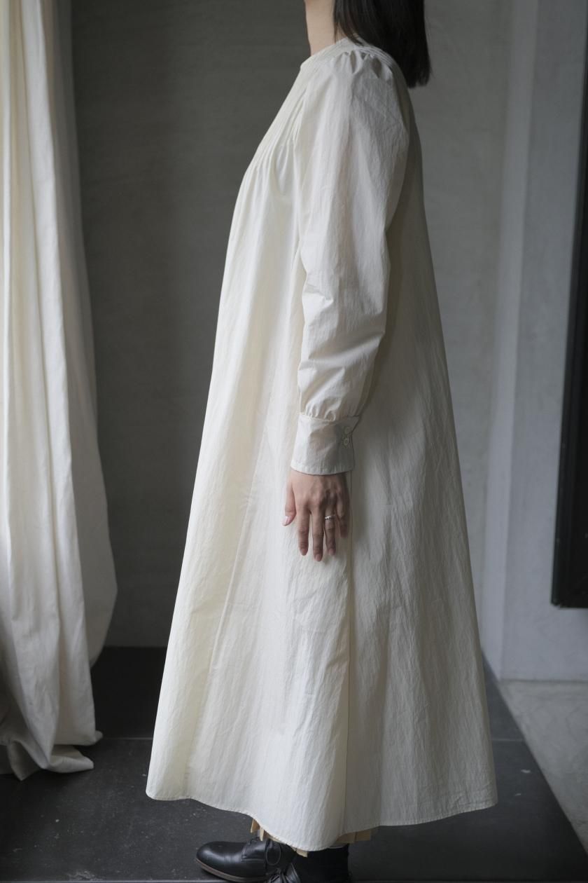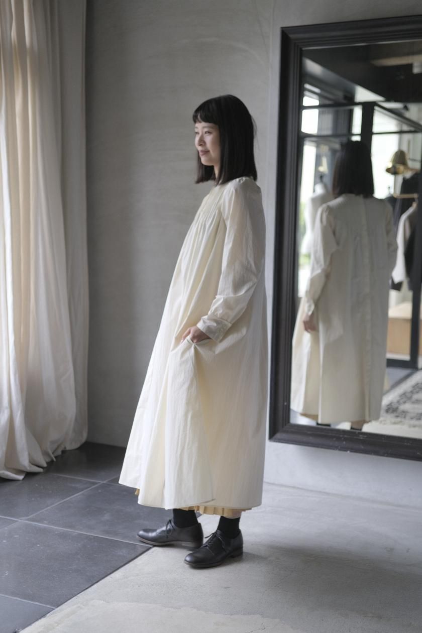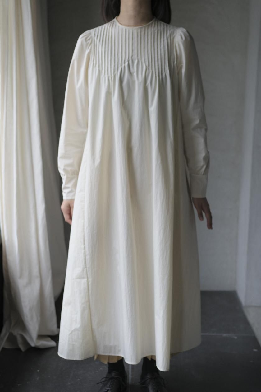 古い時代の彫刻家からインスパイアされた、前後の胸元に繊細なピンタックが並んだロング丈のワンピースです。後ろ開きでワンピースとして、前開きで羽織物としてもお召しいただけます。