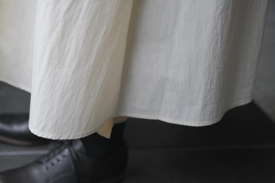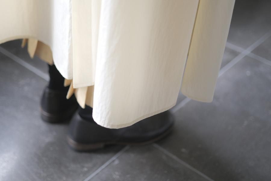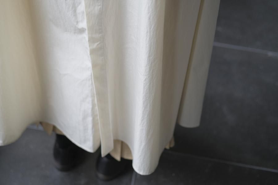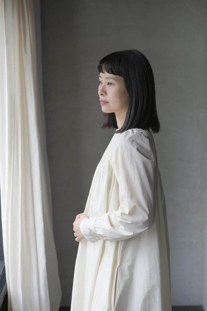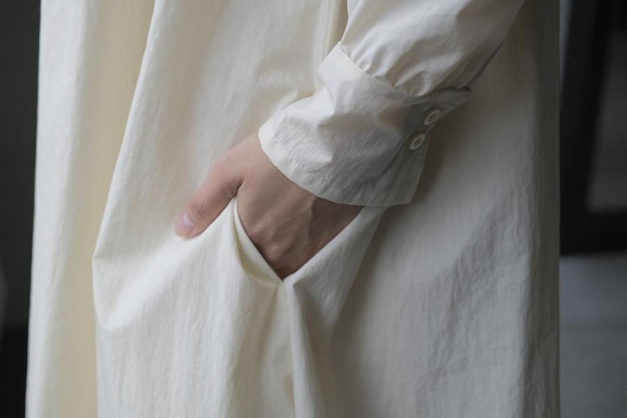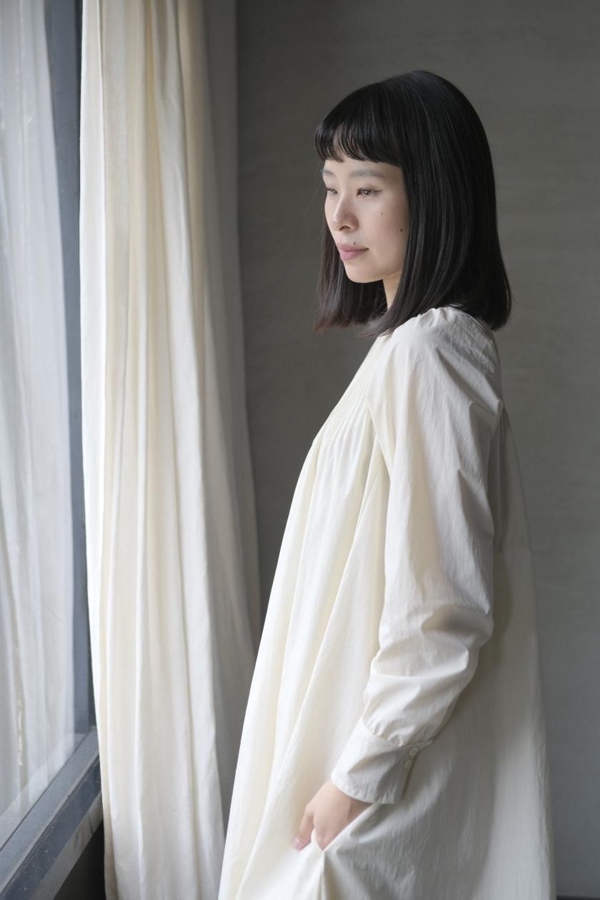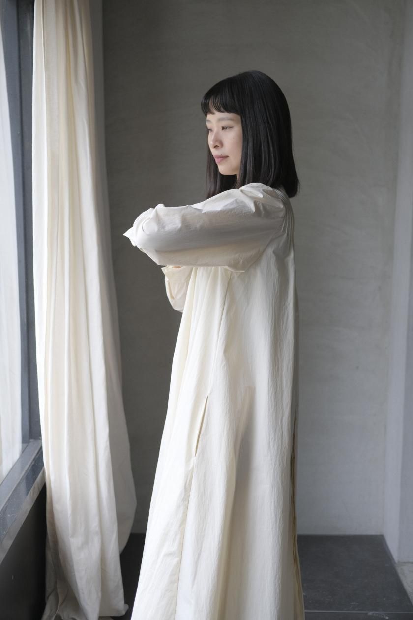 古い時代の彫刻家からインスパイアされた、前後の胸元に繊細なピンタックが並んだロング丈のワンピースです。後ろ開きでワンピースとして、前開きで羽織物としてもお召しいただけます。