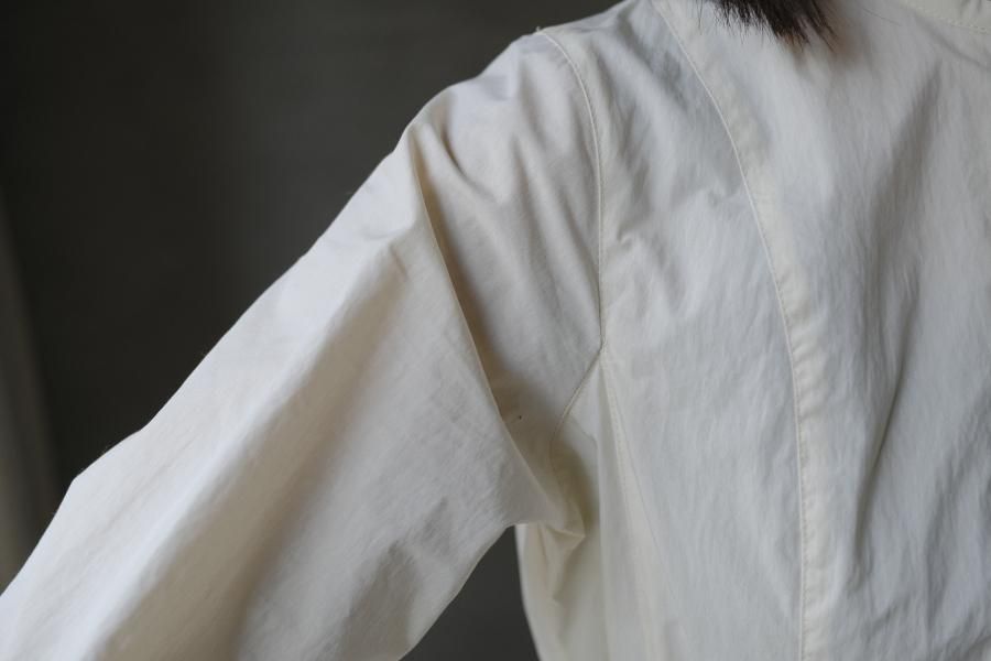 コットンとリサイクルナイロンを高密度に織り、縦横の色を変えて奥行きのある色目の染め上げ。シボ感のある