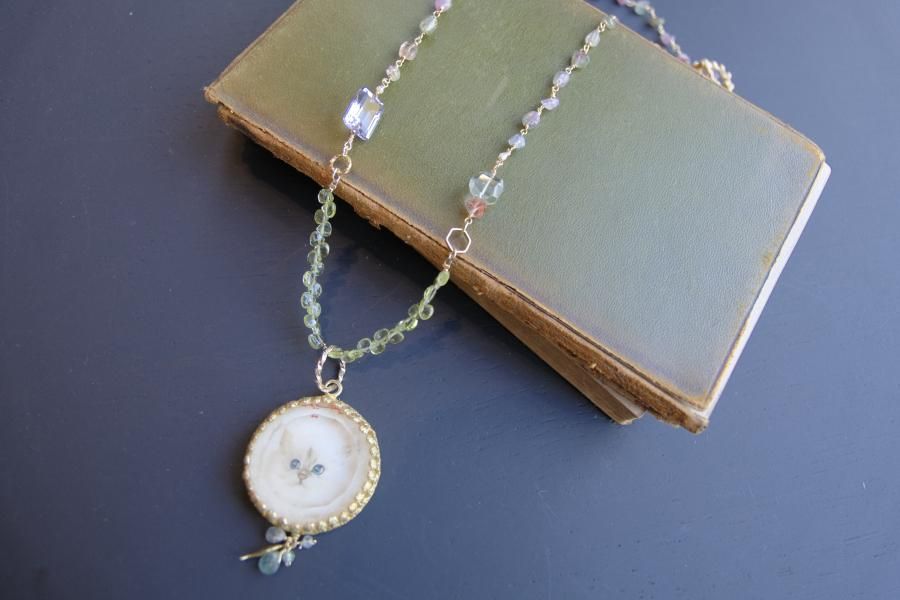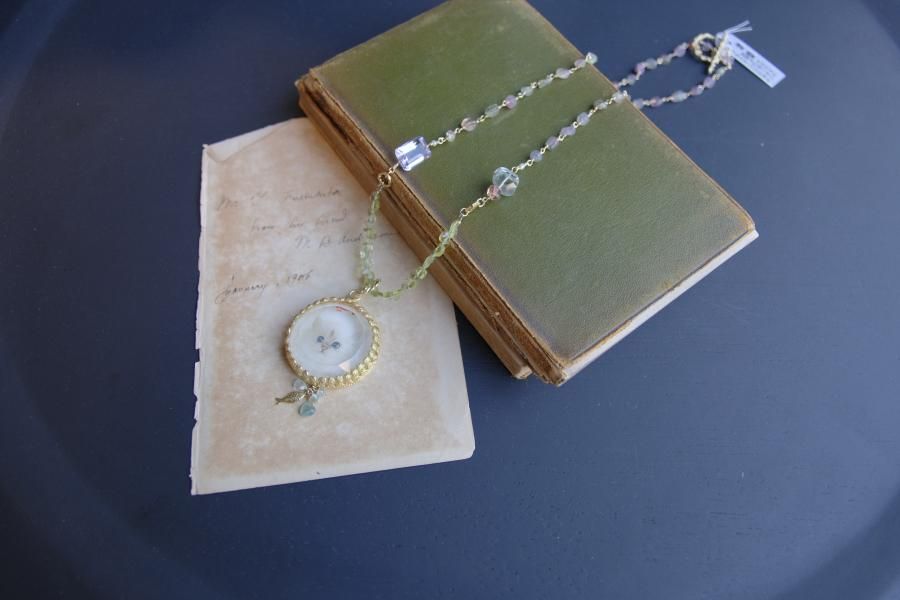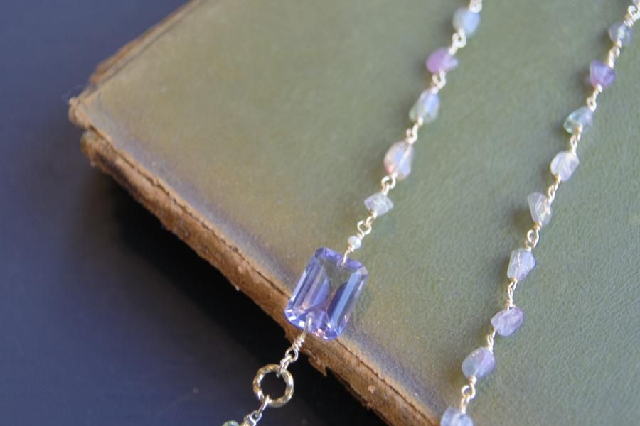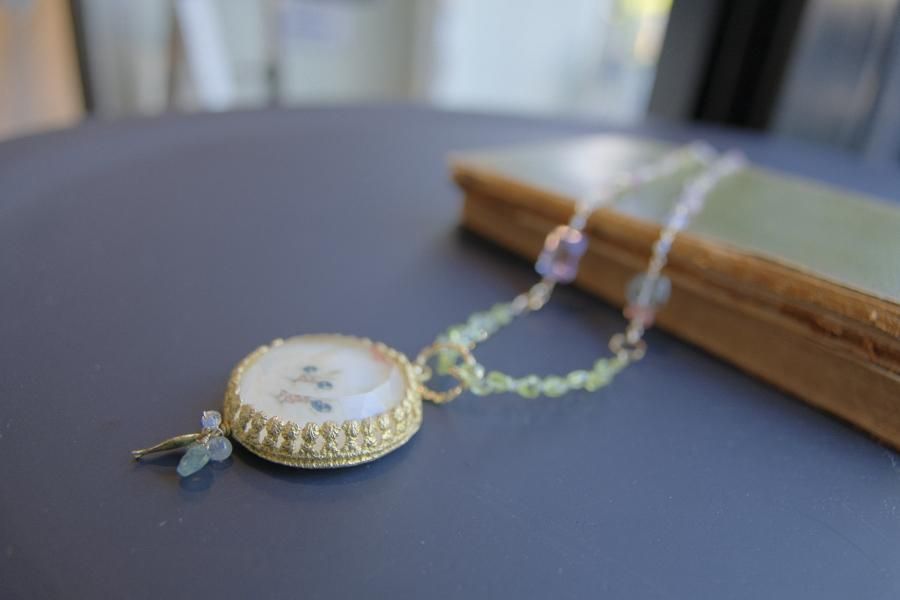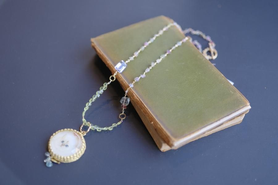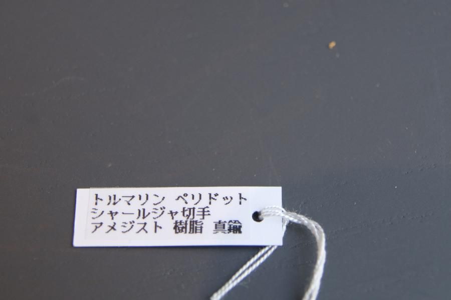チェーンはパール、珊瑚、クォーツ(水晶)などの天然石を使用しており、