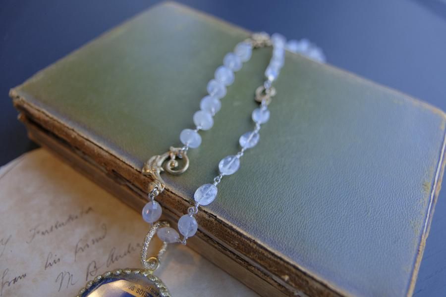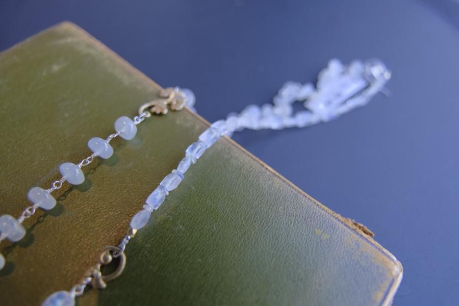 チェーンはパール、珊瑚、クォーツ(水晶)などの天然石を使用しており、
