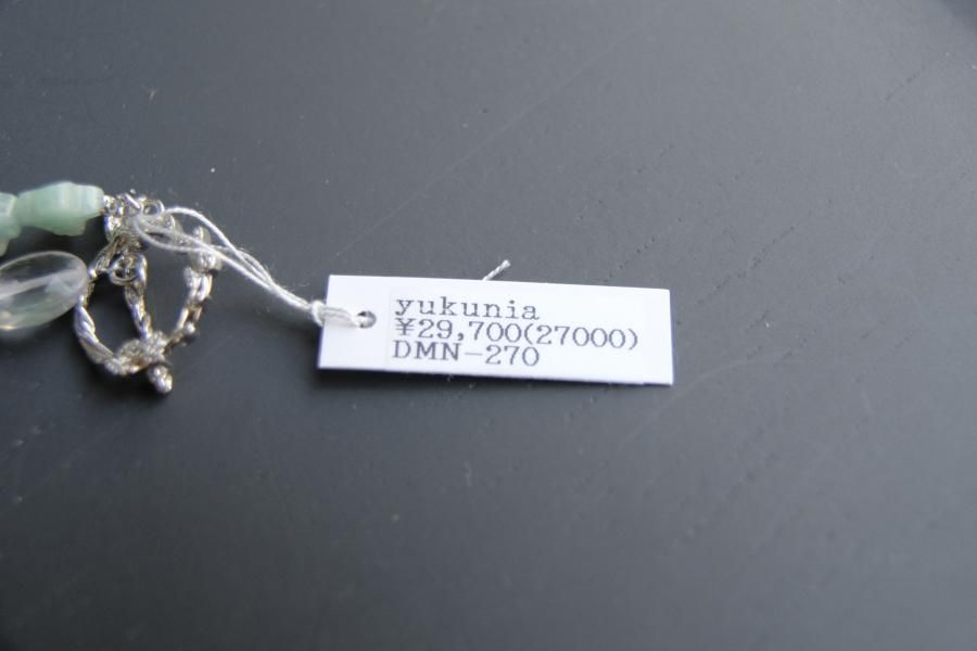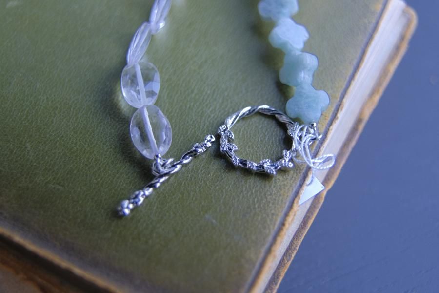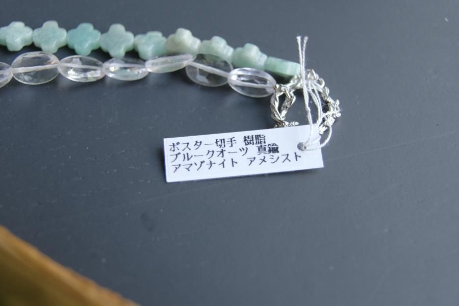 チェーンはパール、珊瑚、クォーツ(水晶)などの天然石を使用しており、