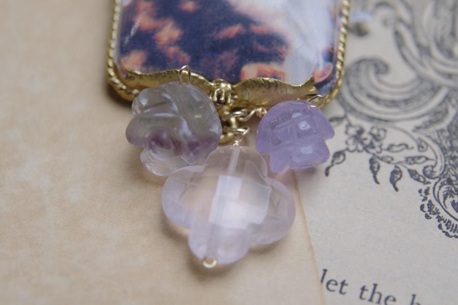 チェーンはパール、珊瑚、クォーツ(水晶)などの天然石を使用しており、