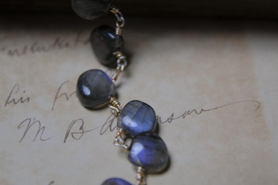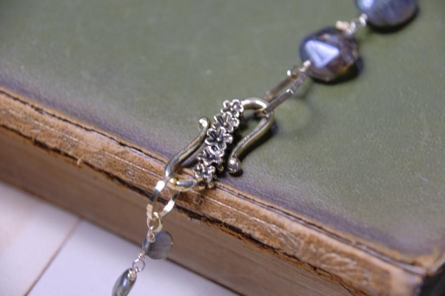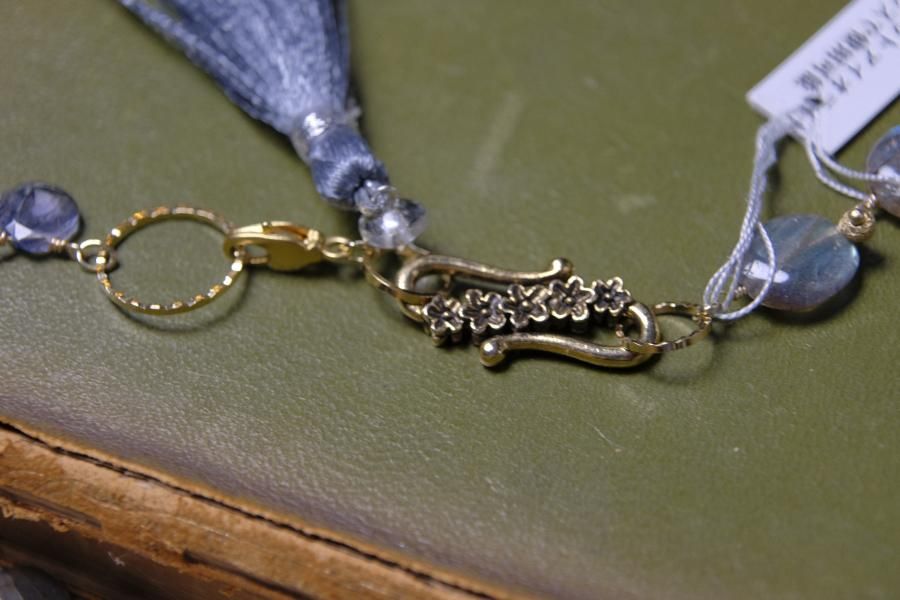 チェーンはパール、珊瑚、クォーツ(水晶)などの天然石を使用しており、