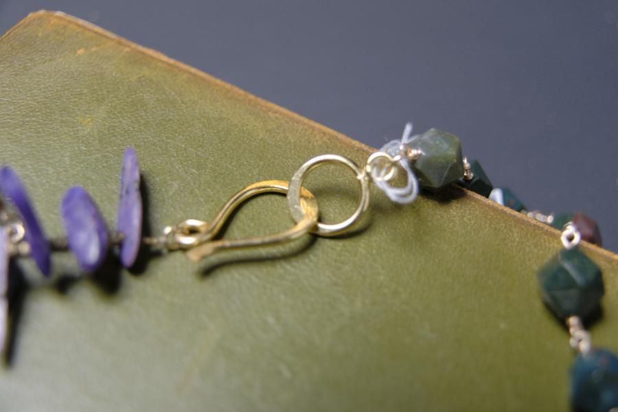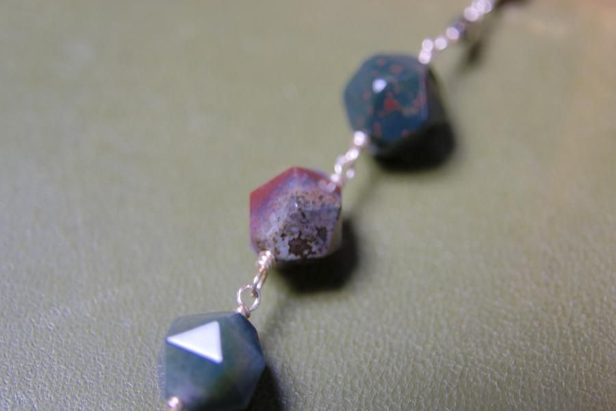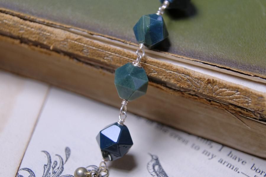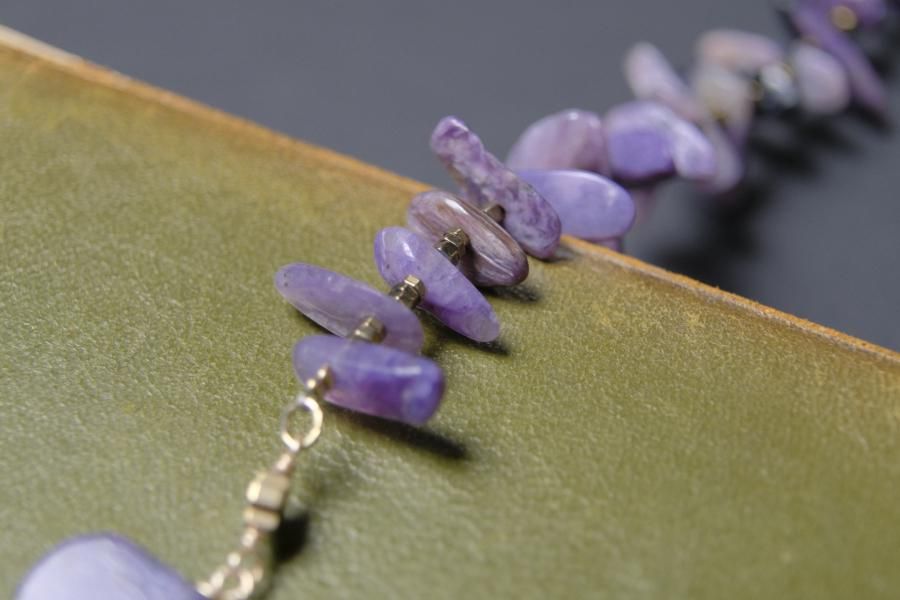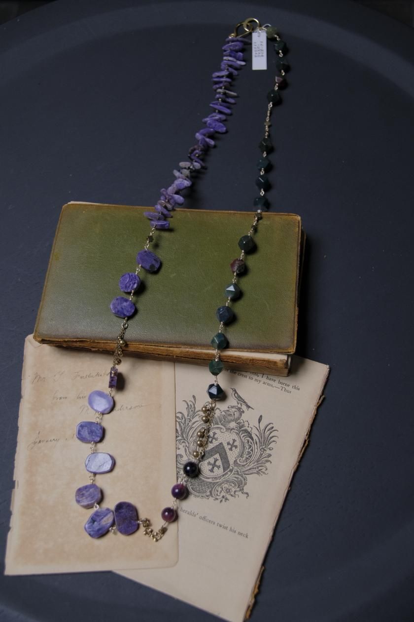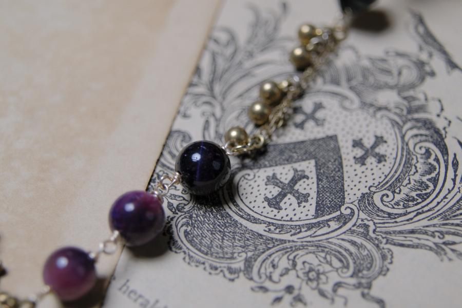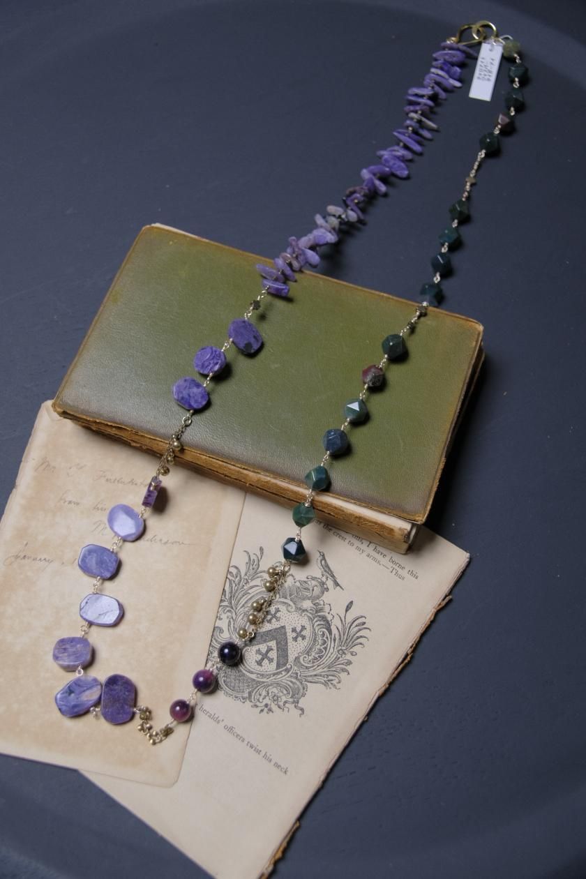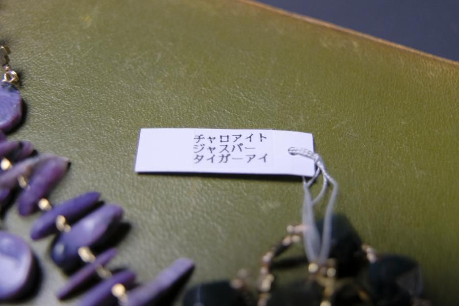 チェーンはパール、珊瑚、クォーツ(水晶)などの天然石を使用しており、