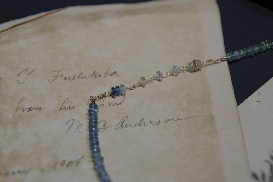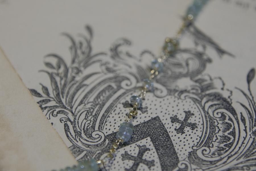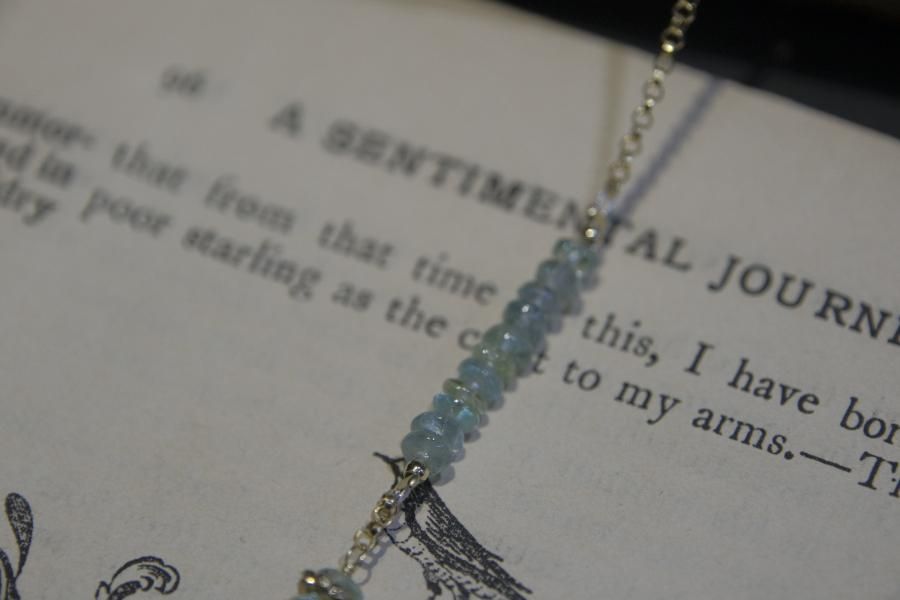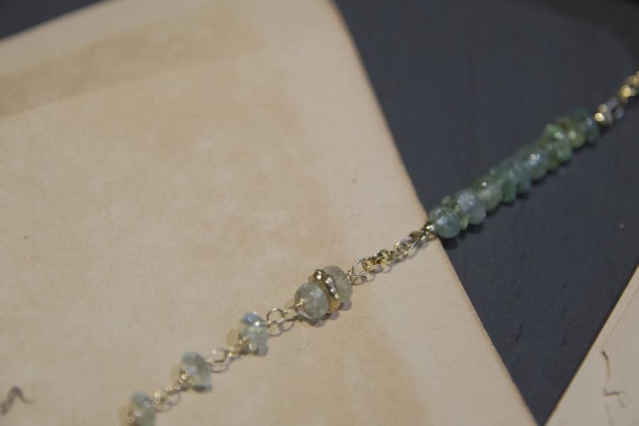 チェーンはパール、珊瑚、クォーツ(水晶)などの天然石を使用しており、