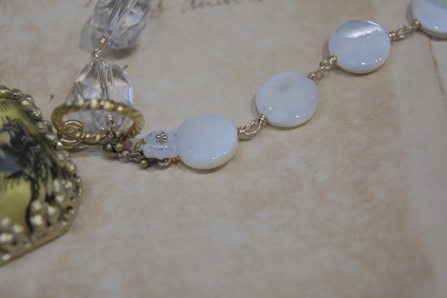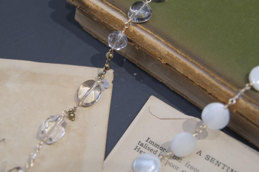 チェーンはパール、珊瑚、クォーツ(水晶)などの天然石を使用しており、