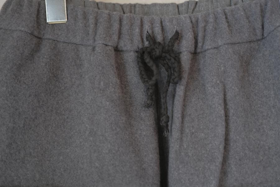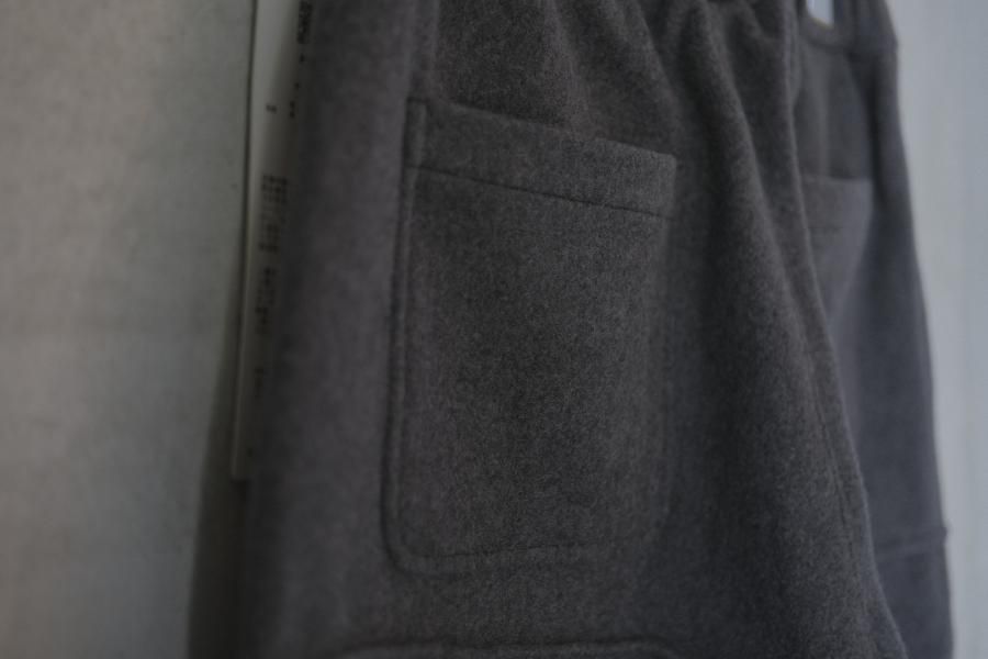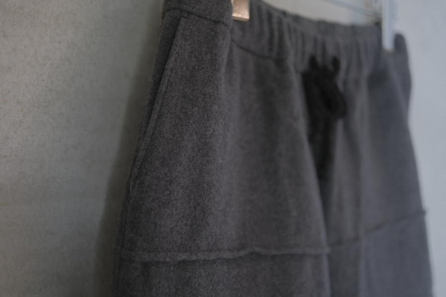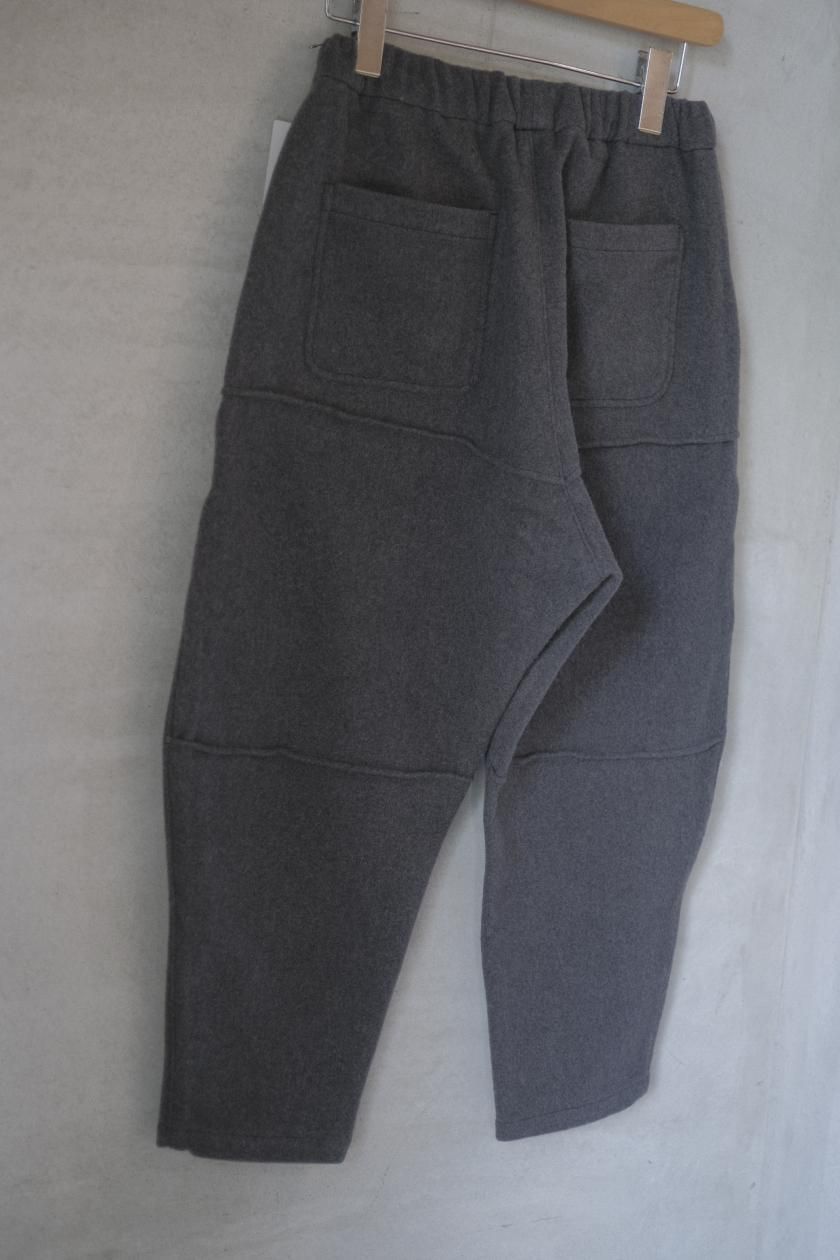 分量感のあるワタリにきつめのテーパードを入れたデザインが特徴的なパンツですが、運動量は確保してあるので動きやすいです。前後に2箇所ずつタックを入れることでより形状をキープしています。ベルト裏・ポケット生地にもウールを使用しています。
