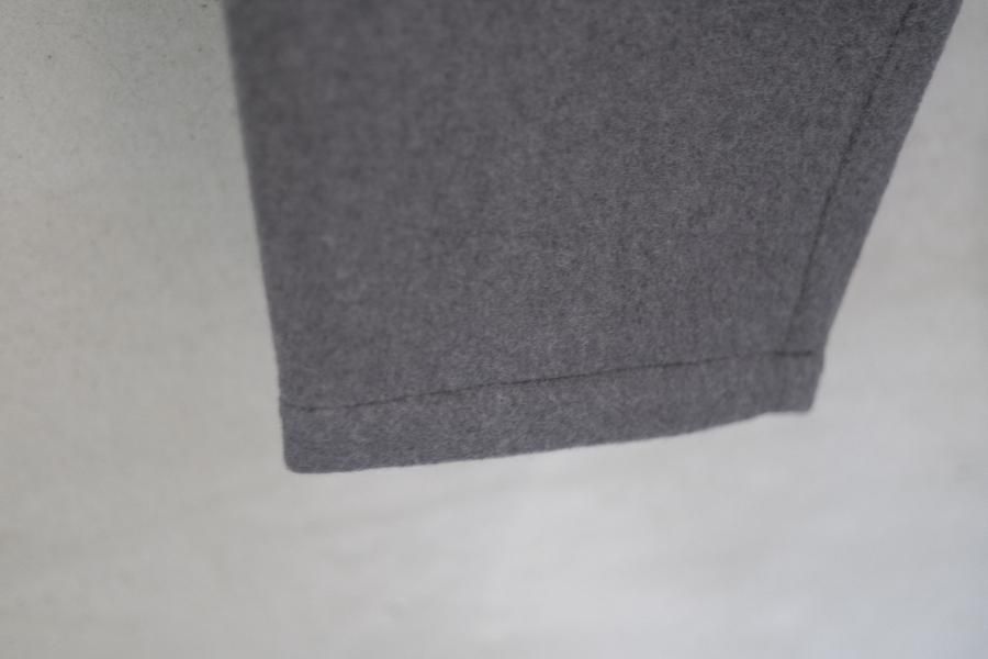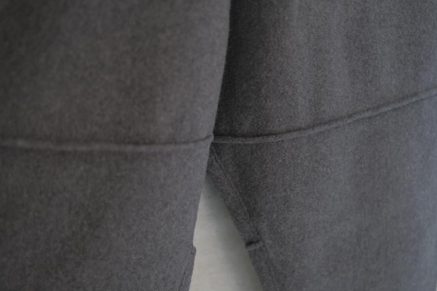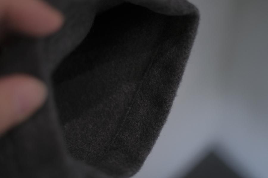 オーストラリア産のラムウール、Super100原料を使用したモッサ(紡毛織物を縮絨後、起毛整理した生地)を使用しています。補強の為のナイロン等の化繊が全く入っておらず非常に柔らかな風合いで、着用による経年変化においても化繊混の生地と比べて硬い毛玉はできません。