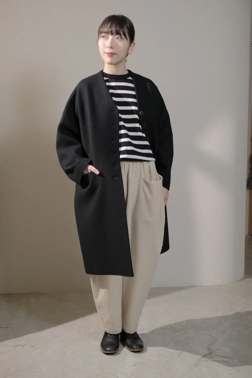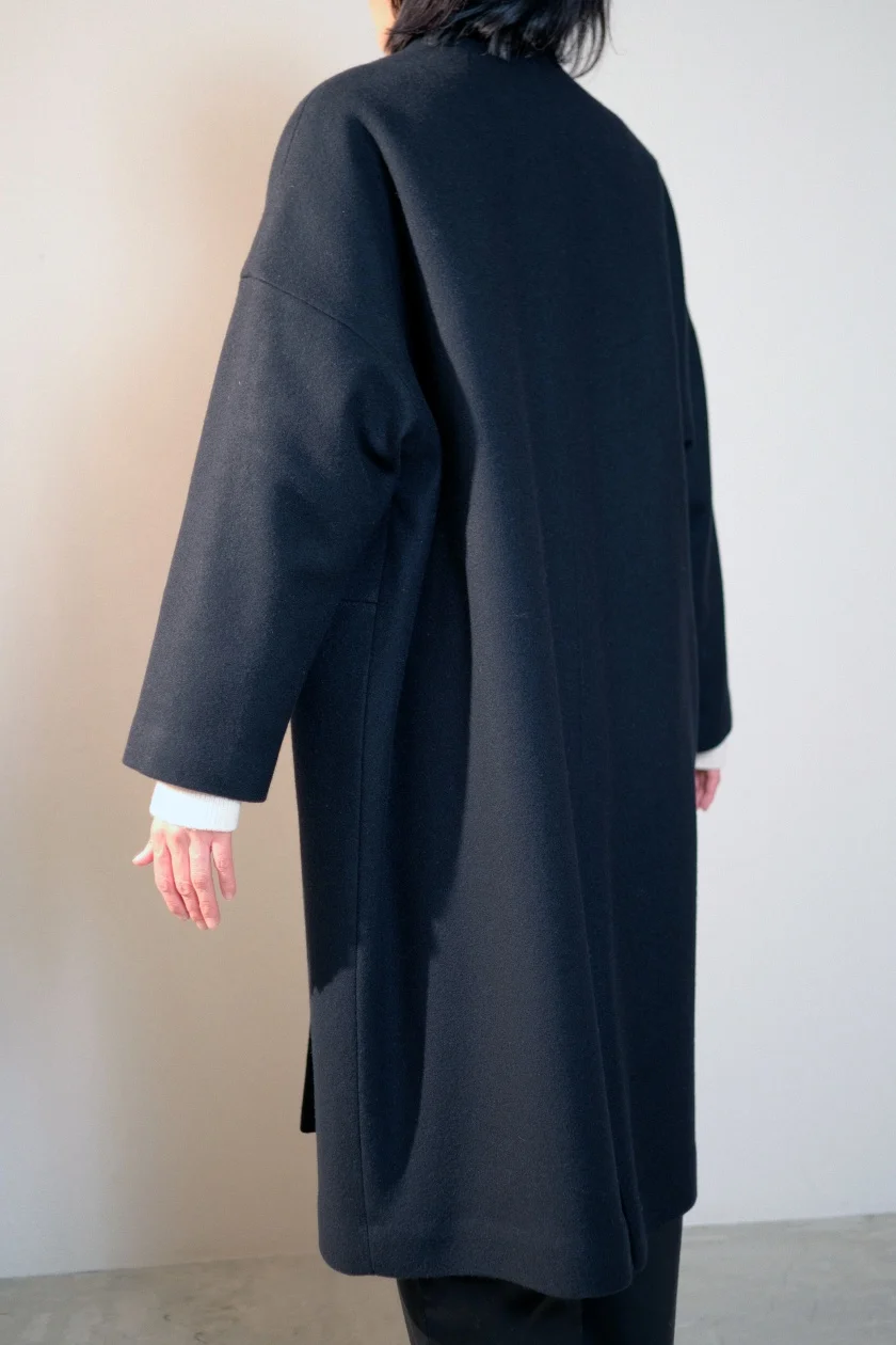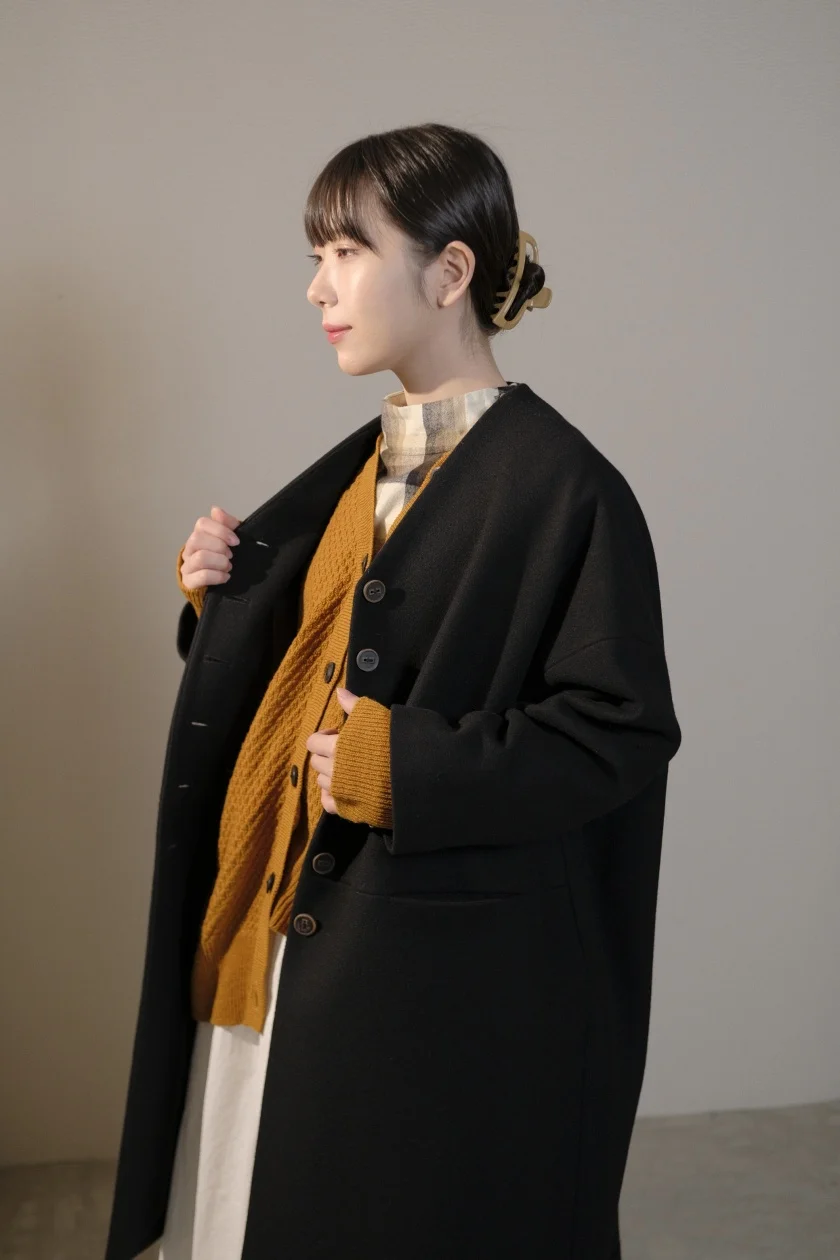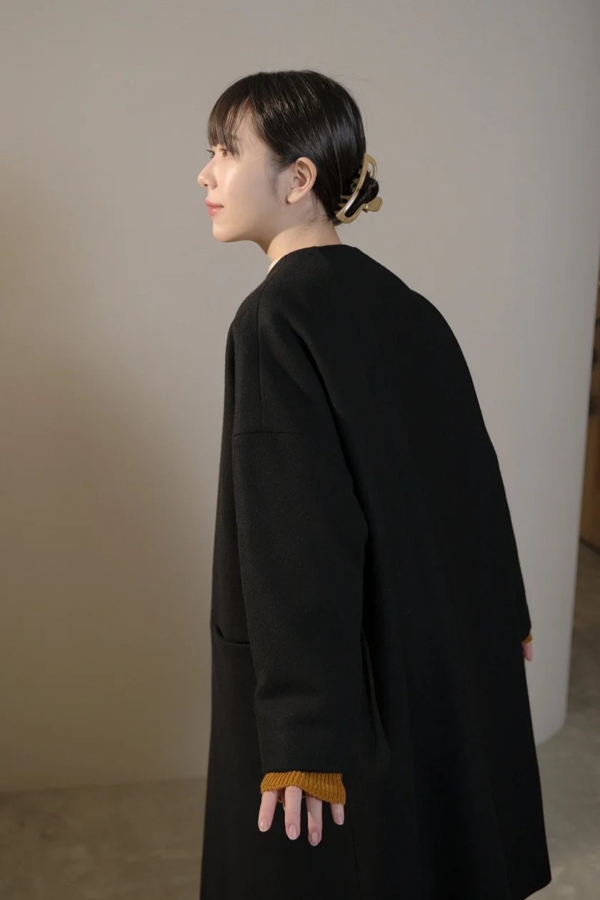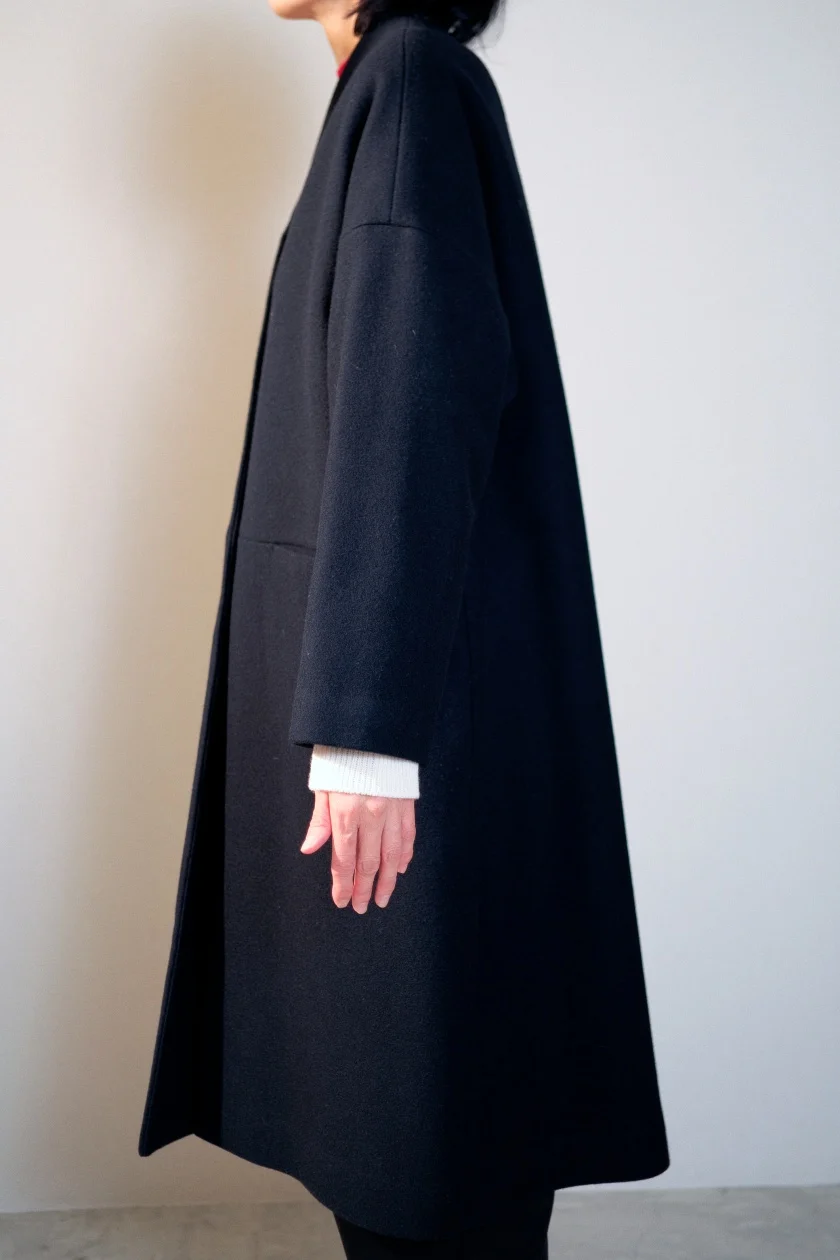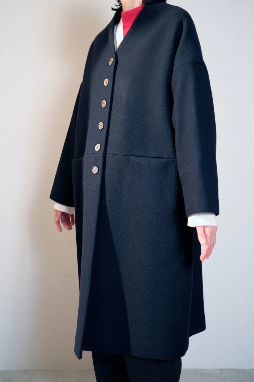 atelier naruse 定番の防寒性にも優れた厚手ウールのV明きコクーン型コート。一生ものの上質なメルトンウールコートです。