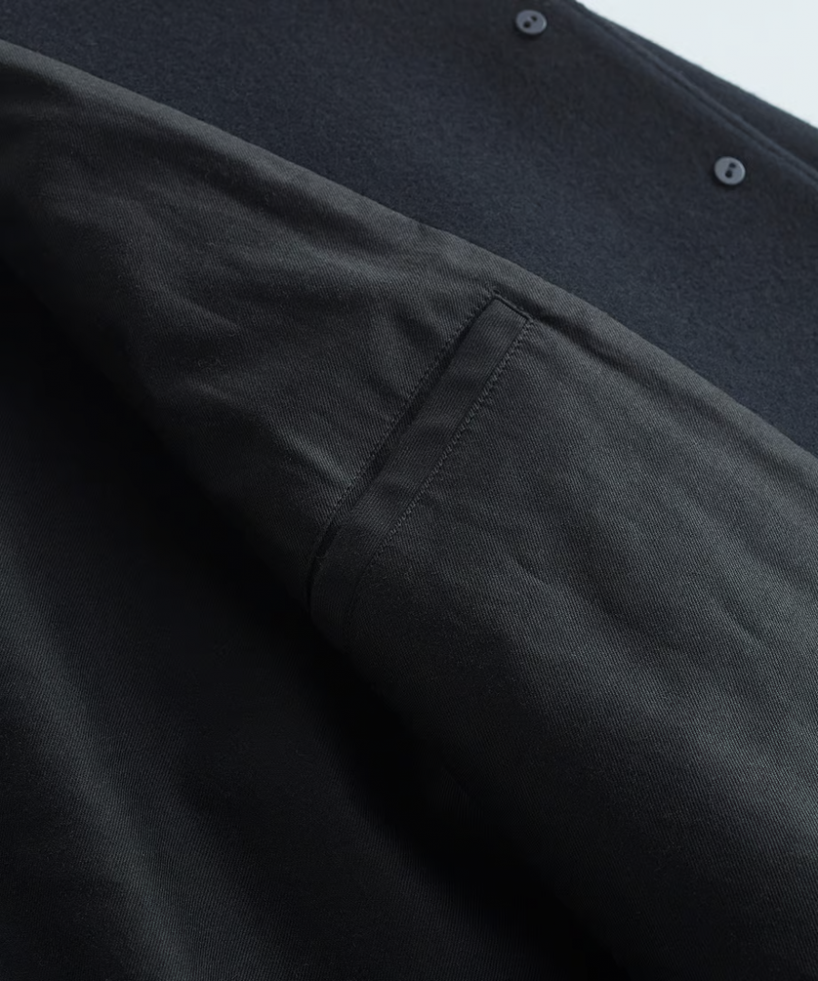 ・使用している生地は、super100’sウールが原料の繊細でなめらかなタッチと上品な光沢感、そして、毛羽立ちの少ないしっとりとした質感の上質なメルトンウール地です。