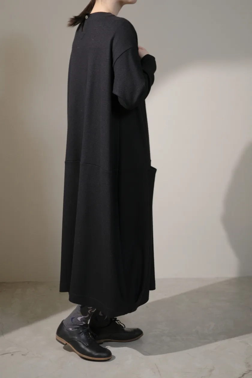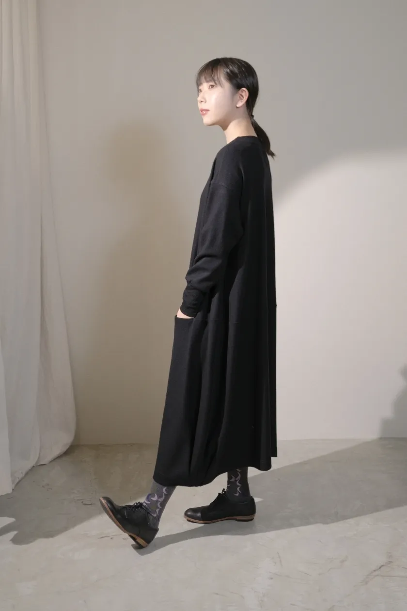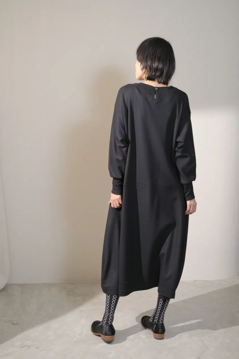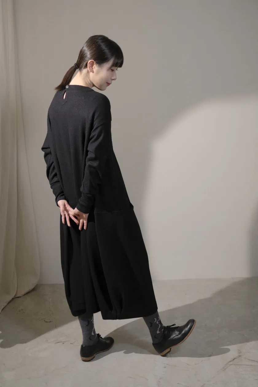 裾にかけてまるくなるコクーン型のラインと、袖リブは長く、袖幅はすっきりとしたきれいなライン。かわいらしさと大人らしさを兼ねそなえたワンピースです。