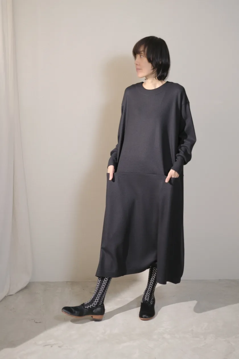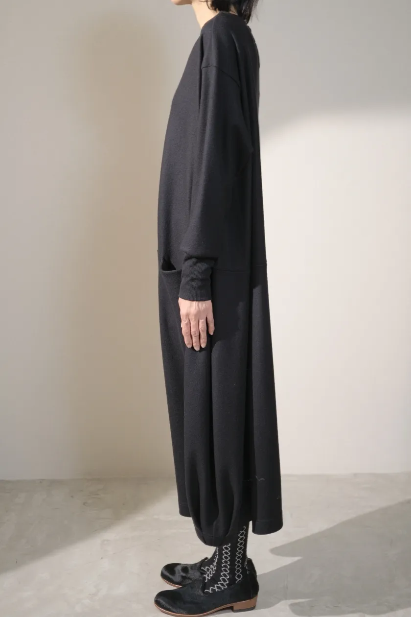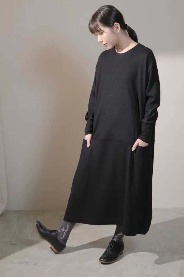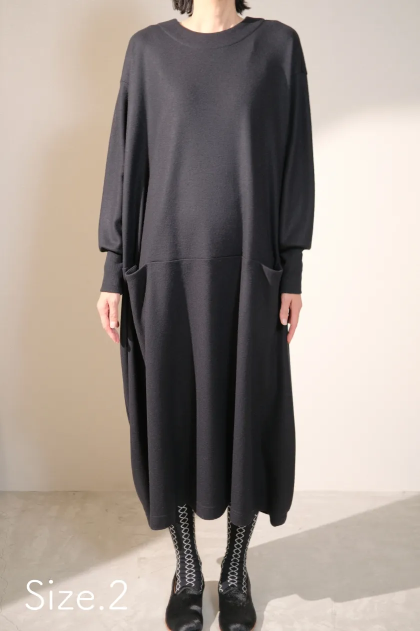 裾にかけてまるくなるコクーン型のラインと、袖リブは長く、袖幅はすっきりとしたきれいなライン。かわいらしさと大人らしさを兼ねそなえたワンピースです。