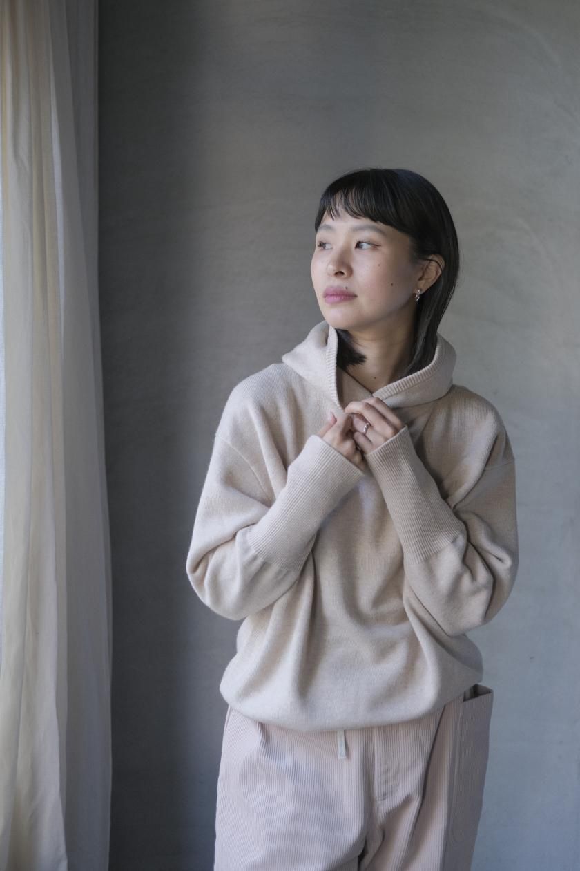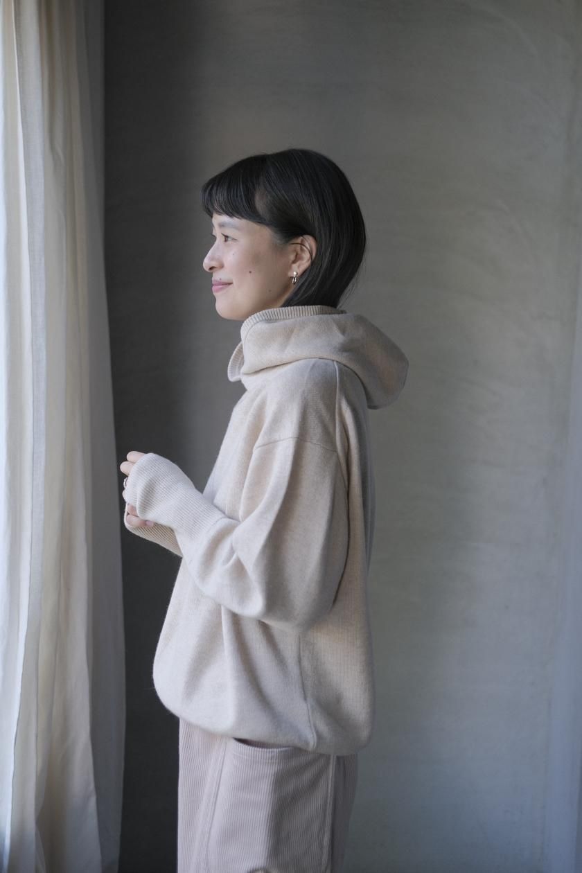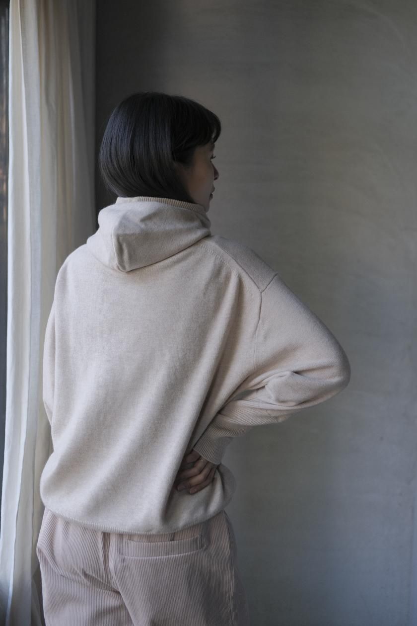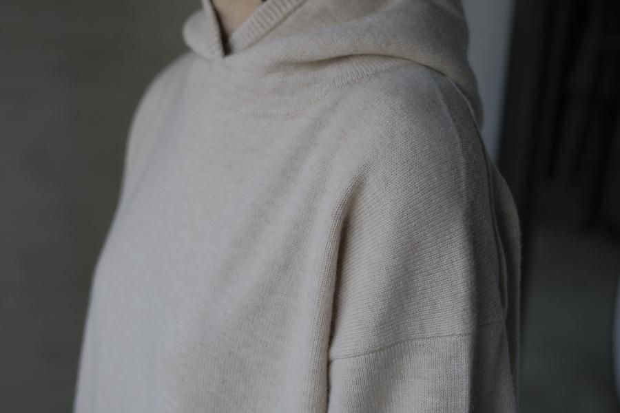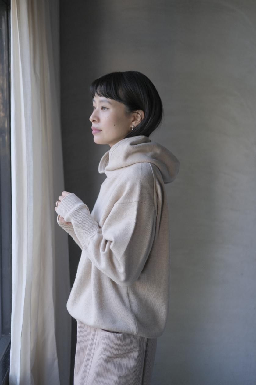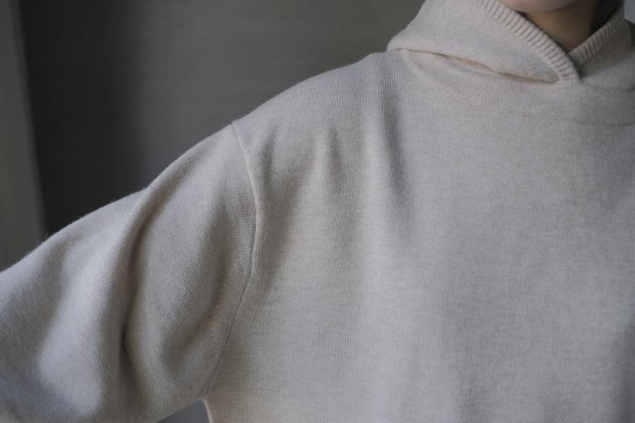 一見シンプルなデザインながら、袖のリブの長さやフードの立ち方、全体のシルエットなど、着用時に「ほかのパーカーとはちがうな」というディテールが立ち上がってくることにこだわったニットパーカーです。