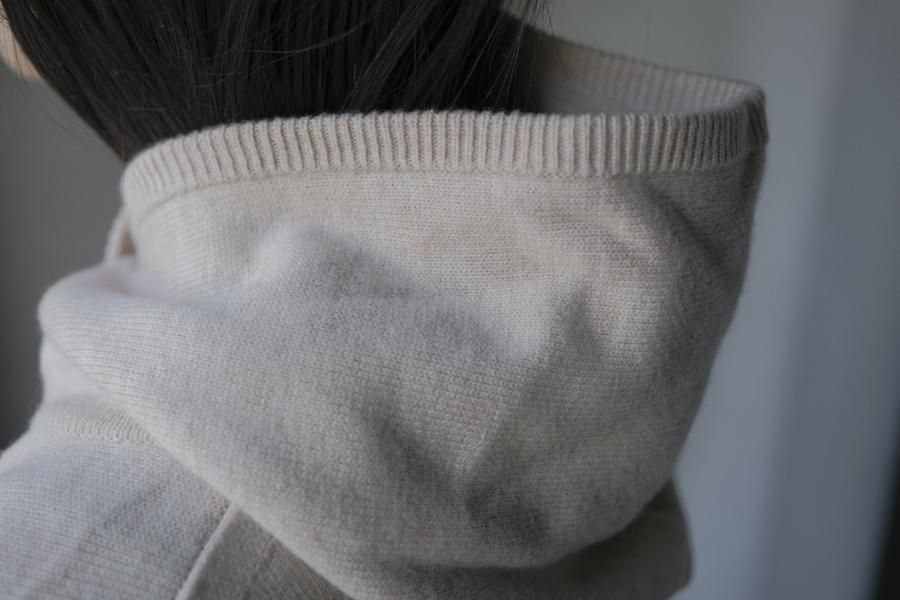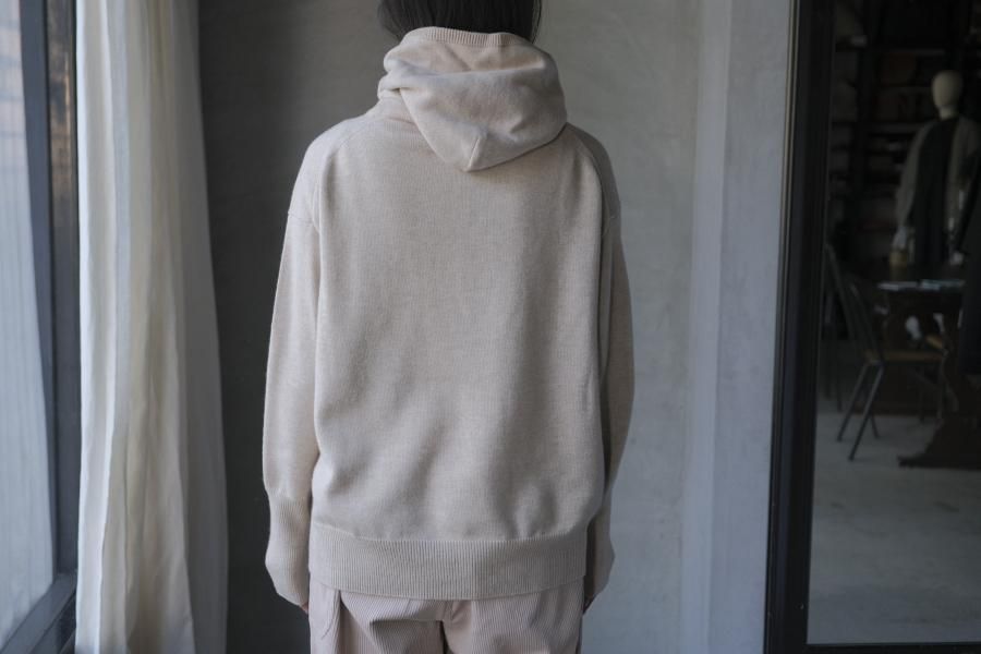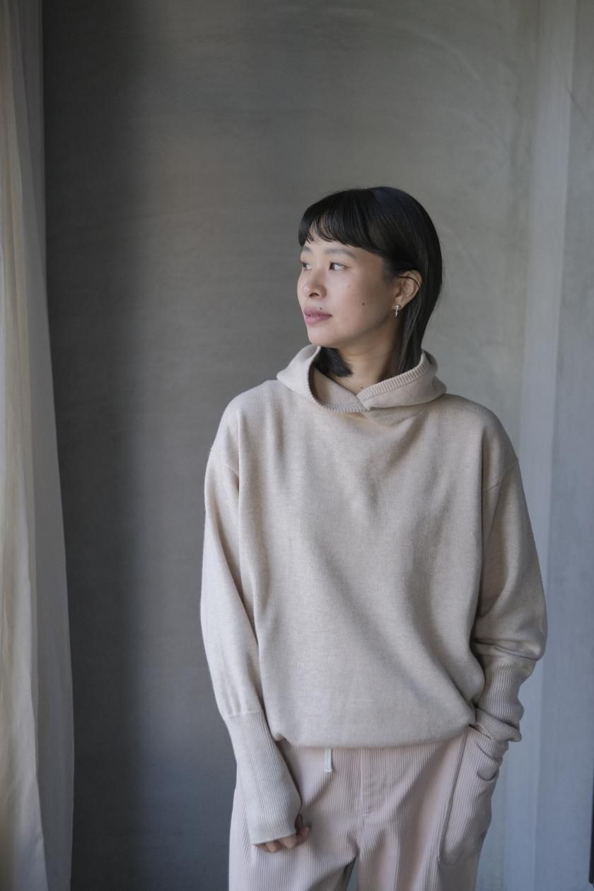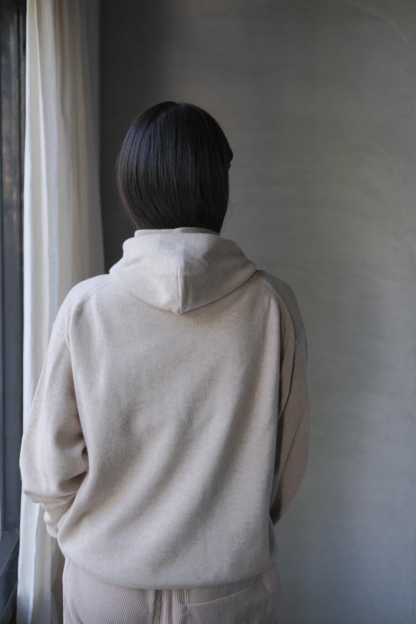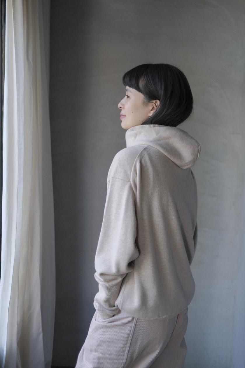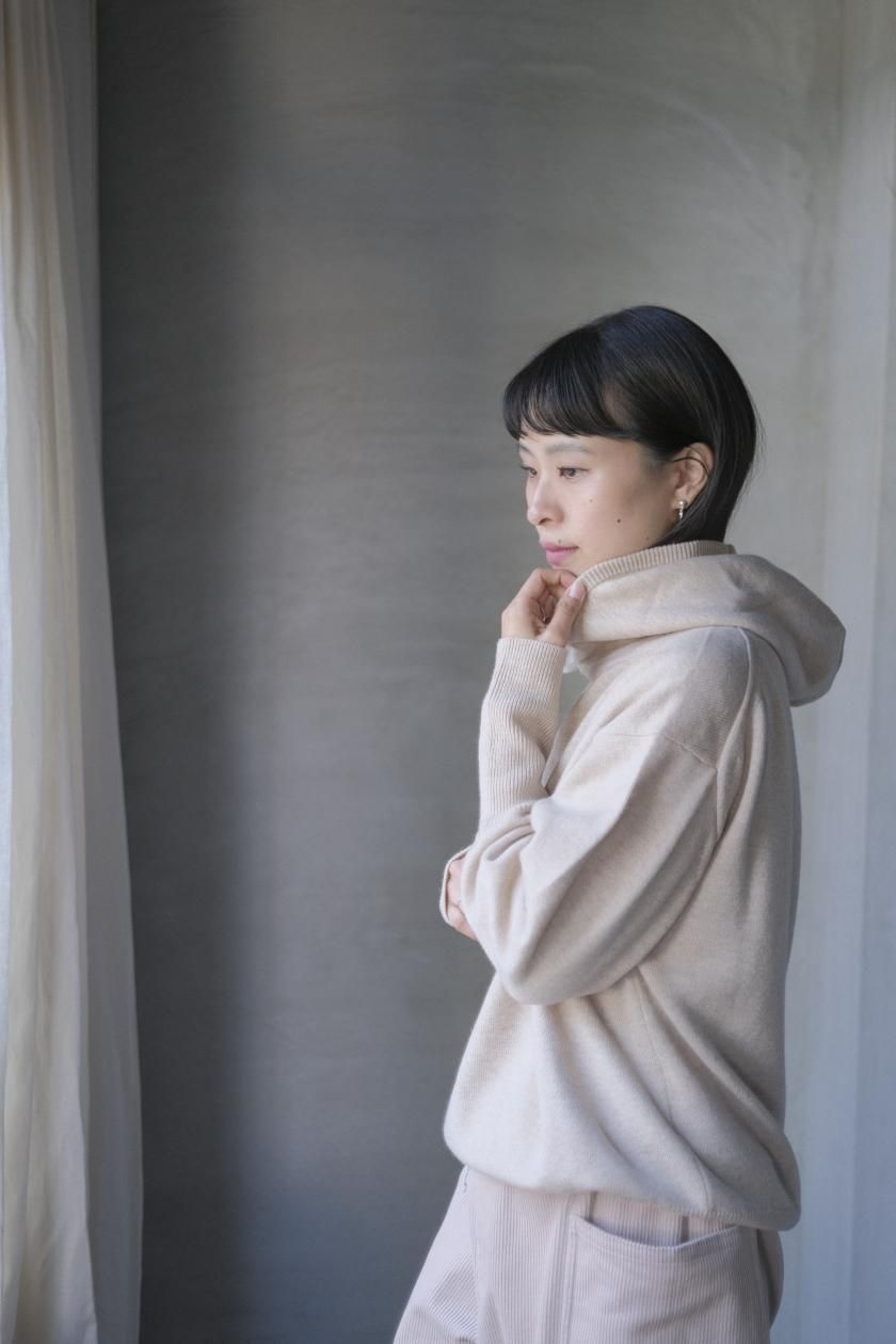 一見シンプルなデザインながら、袖のリブの長さやフードの立ち方、全体のシルエットなど、着用時に「ほかのパーカーとはちがうな」というディテールが立ち上がってくることにこだわったニットパーカーです。