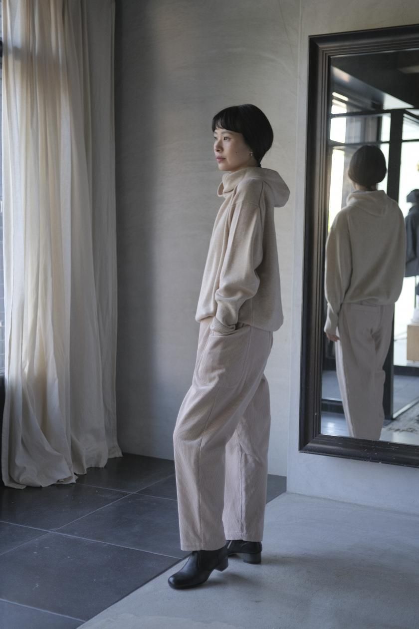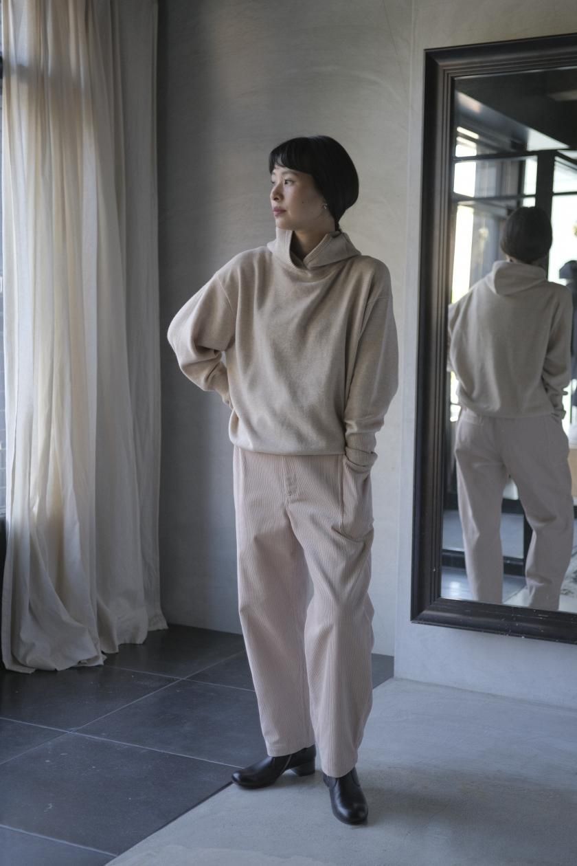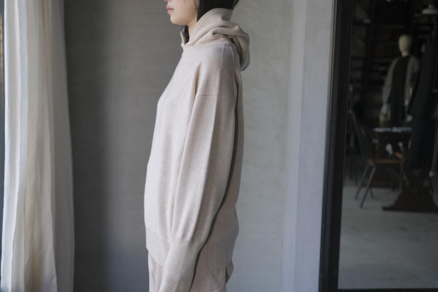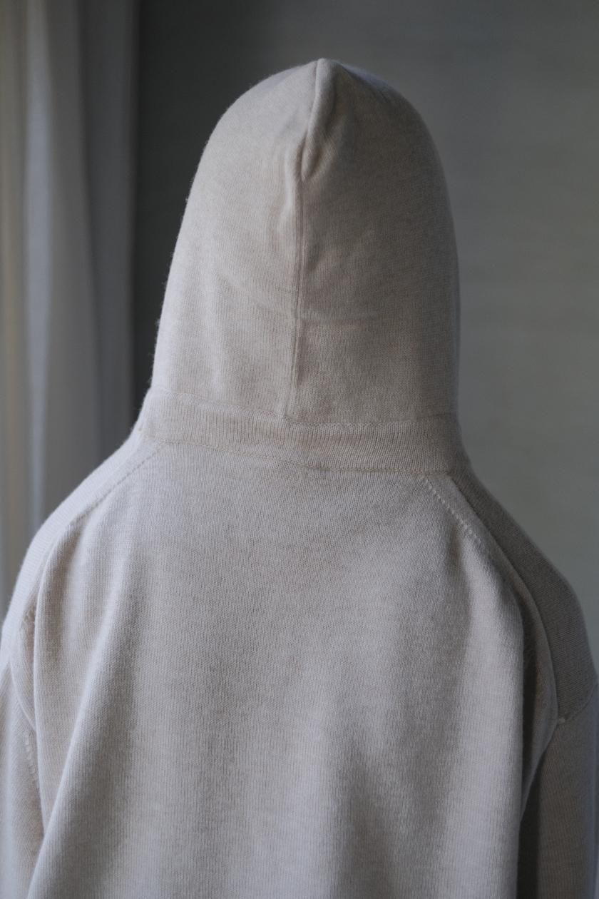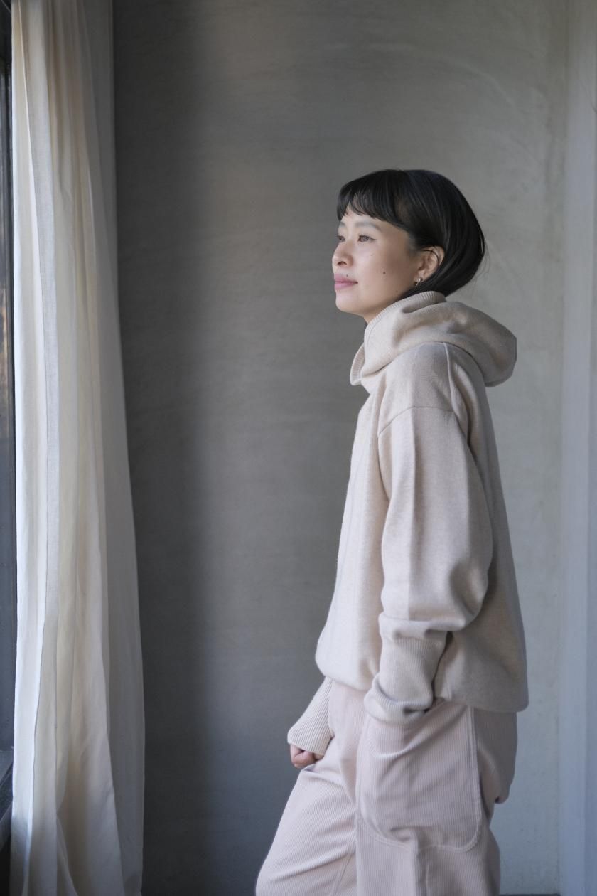 一見シンプルなデザインながら、袖のリブの長さやフードの立ち方、全体のシルエットなど、着用時に「ほかのパーカーとはちがうな」というディテールが立ち上がってくることにこだわったニットパーカーです。