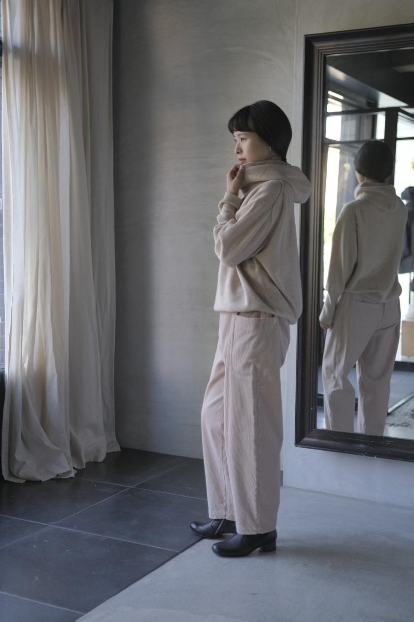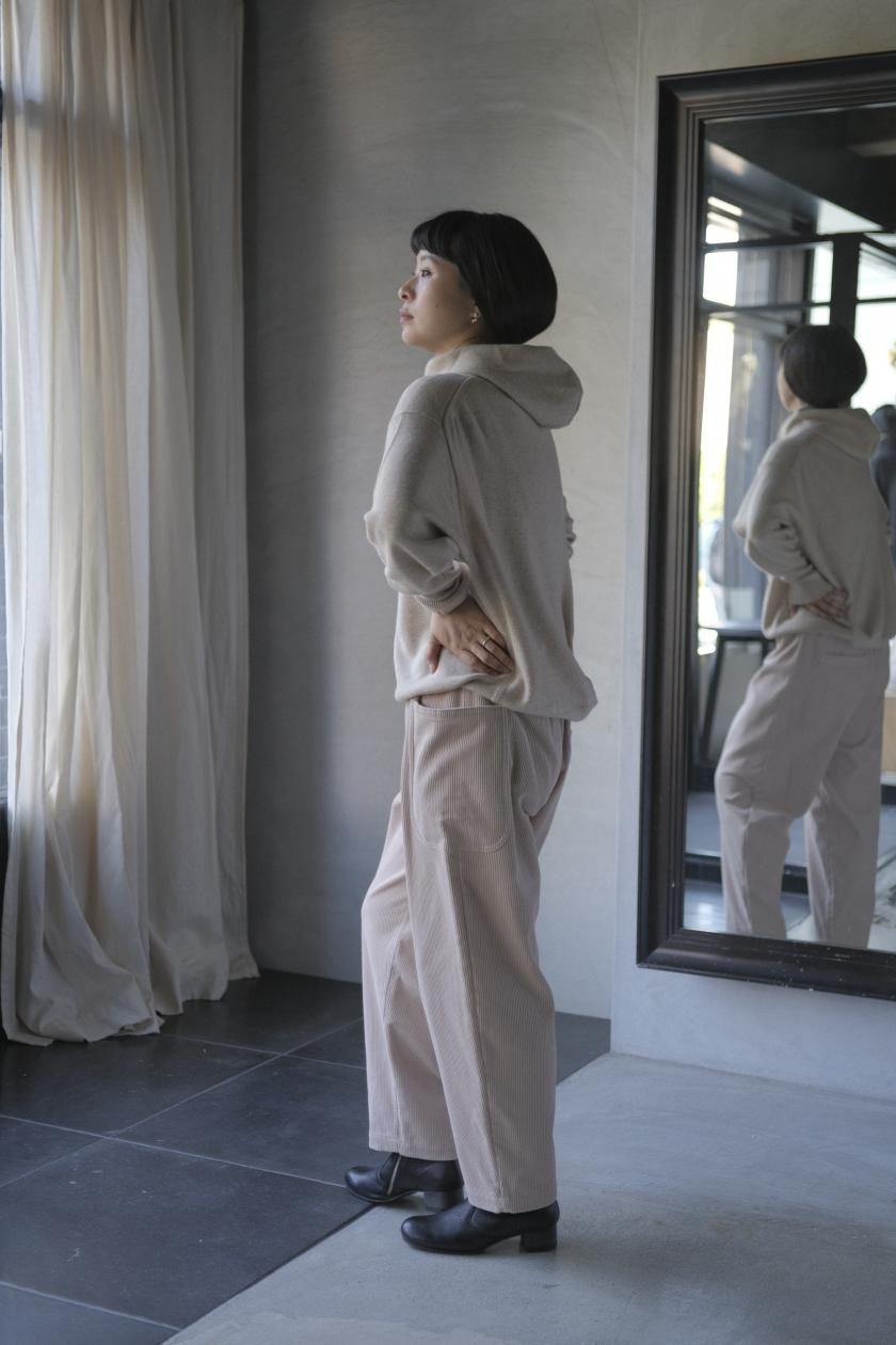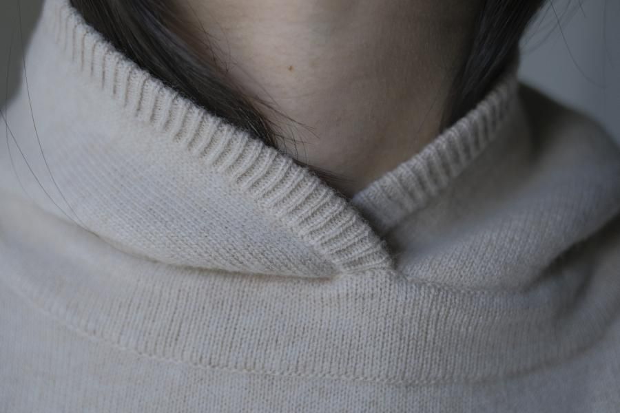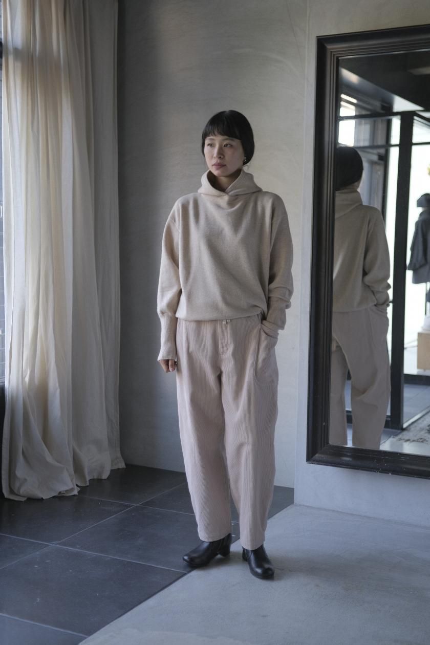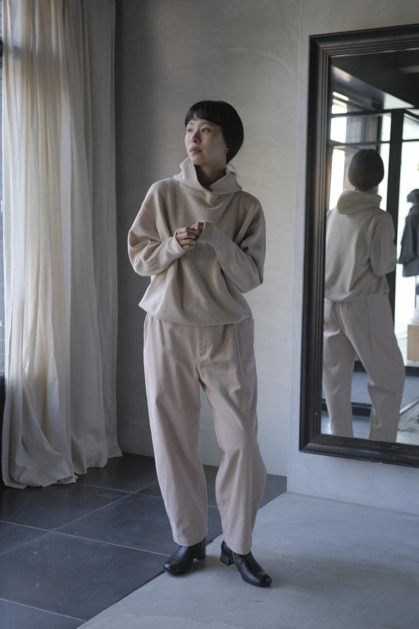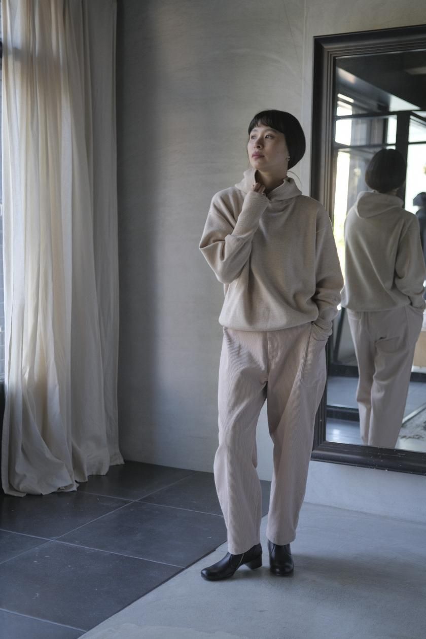 一見シンプルなデザインながら、袖のリブの長さやフードの立ち方、全体のシルエットなど、着用時に「ほかのパーカーとはちがうな」というディテールが立ち上がってくることにこだわったニットパーカーです。