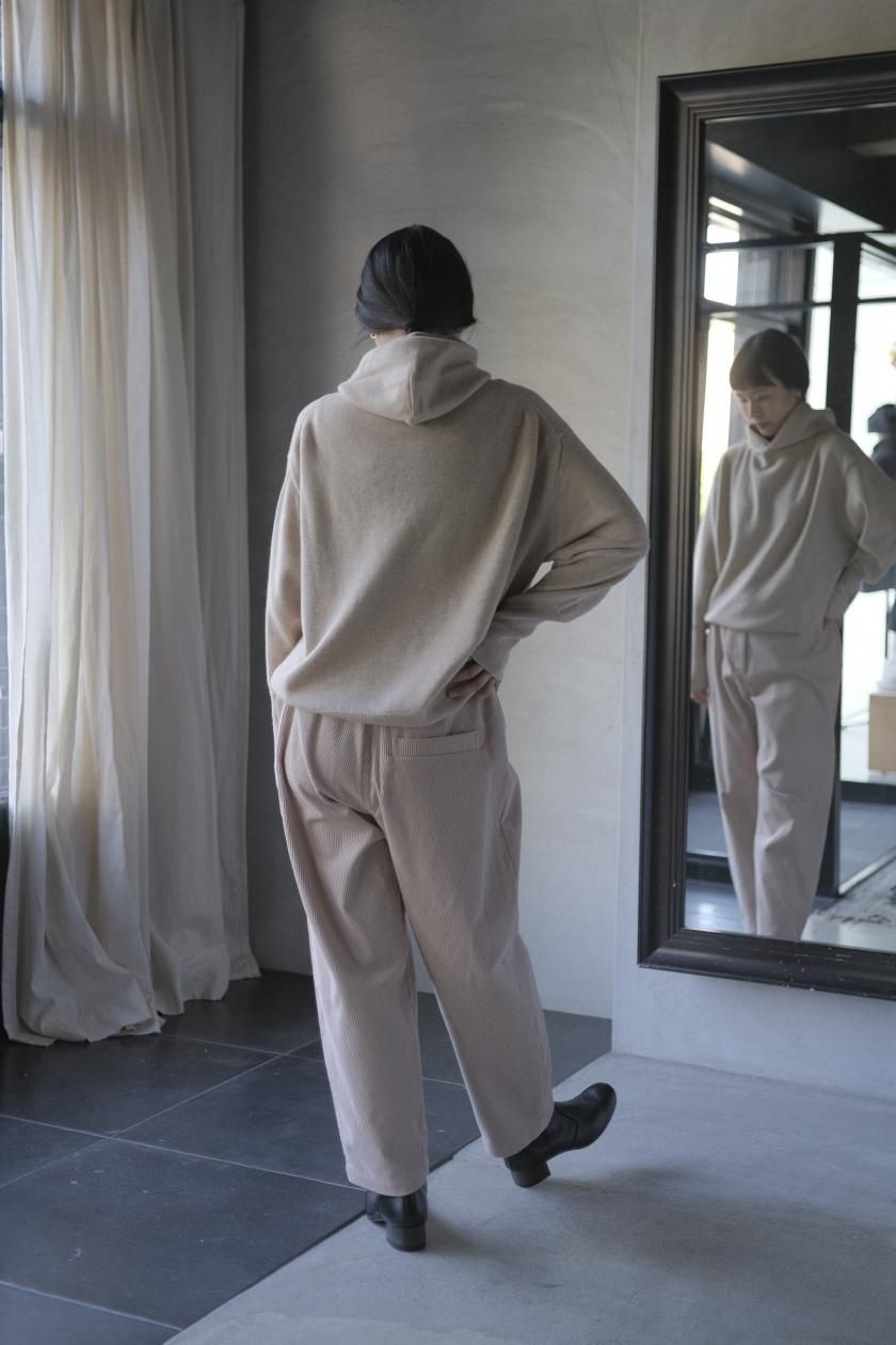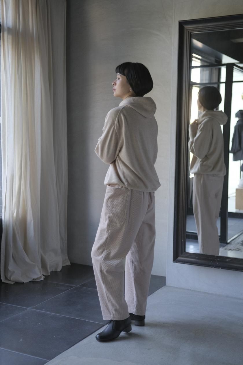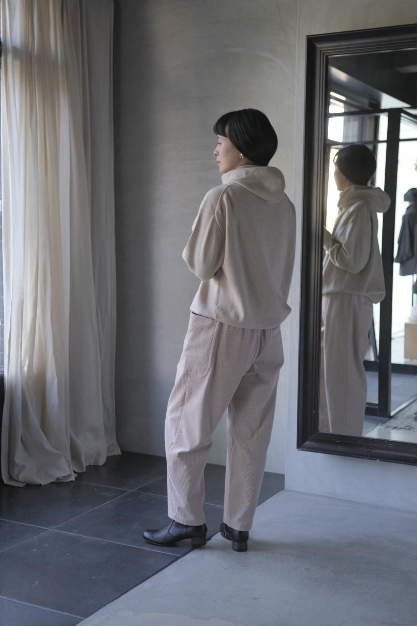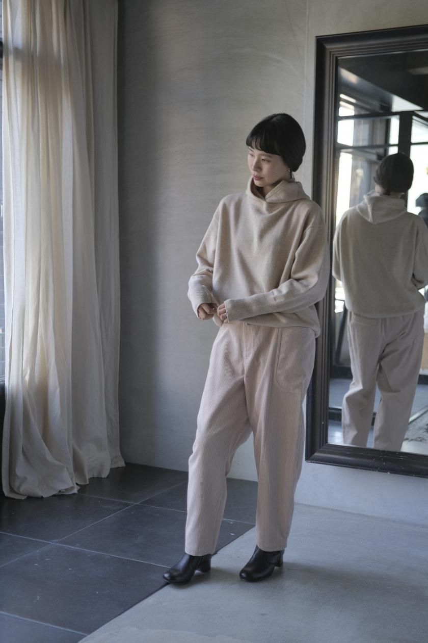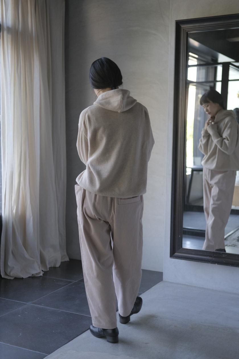 一見シンプルなデザインながら、袖のリブの長さやフードの立ち方、全体のシルエットなど、着用時に「ほかのパーカーとはちがうな」というディテールが立ち上がってくることにこだわったニットパーカーです。