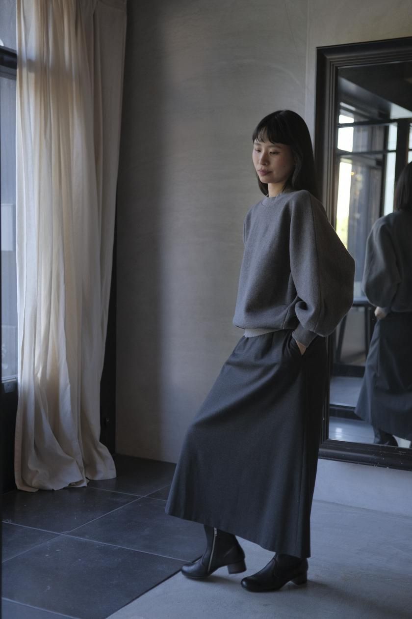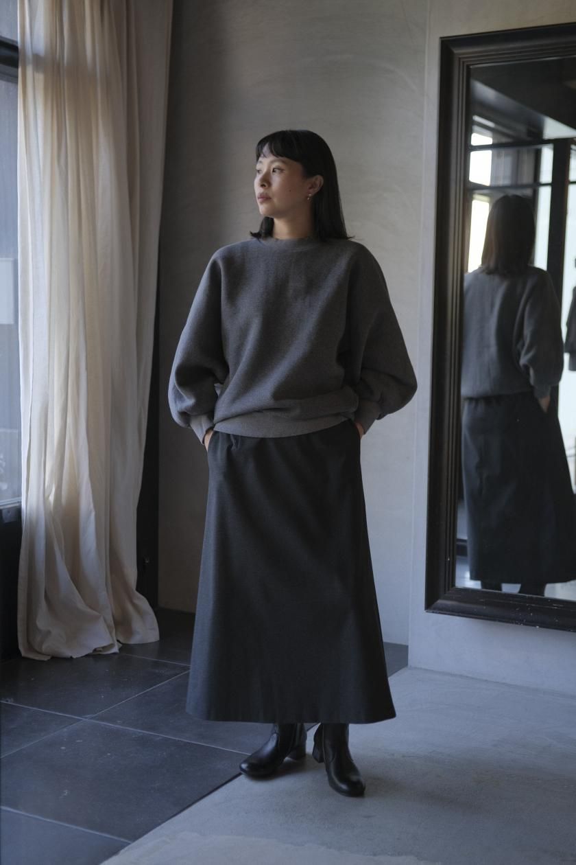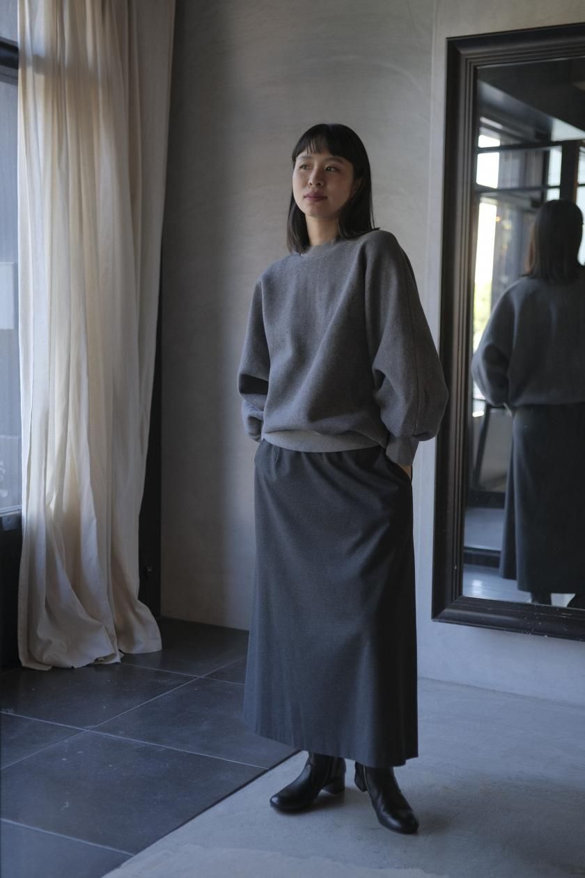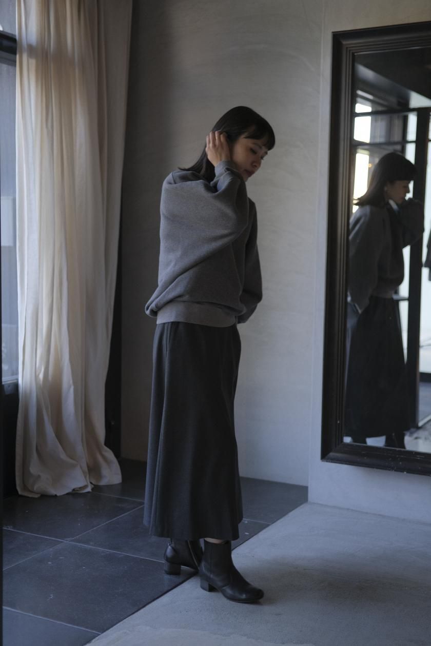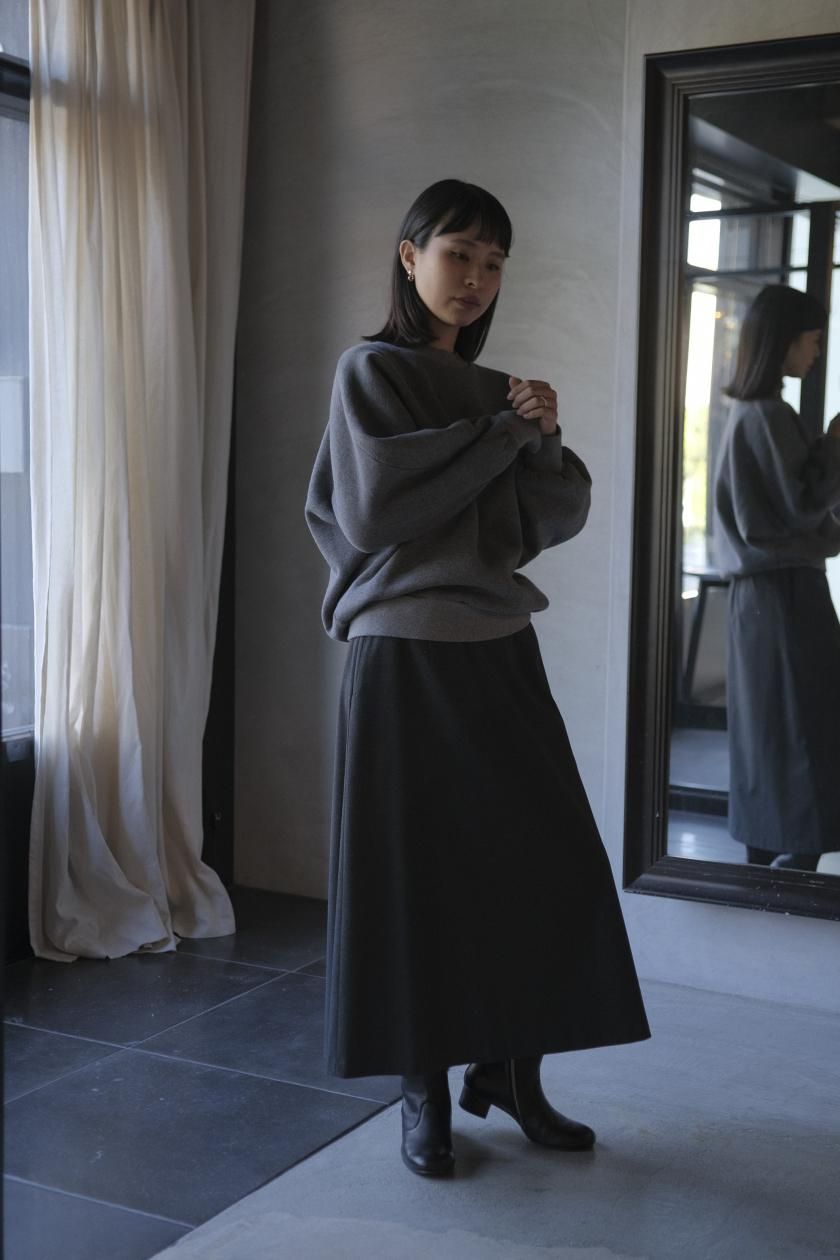 パンツはもちろん、スカートやワンピースとも相性がよく、モードな雰囲気で着こなすことができるスウェットです。