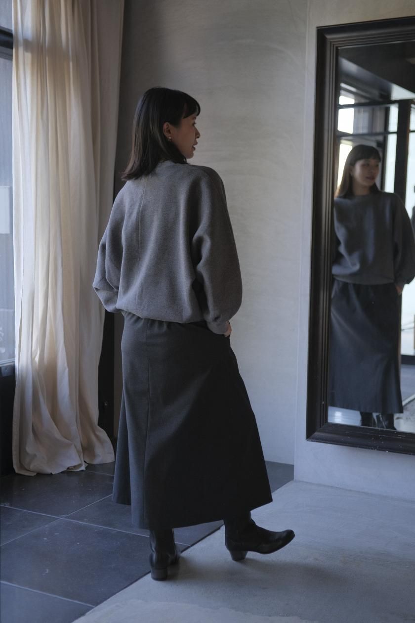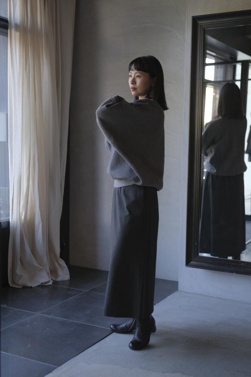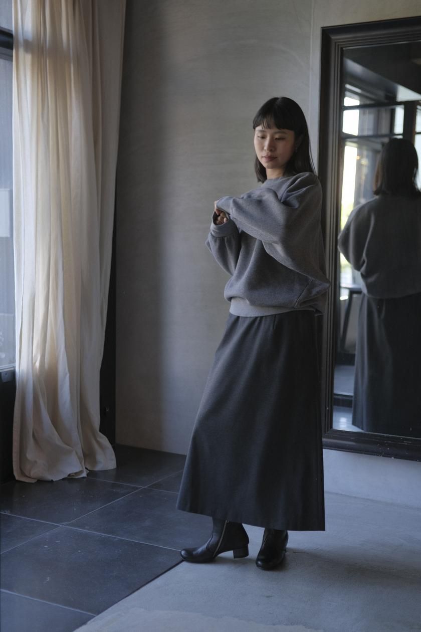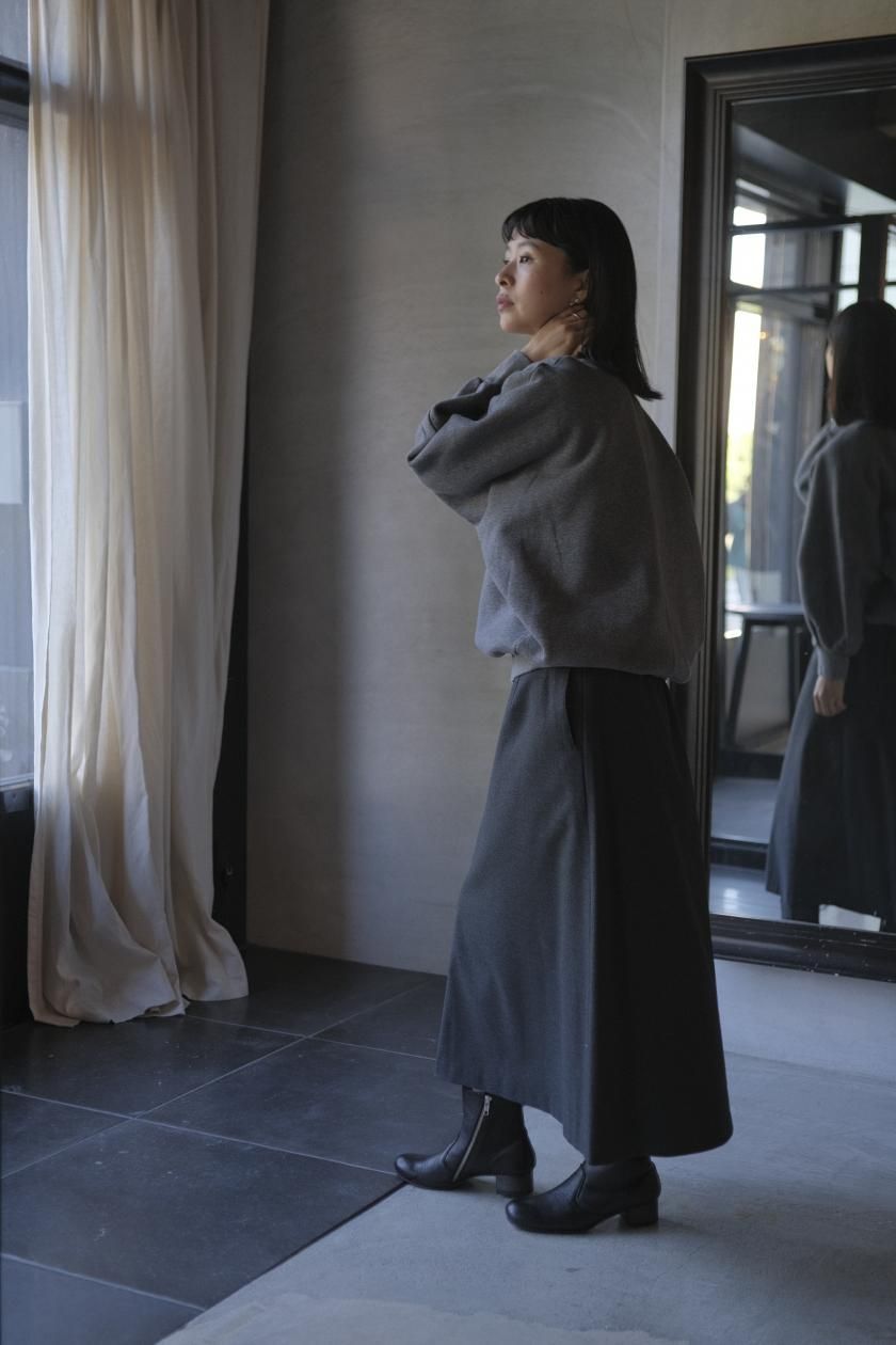 パンツはもちろん、スカートやワンピースとも相性がよく、モードな雰囲気で着こなすことができるスウェットです。
