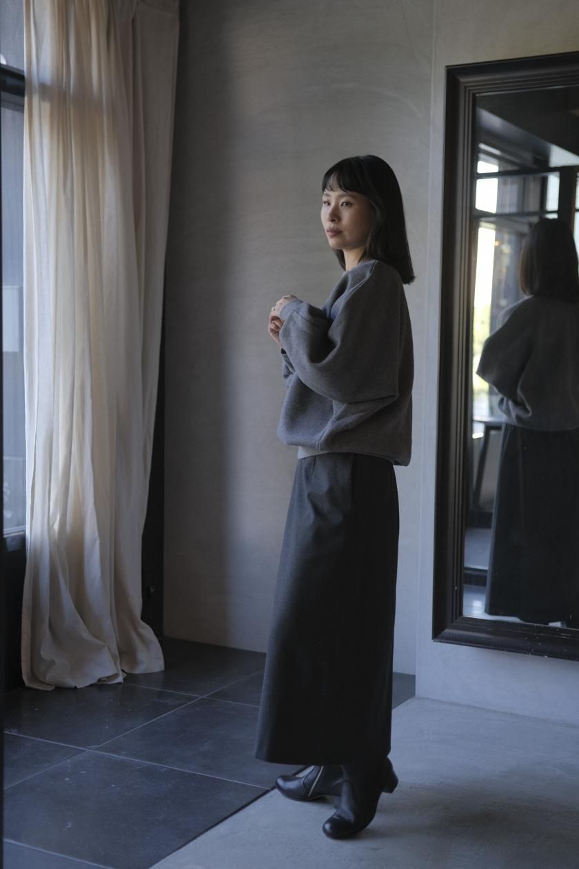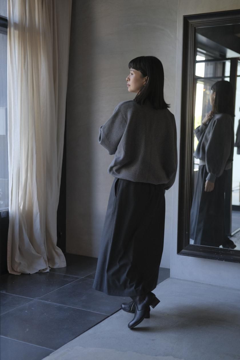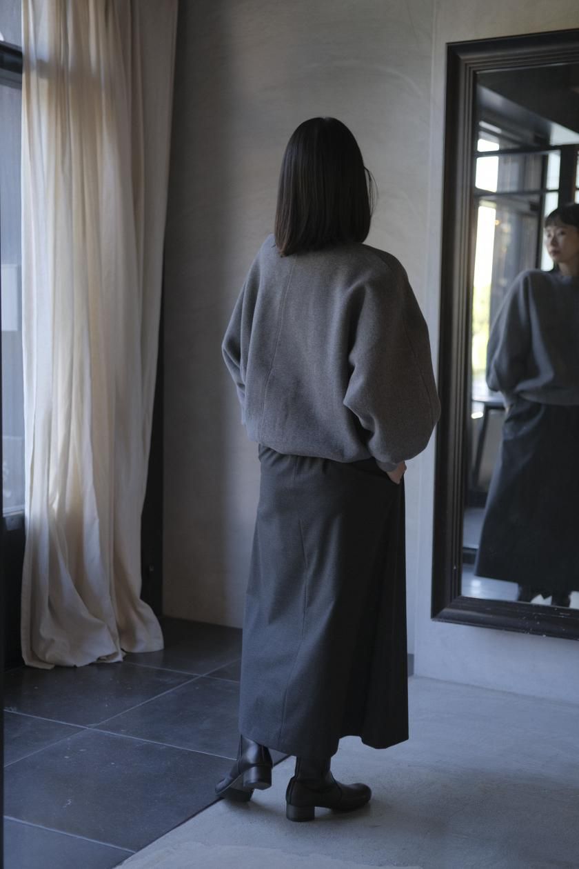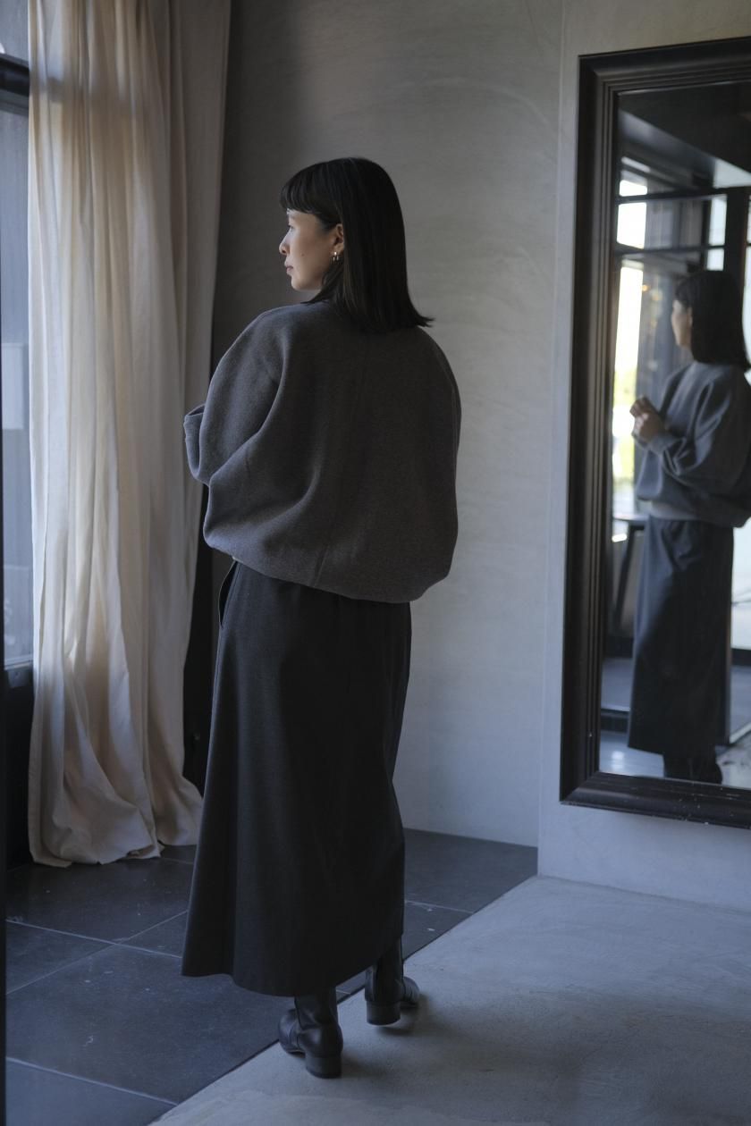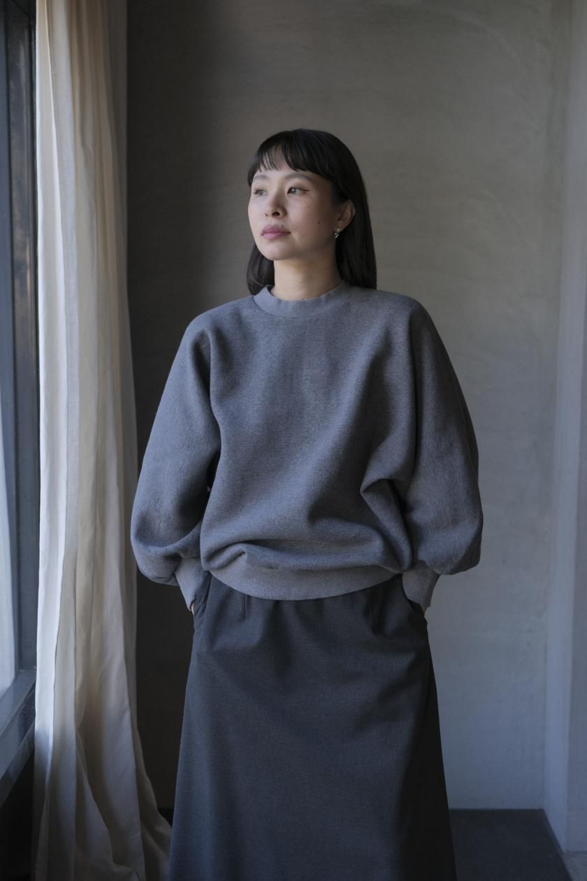 パンツはもちろん、スカートやワンピースとも相性がよく、モードな雰囲気で着こなすことができるスウェットです。
