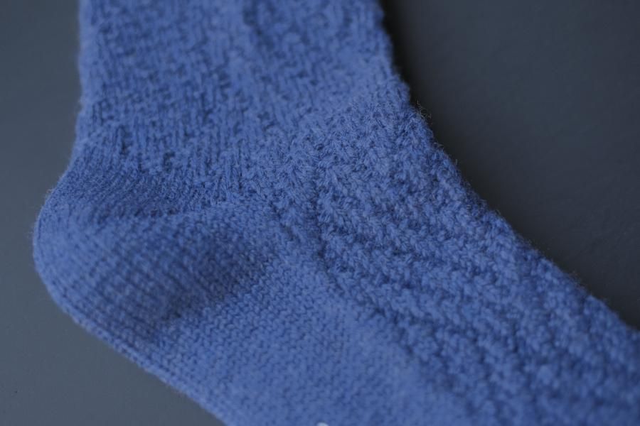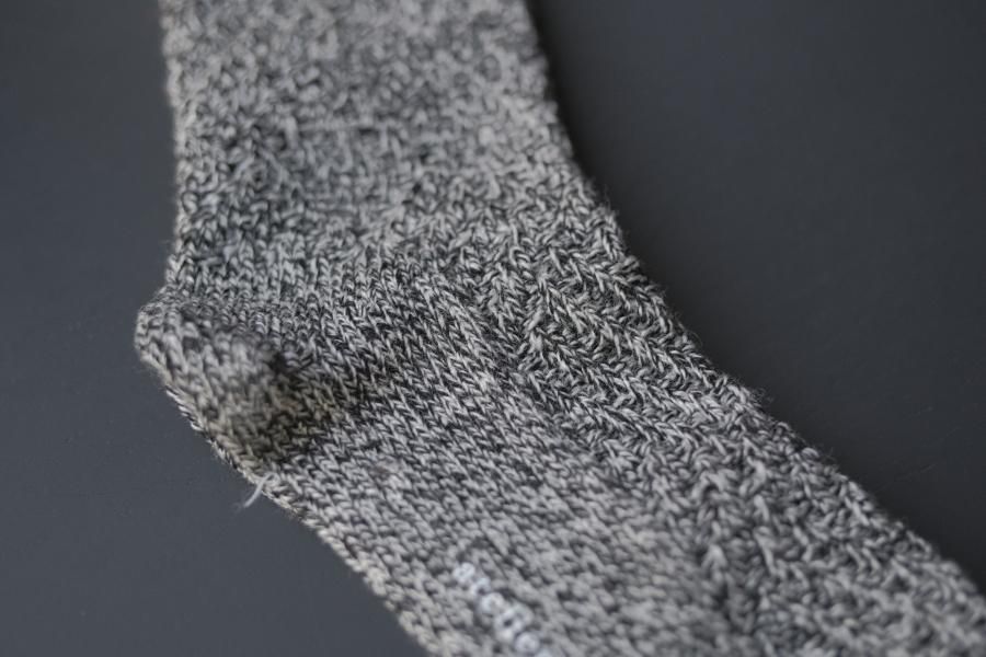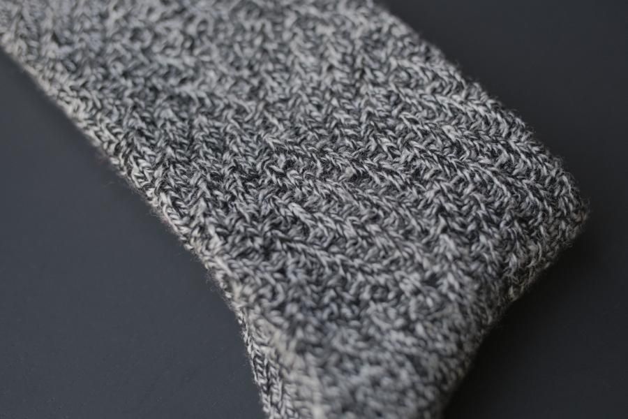 ・使用しているウール糸は、8番手の太糸。ソックスの厚みを生むローゲージで編んだ、保温性に優れるあたたかな一足に仕立てています。