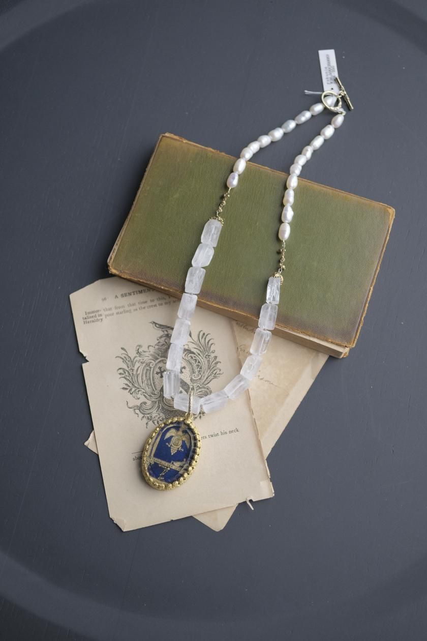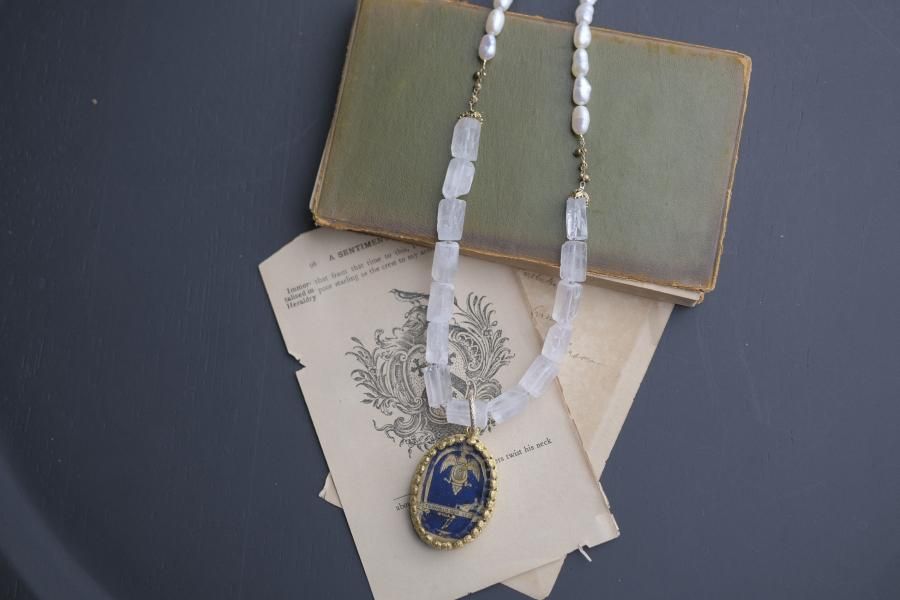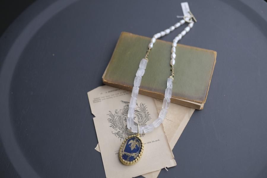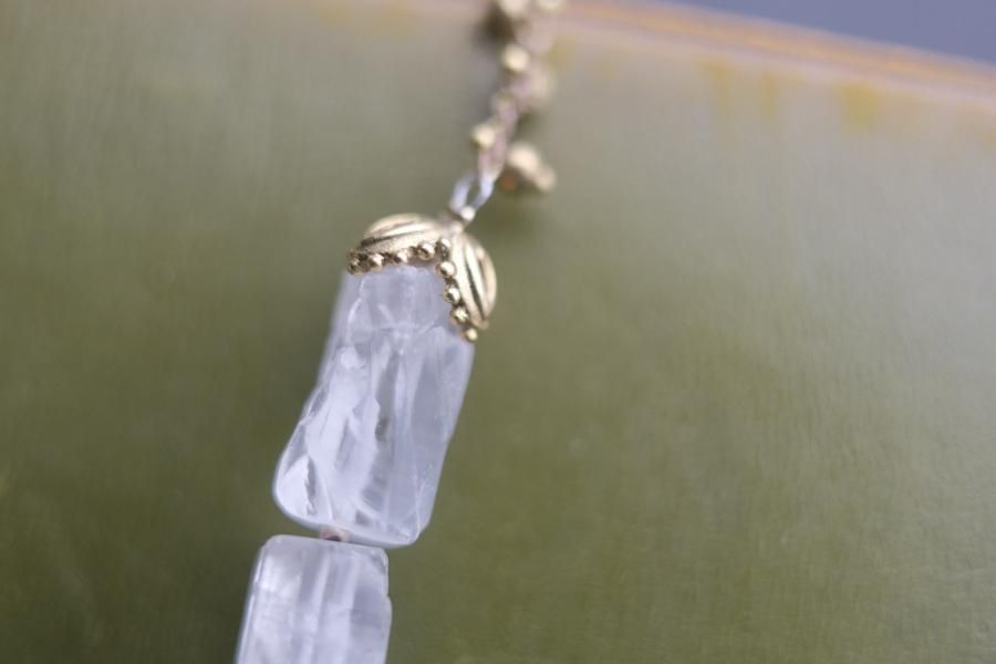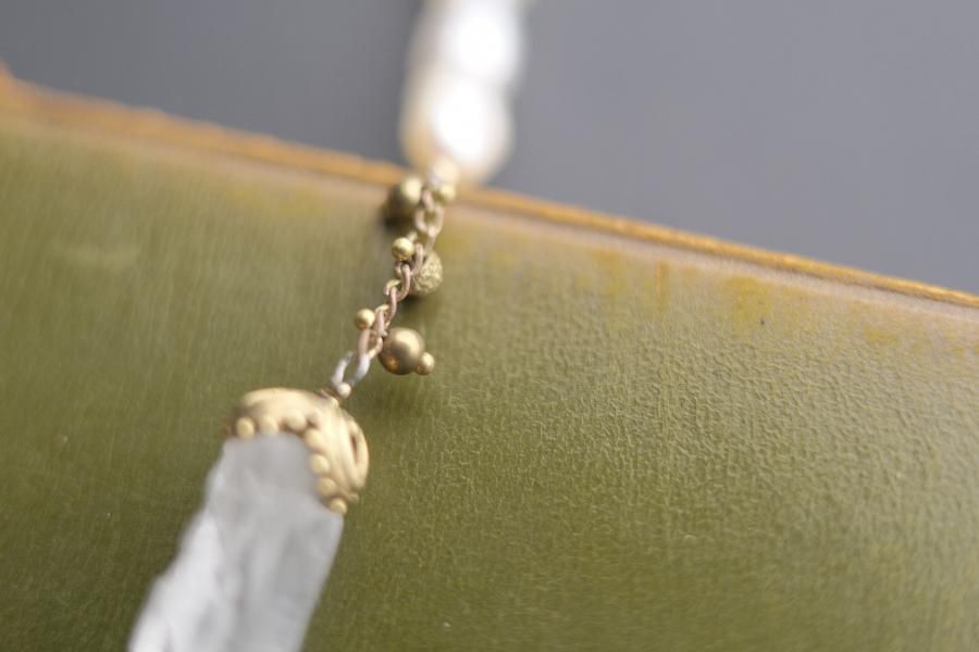 チェーンはパール、珊瑚、クォーツ(水晶)などの天然石を使用しており、